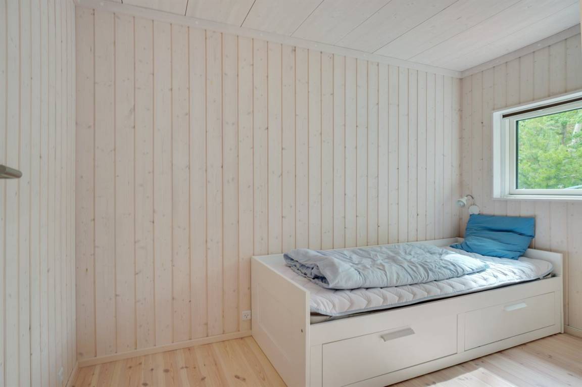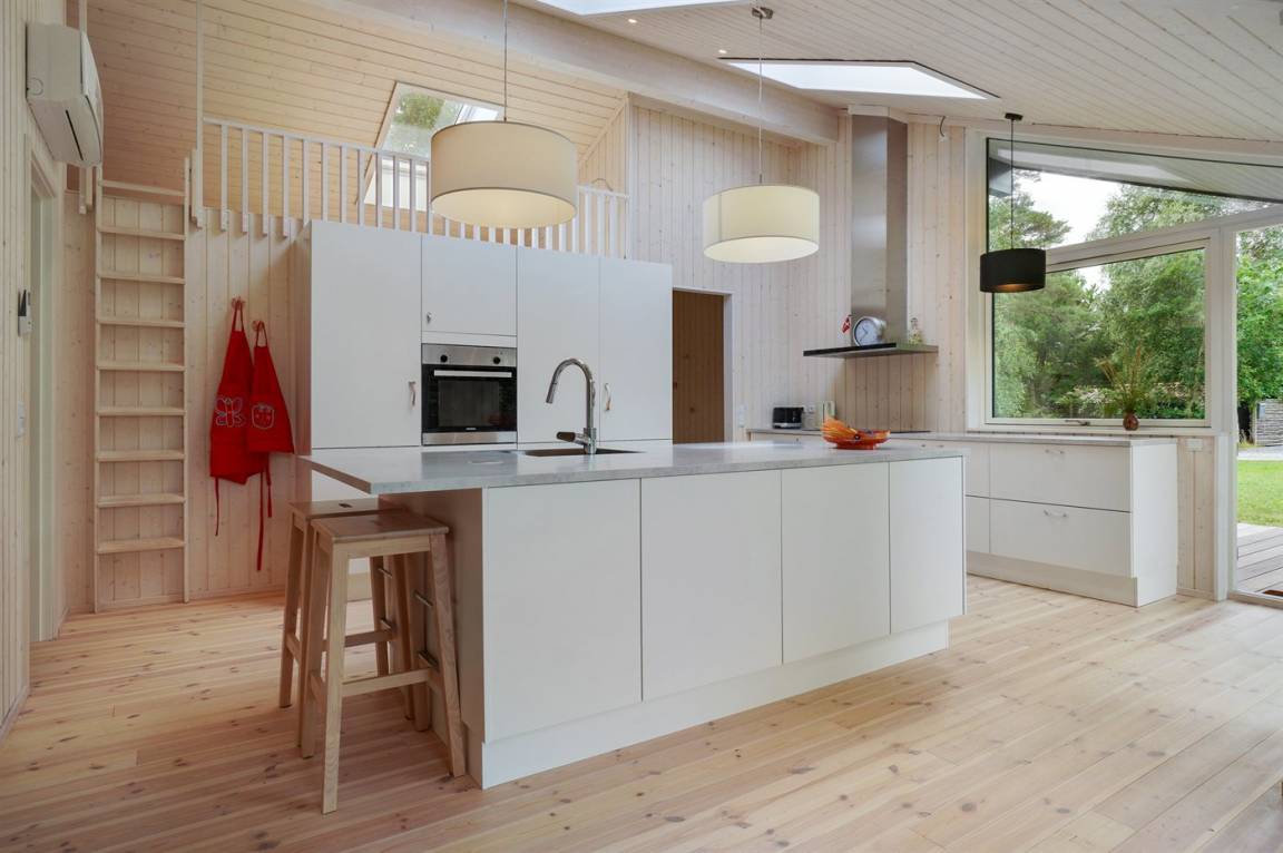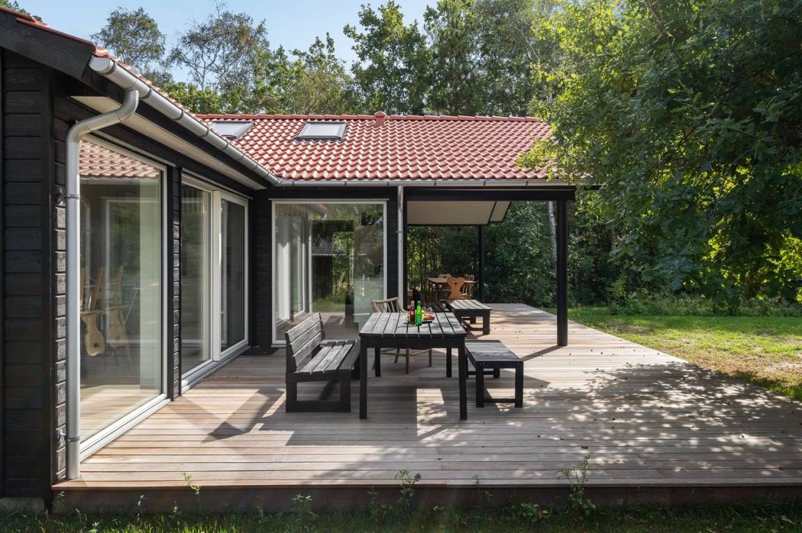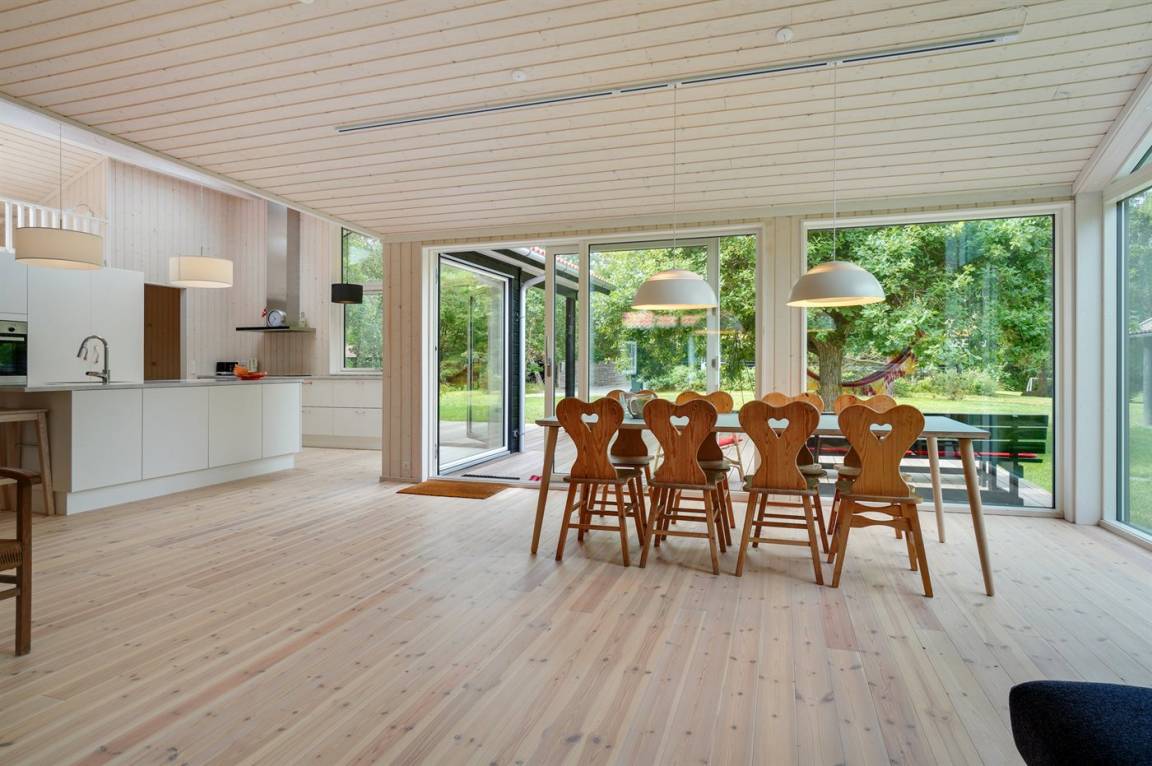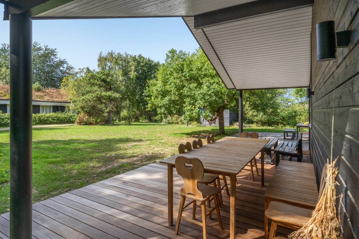 Das Haus wurde aus hellen Materialien gebaut und ist dank der großen Fensterpartien voller Licht. Die offene Küche, das Wohnzimmer und die Essecke sind in einem Bereich zusammengefasst und bilden den natürlichen Mittelpunkt des Hauses. Der Raum hat wie die meisten Räume im Haus eine hohe Decke. Dies sorgt für ein gutes Raumgefühl. Im Haus 4 gute Schlafzimmer und 1 Badezimmer mit Fußbodenheizung und Duschnische. Im Nebengebäude aus dem Jahre 2017 3 Schlafzimmer und 1 Badezimmer, ebenfalls mit Fußbodenheizung und Duschnische. Von 2 Schlafzimmern im Nebengebäude direkter Zugang zum Badezimmer des Nebengebäudes. Das Haus ist ringsherum von einer großen Holzterrasse umgeben, die teilweise überdacht ist. Zum Haus gehört auch die sogenannte „Waldhütte", die als kleines Büro eingerichtet ist.