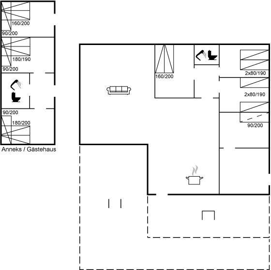 SchlafverhältnisseDie Schlafplätze verteilen sich auf 7 Schlafräume. 6 Schlafplätze in Doppelbetten. 2 Schlafplätze in Einzelbetten. 4 Schlafplätze in Etagenbetten. 2 Schlafplätze auf einer Doppelschlafcouch. 6 von diesen Schlafplätzen befinden sich im Gästehaus.
