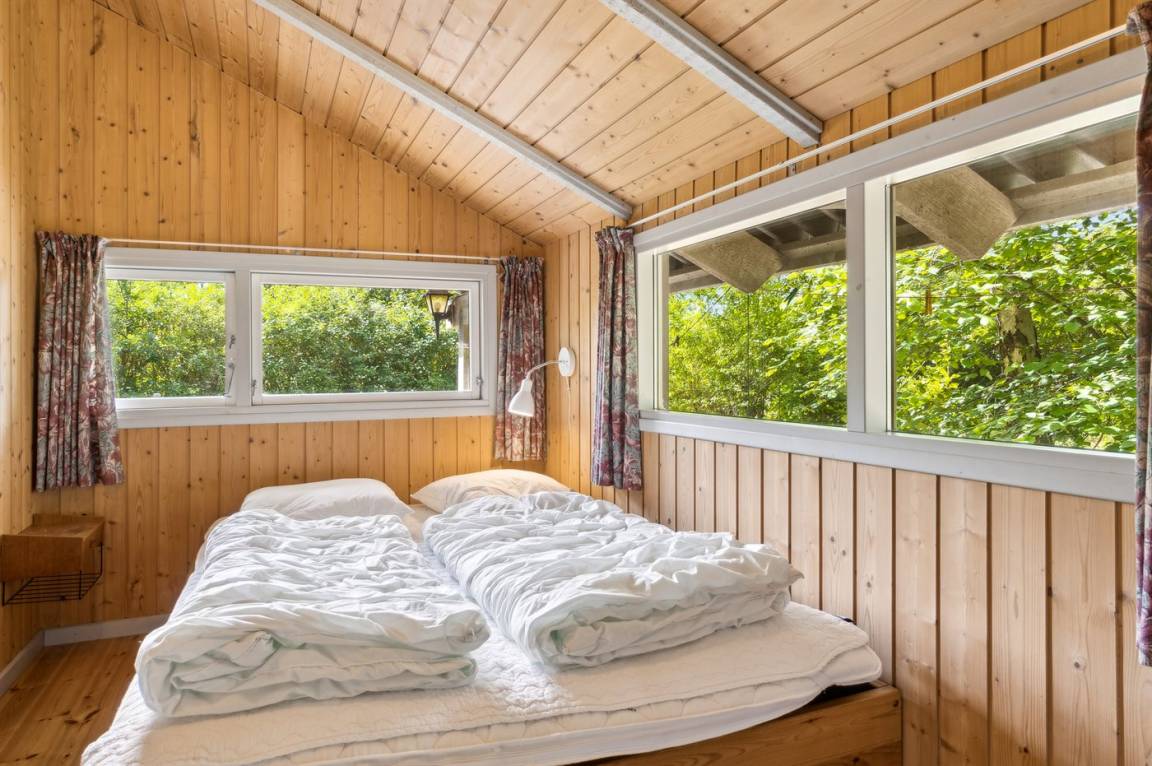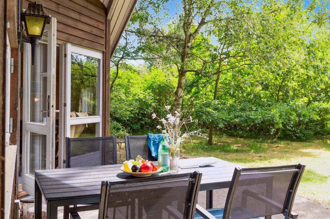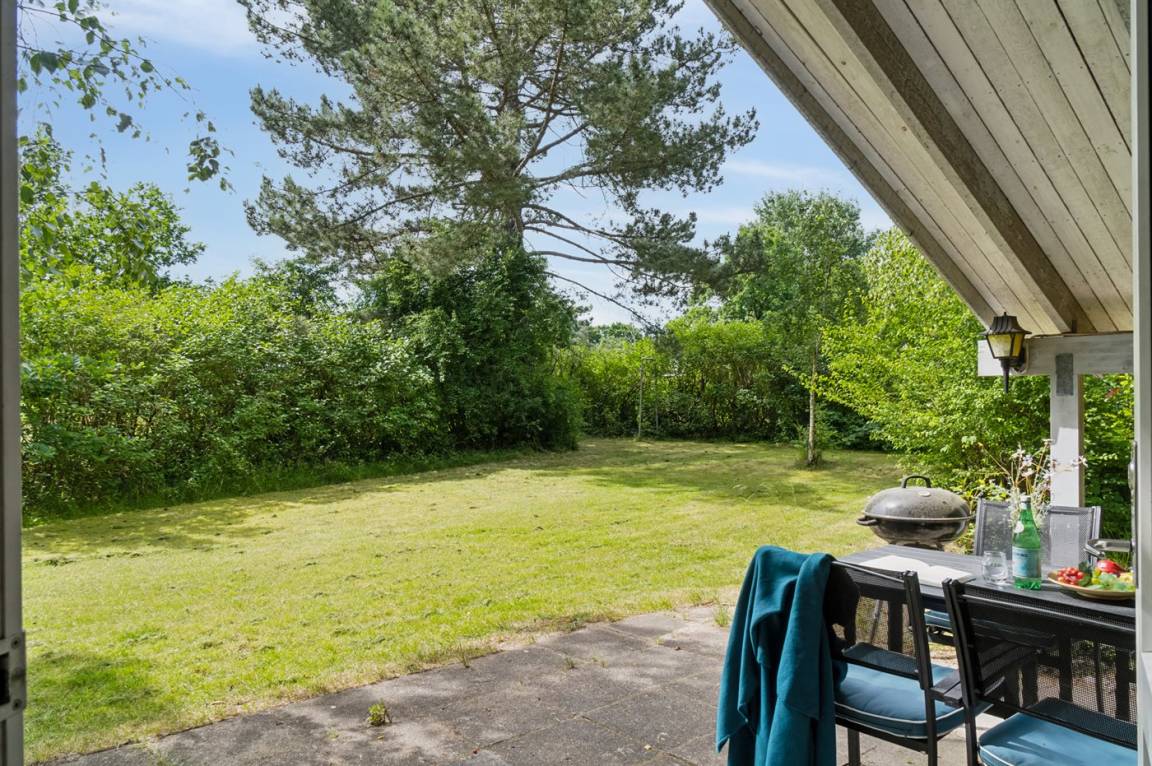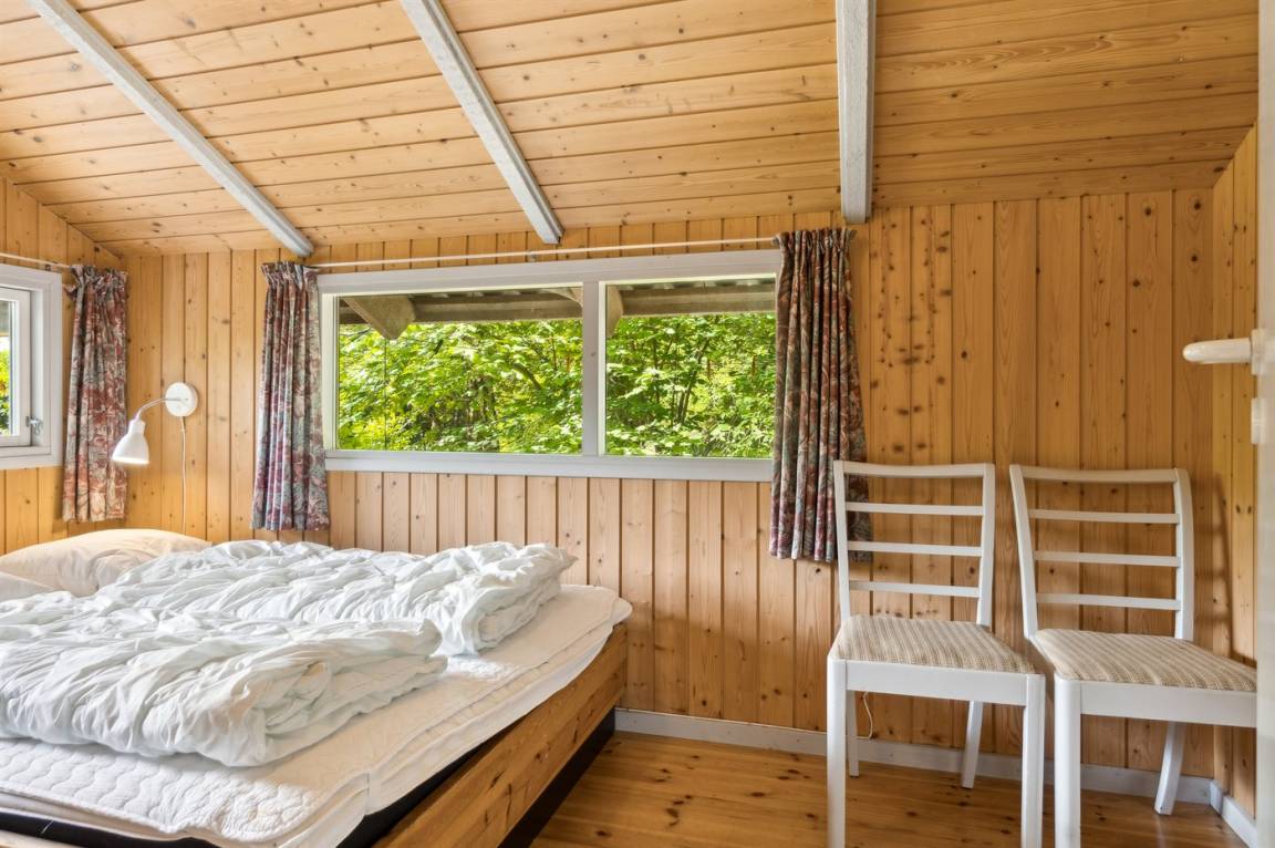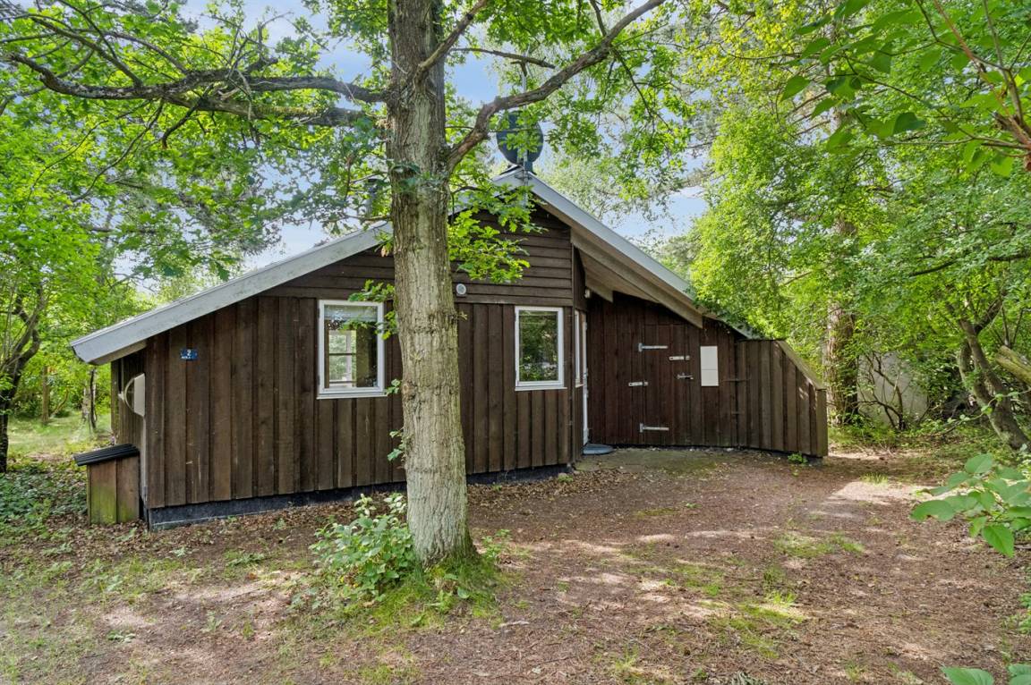 Gemütliches Ferienhaus auf einem ungestörten Naturgrundstück mit Rasen und vielen großen Bäumen gelegen.