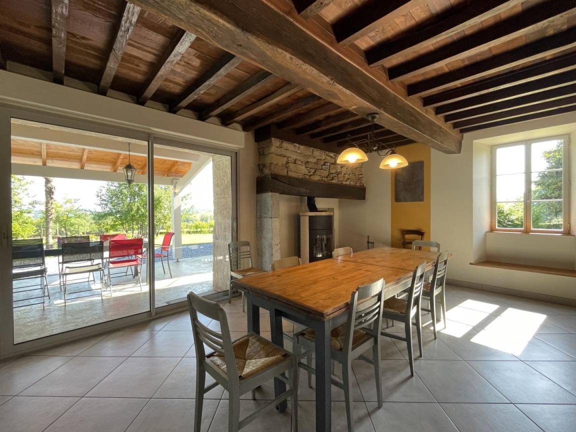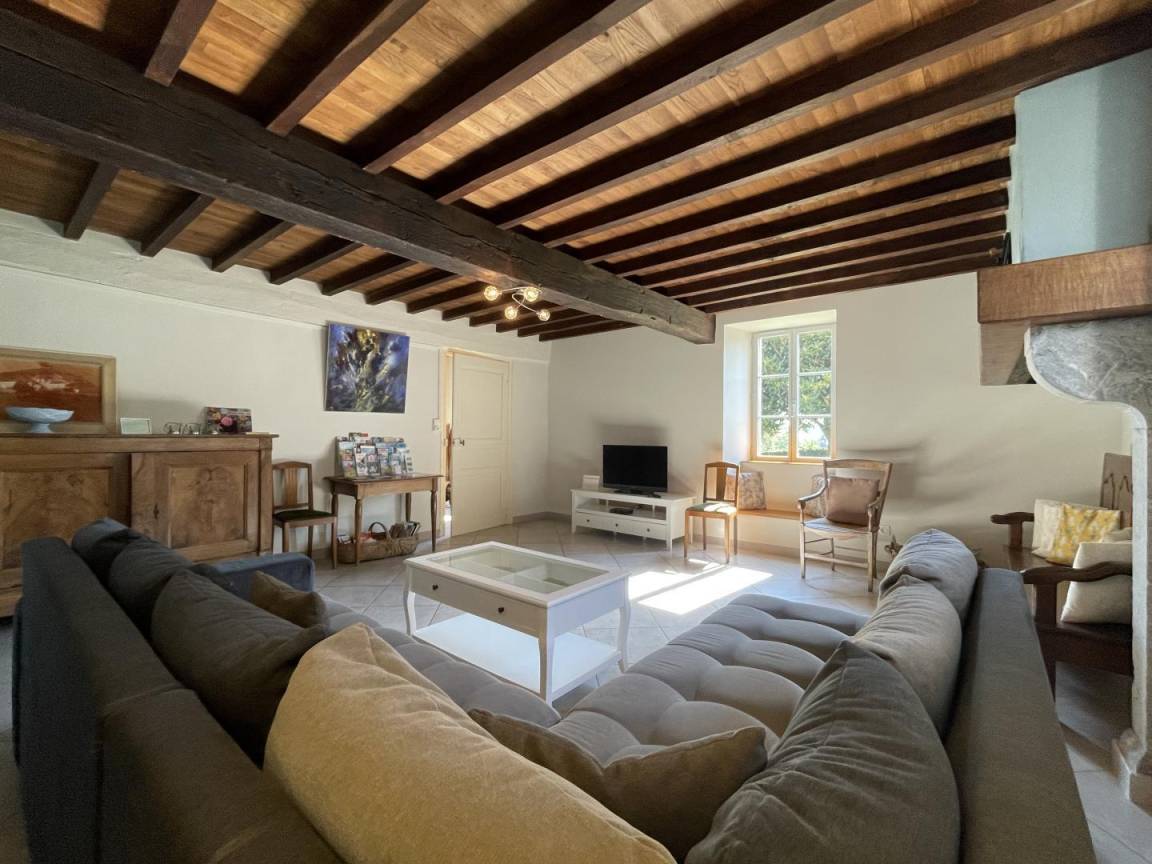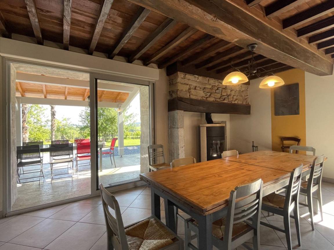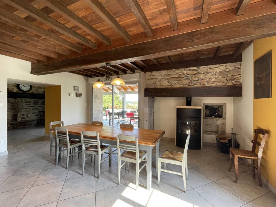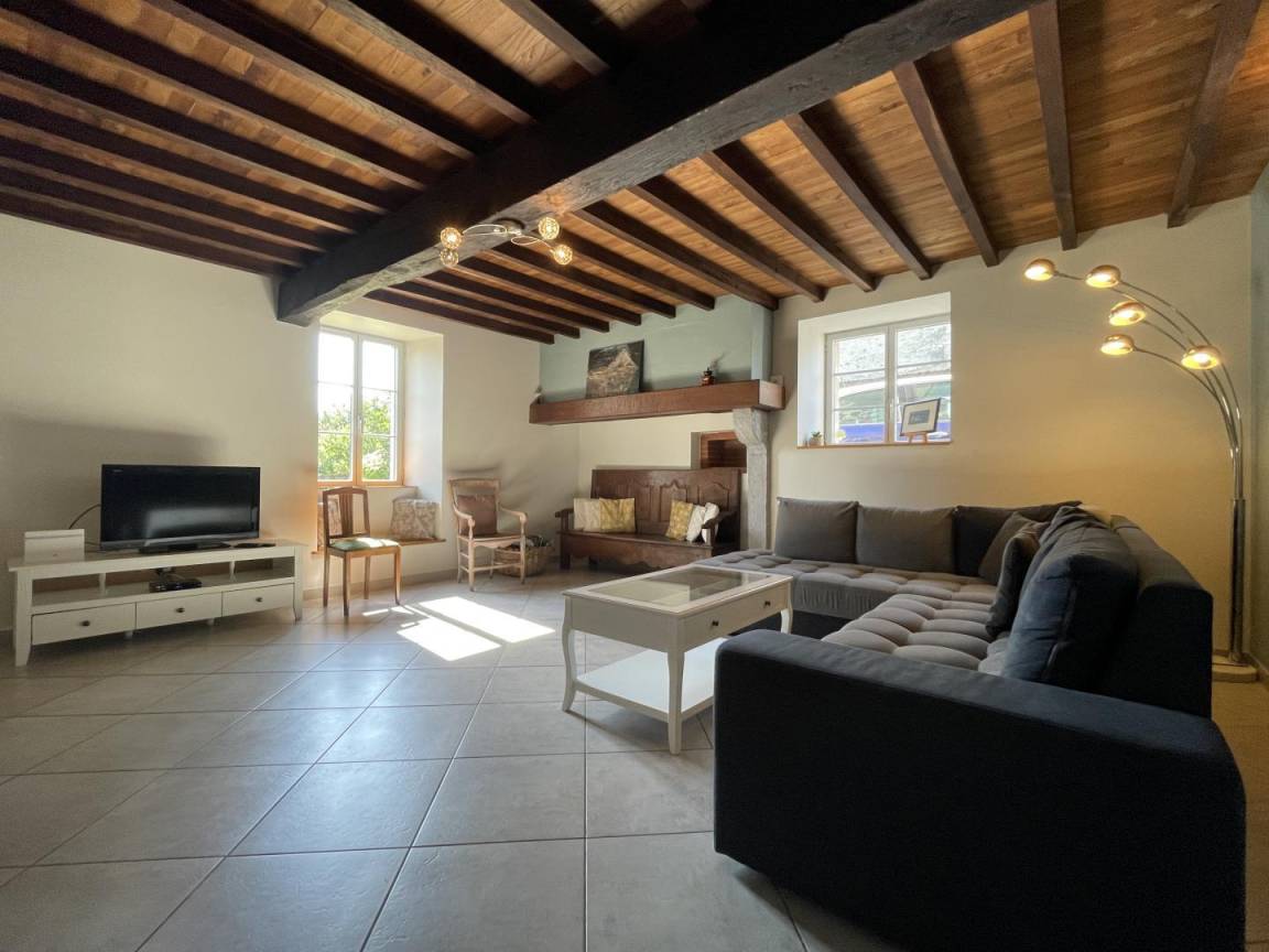 Wohnzimmer (TV, WLAN-Internetbox). Wohnzimmer (mit Holzofen) mit Ausgang auf eine überdachte Terrasse.