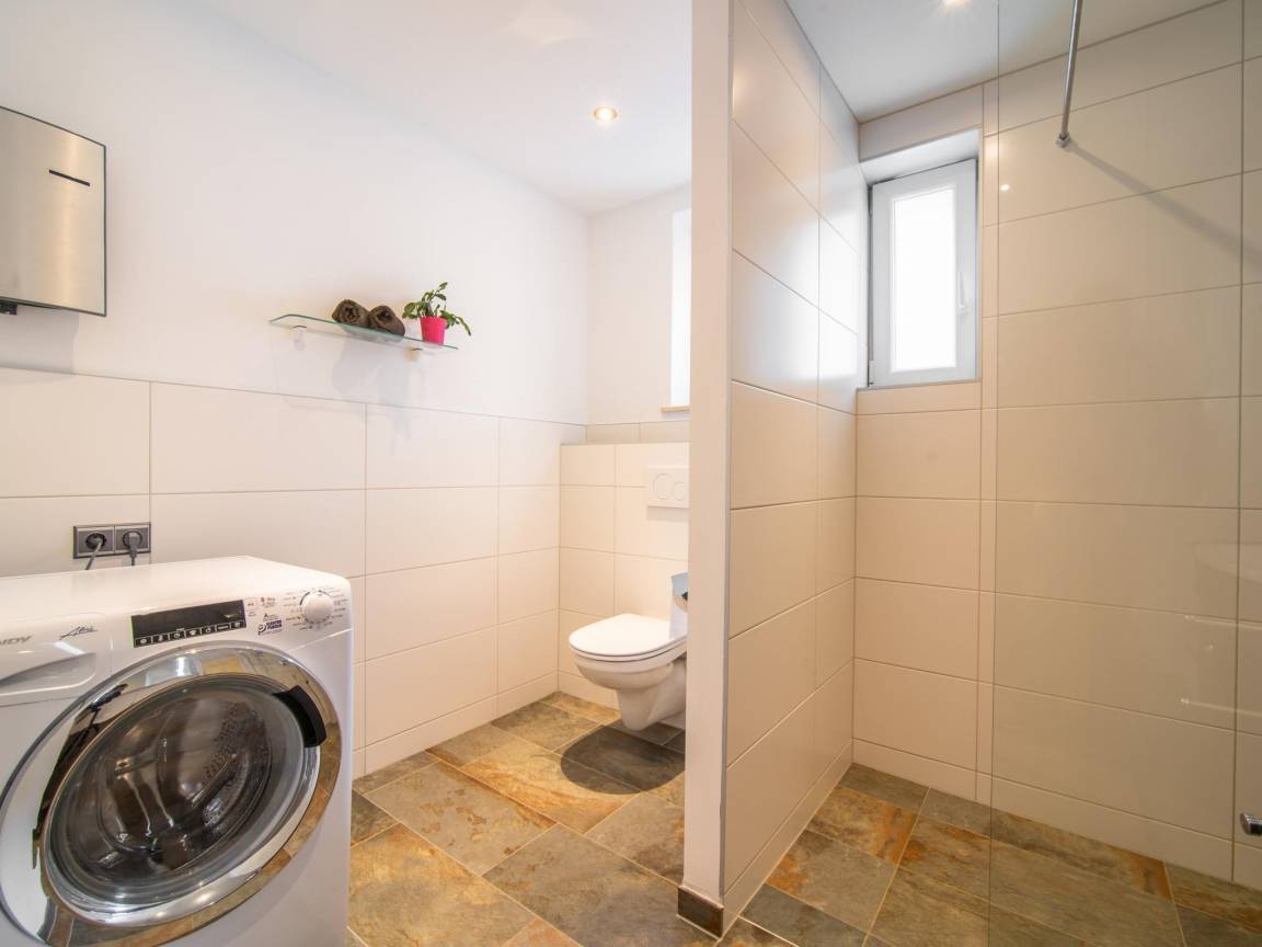 Layout : Parterre: Wohnzimmer mit TV(Flatscreen, Satellit), Sitzecke , Wohnküche mit Esstisch, Sitzecke, Wasserkocher, Kochherd(4 Kochplatten, Ceranfeld), Kaffeemaschine, Backofen, Geschirrspüler, Kühlschrank , Schlafzimmer mit Doppelbett, Balkon oder Terrasse , Badezimmer mit Dusche, Waschbecken, Toilette, Waschmaschine , Abstellraum mit Kühl-/Gefrierkombination
