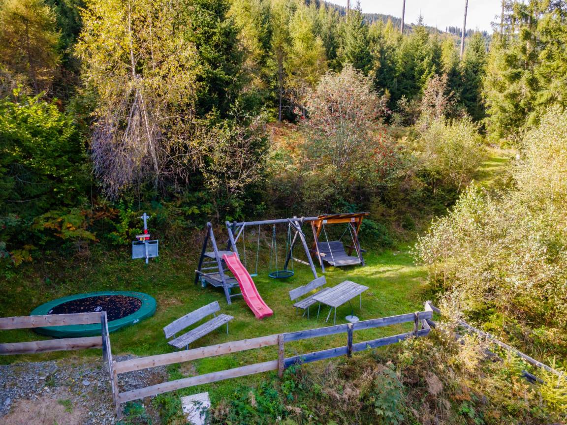 Um beide Chalets herum gibt es mehrere Terrassen und einen Spielplatz für Kinder.