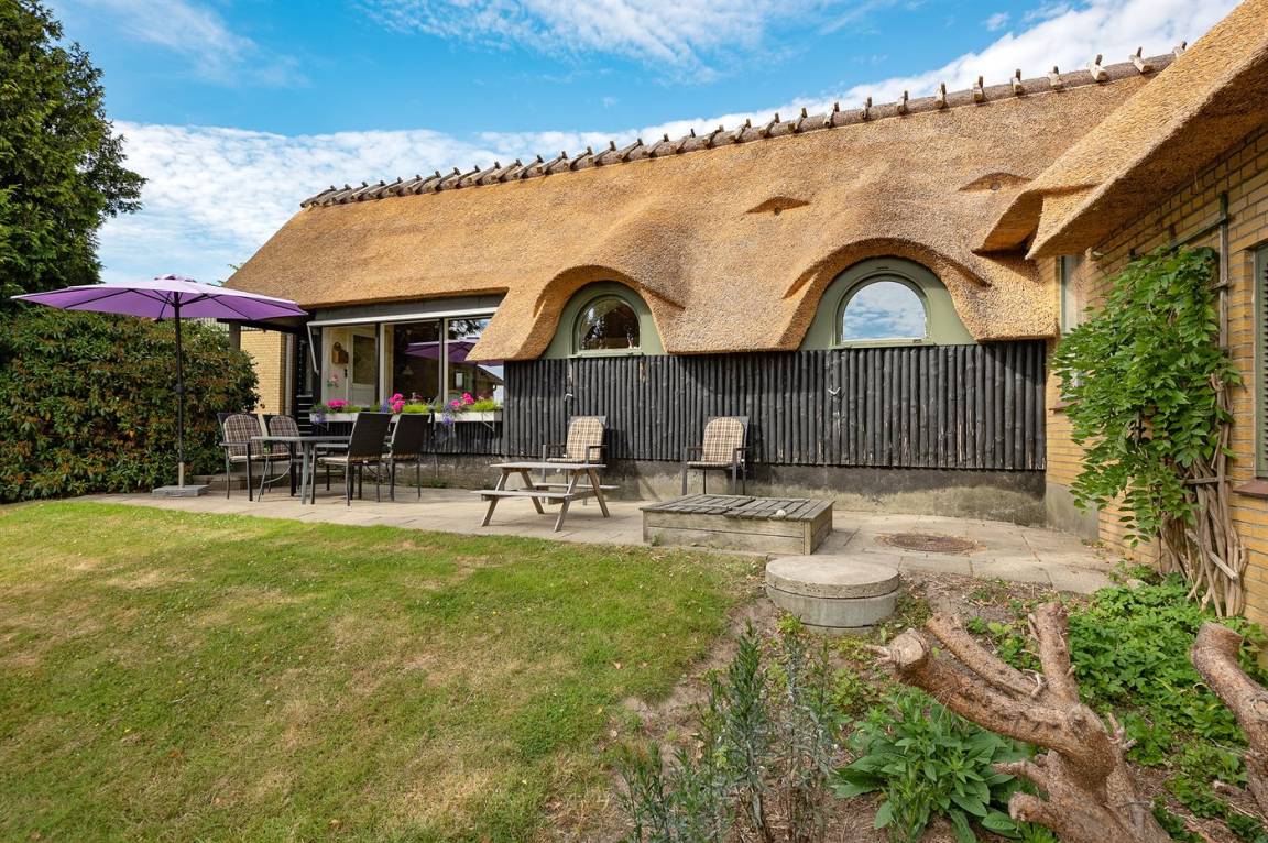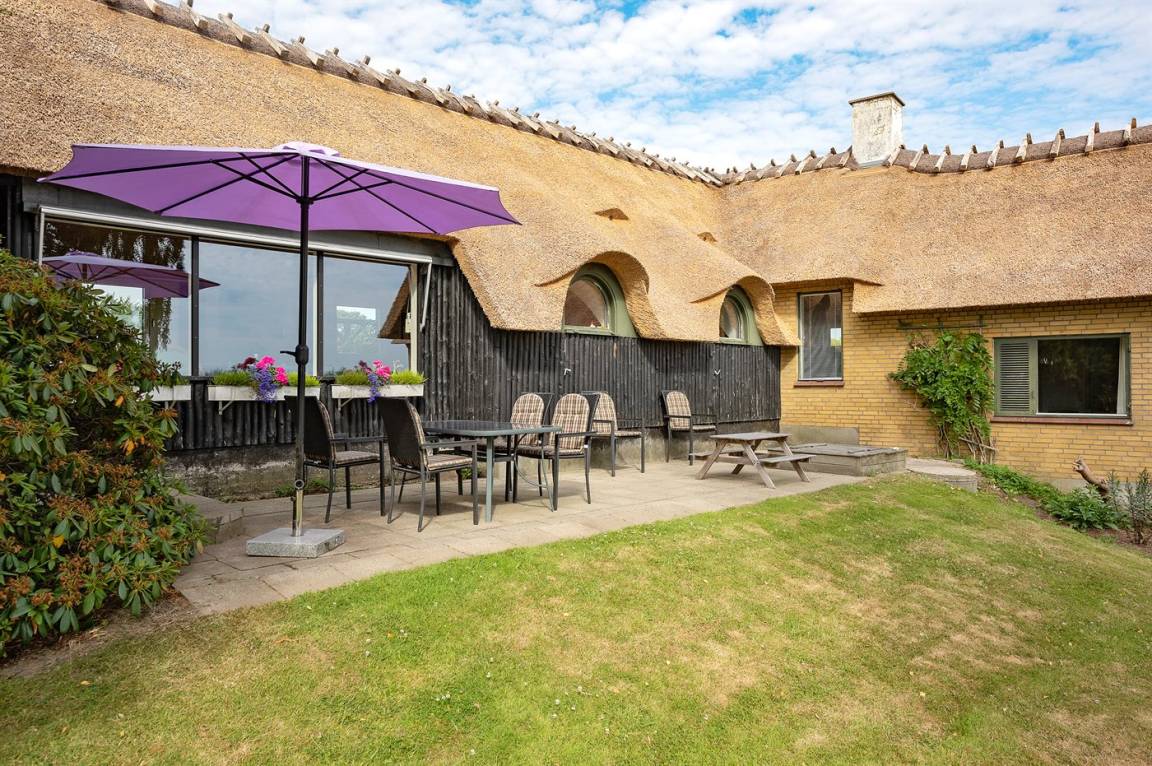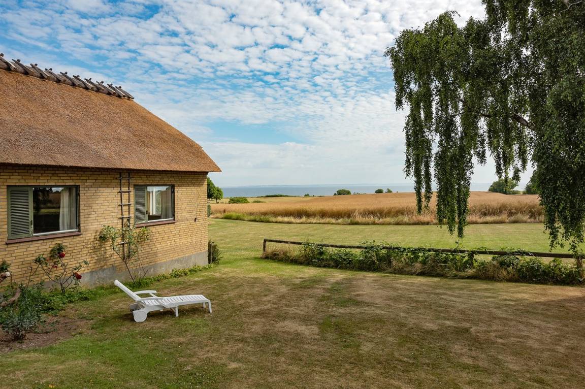 Ein schönes Ferienhaus mit Reetdach, 1968 gebaut und laufend renoviert. Das Haus liegt auf einem großen, schönen Natur/Gartengrundstück in ruhiger, ländlicher Umgebung nur 250 m vom Meer entfernt und mit Panoramablick von Haus und Grundstück. Vor dem Haus gibt es einen großen Rasen, perfekt für Aktivitäten im Freien. Gute Terrasse mit Gartenmöbeln sowie Weber-Kugelgrill.