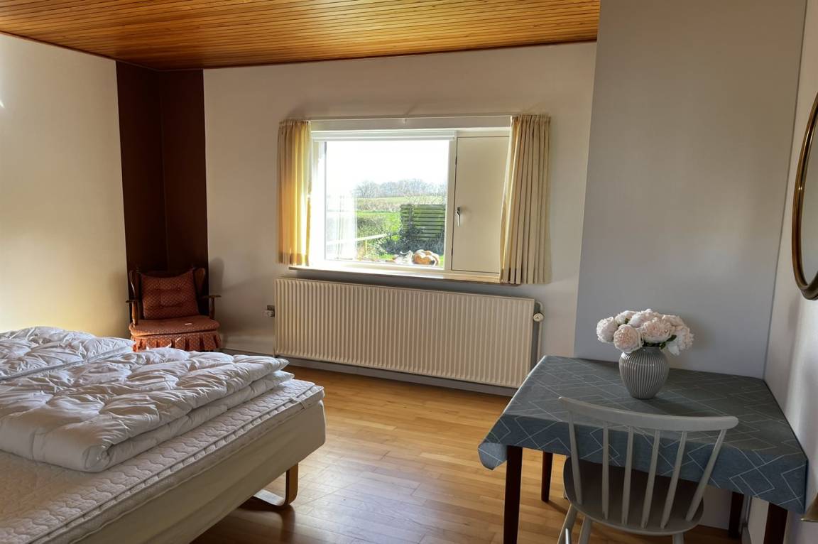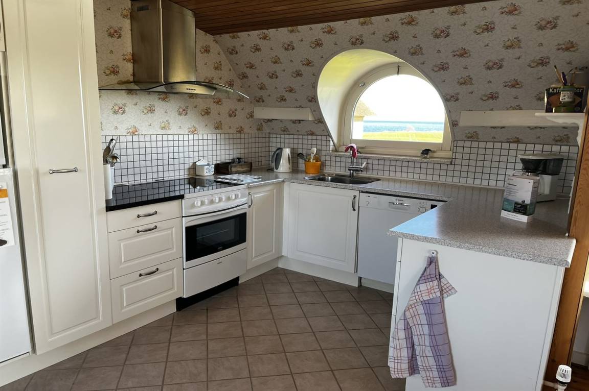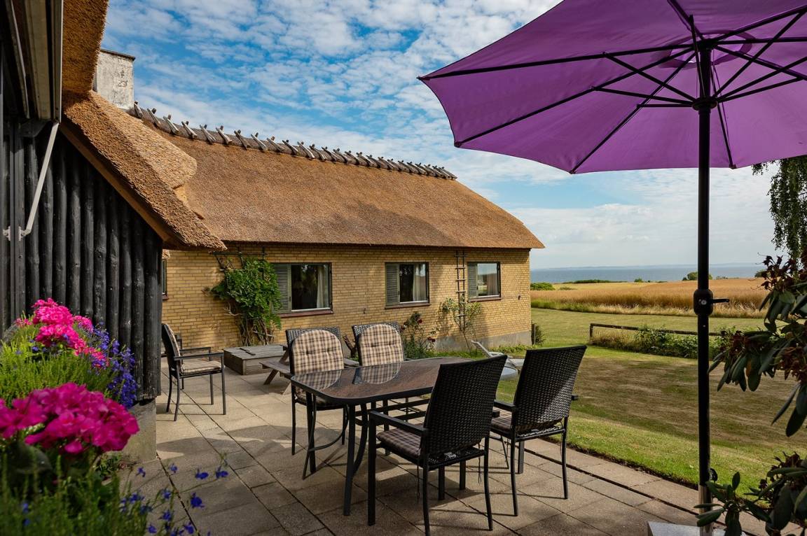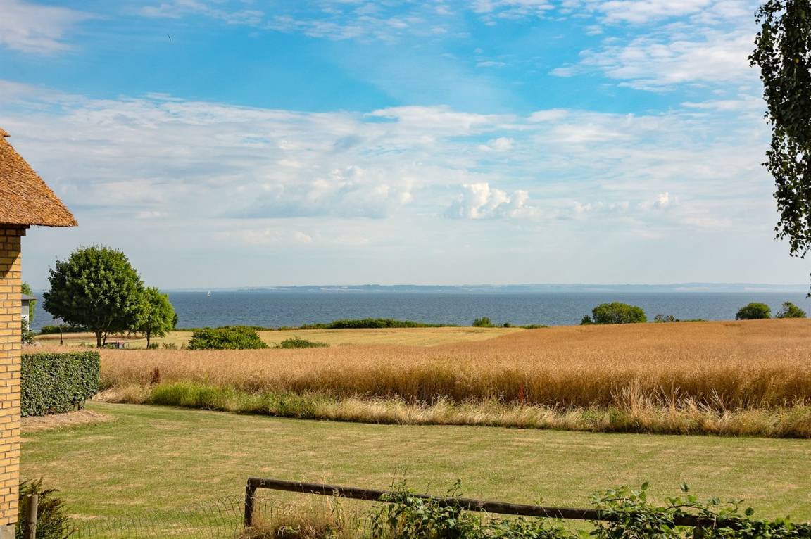 Ein schönes Ferienhaus mit Reetdach, 1968 gebaut und laufend renoviert. Das Haus liegt auf einem großen, schönen Natur/Gartengrundstück in ruhiger, ländlicher Umgebung nur 250 m vom Meer entfernt und mit Panoramablick von Haus und Grundstück. Vor dem Haus gibt es einen großen Rasen, perfekt für Aktivitäten im Freien. Gute Terrasse mit Gartenmöbeln sowie Weber-Kugelgrill.