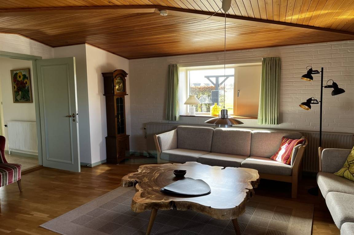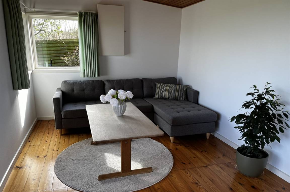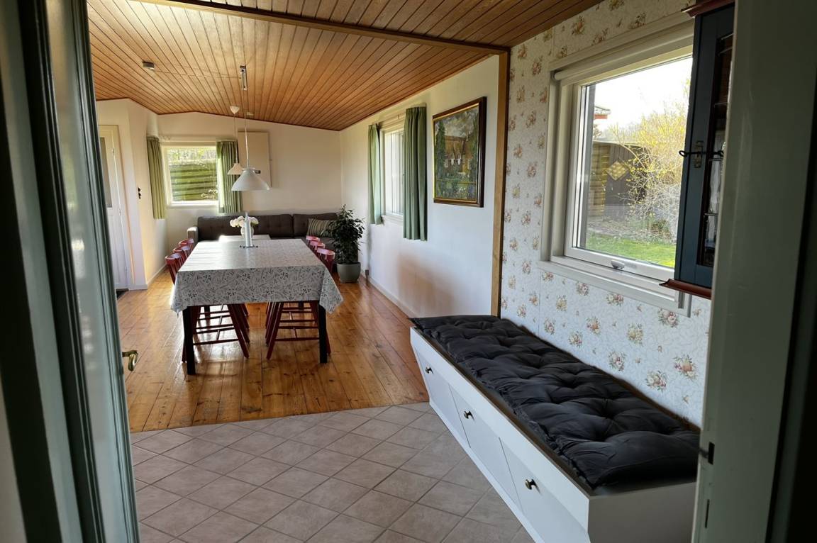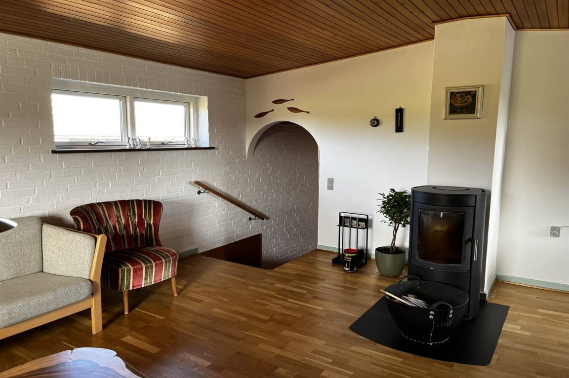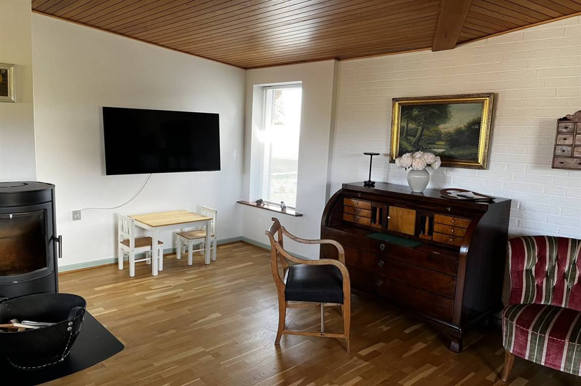 Innen gibt es Holzböden, jedoch Klinkerboden in der Küche. Gestrichene Wände. Schönes Badezimmer mit Fußbodenheizung, Duschnische und Waschmaschine. Die Küche ist mit u. a. Geschirrspüler, Herd mit Ceran-Feld und Umluftofen ausgestattet. Die Küche ist mit dem Wohnzimmer kombiniert. Zusätzliches Wohnzimmer mit Flatscreen-TV, Chromecast und Kaminofen. Von dem Wohnzimmer Ausgang zur Terrasse. 3 gute Schlafzimmer, alle mit Doppelbett. Die Schlafzimmer liegen in einer separaten Abteilung des Hauses.