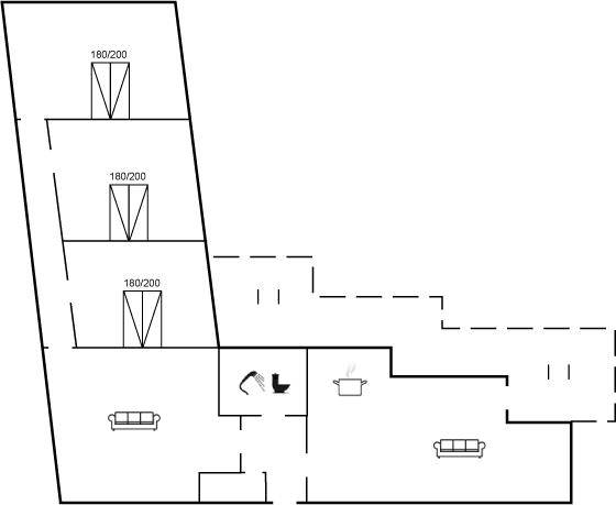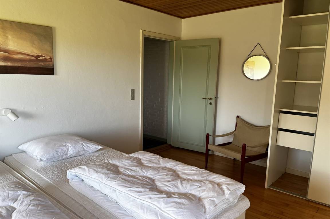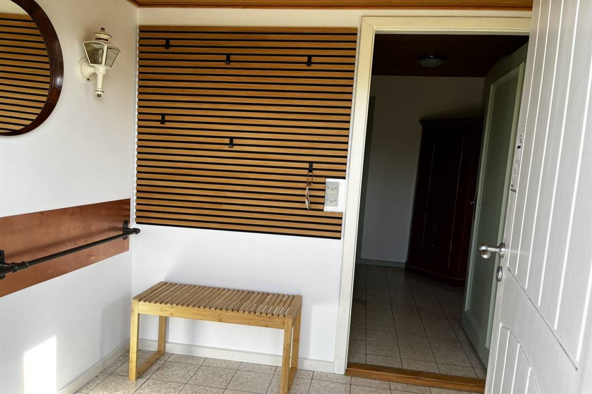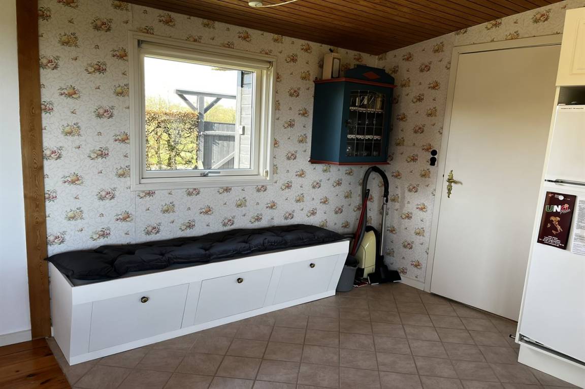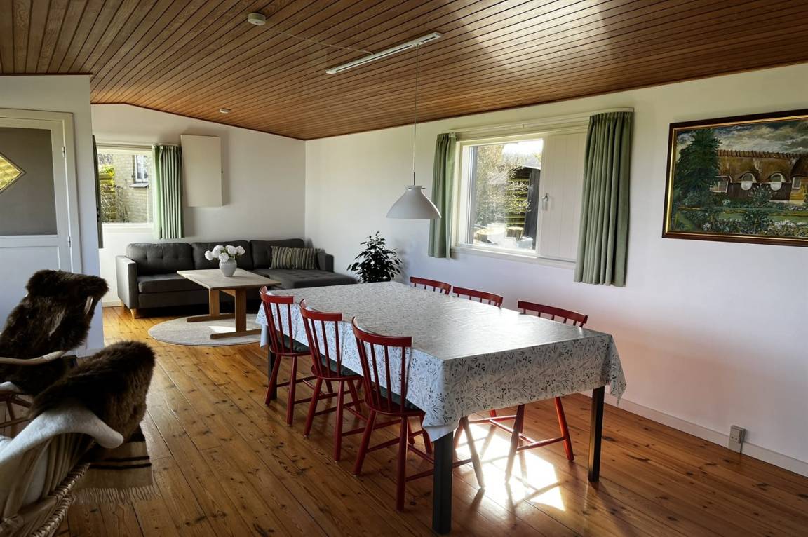 Innen gibt es Holzböden, jedoch Klinkerboden in der Küche. Gestrichene Wände. Schönes Badezimmer mit Fußbodenheizung, Duschnische und Waschmaschine. Die Küche ist mit u. a. Geschirrspüler, Herd mit Ceran-Feld und Umluftofen ausgestattet. Die Küche ist mit dem Wohnzimmer kombiniert. Zusätzliches Wohnzimmer mit Flatscreen-TV, Chromecast und Kaminofen. Von dem Wohnzimmer Ausgang zur Terrasse. 3 gute Schlafzimmer, alle mit Doppelbett. Die Schlafzimmer liegen in einer separaten Abteilung des Hauses.