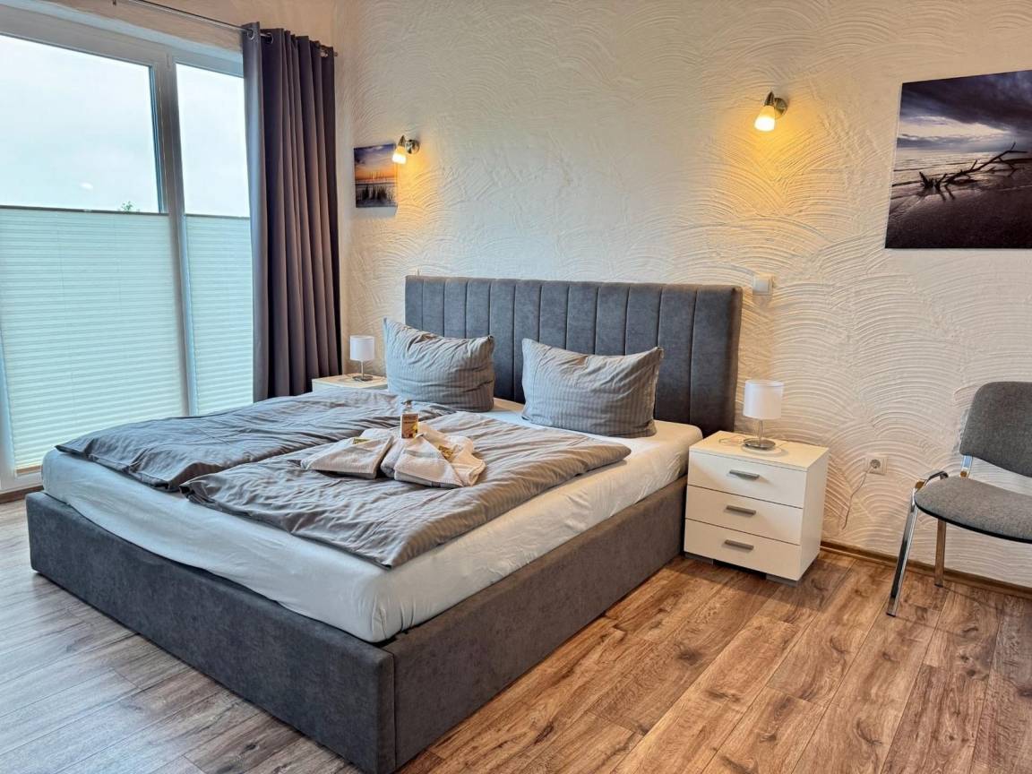 Die großzügig geschnittene Ferienwohnung im Erdgeschoss bietet ein behagliches Ambiente mit zwei Schlafzimmern für insgesamt vier Personen sowie einem offenen Wohnzimmer und Essbereich, der nahtlos in eine voll ausgestattete Küche übergeht.Der Wohnbereich ist lichtdurchflutet und einladend gestaltet, mit einer offenen Küche, die mit einem Cerankochfeld, Backofen, großem Kühlschrank, Gefrierfach und Geschirrspüler ausgestattet ist. Zudem stehen zwei komplette Sets an Geschirr und Besteck, ein Toaster und ein Wasserkocher zur Verfügung. Für Kaffeeliebhaber gibt es eine klassische Kaffeemaschine. Ein großzügiger Esstisch lädt zu gemeinsamen Mahlzeiten oder unterhaltsamen Spielabenden ein. Die gemütliche Couch, ein Smart-TV und die zeitgemäße Einrichtung sorgen für eine angenehme Atmosphäre. Direkter Zugang zur Terrasse und dem Garten rundet das Wohnzimmer ab.Die Schlafzimmer sind mit hochwertigen Betten (180x200) ausgestattet und bieten wunderbar kuschelige Bettwaren für einen erholsamen Schlaf. Große Kleiderschränke und Nachttische mit Nachtlampen vervollständigen die Einrichtung.Im komfortablen und geräumigen Badezimmer erwartet Sie eine luxuriöse Dusche und ein WC. Eine Waschmaschine und ein Trockner stehen gegen Gebühr im benachbarten Gebäude im zweiten Stockwerk zur Verfügung. Ein abschließbarer Abstellraum für Fahrräder und E-Bikes mit Lademöglichkeiten ist ebenfalls vorhanden.Die Zufriedenheit und das Wohlbefinden unserer Gäste, insbesondere Familien, liegen uns sehr am Herzen. Auf Wunsch stellen wir gerne kostenfreie Babybetten mit passender Bettwäsche, Wickelkommoden, Babybadewannen, Rausfallschutz und Tritthocker zur Verfügung, um den Aufenthalt für Eltern und ihre Kleinen so angenehm wie möglich zu gestalten.Darüber hinaus bieten wir in unserem Abstellraum kostenfrei Bollerwagen zur Ausleihe an, damit Familien bequem ihre Ausflüge in die Umgebung oder zum nahegelegenen Strand unternehmen können. Unsere Gäste sollen sich bei uns wie zu Hause fühlen und einen unbeschwerten Urlaub genießen können, ganz gleich, ob sie als Familie oder in anderer Konstellation anreisen.