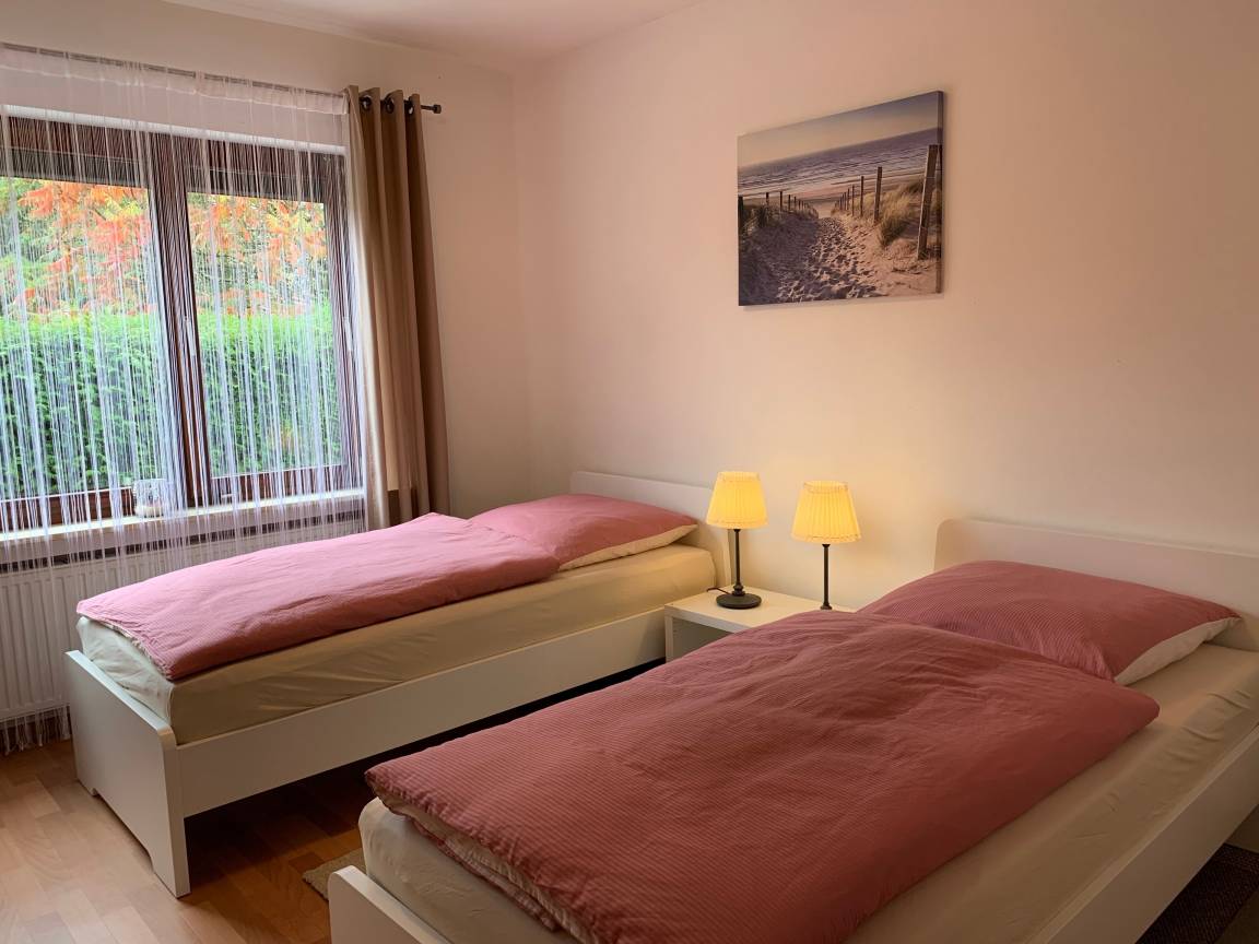 Schlafzimmer 2: zwei bequeme Einzelbetten, Nachttisch mit Leuchten und ein Kleiderschrank