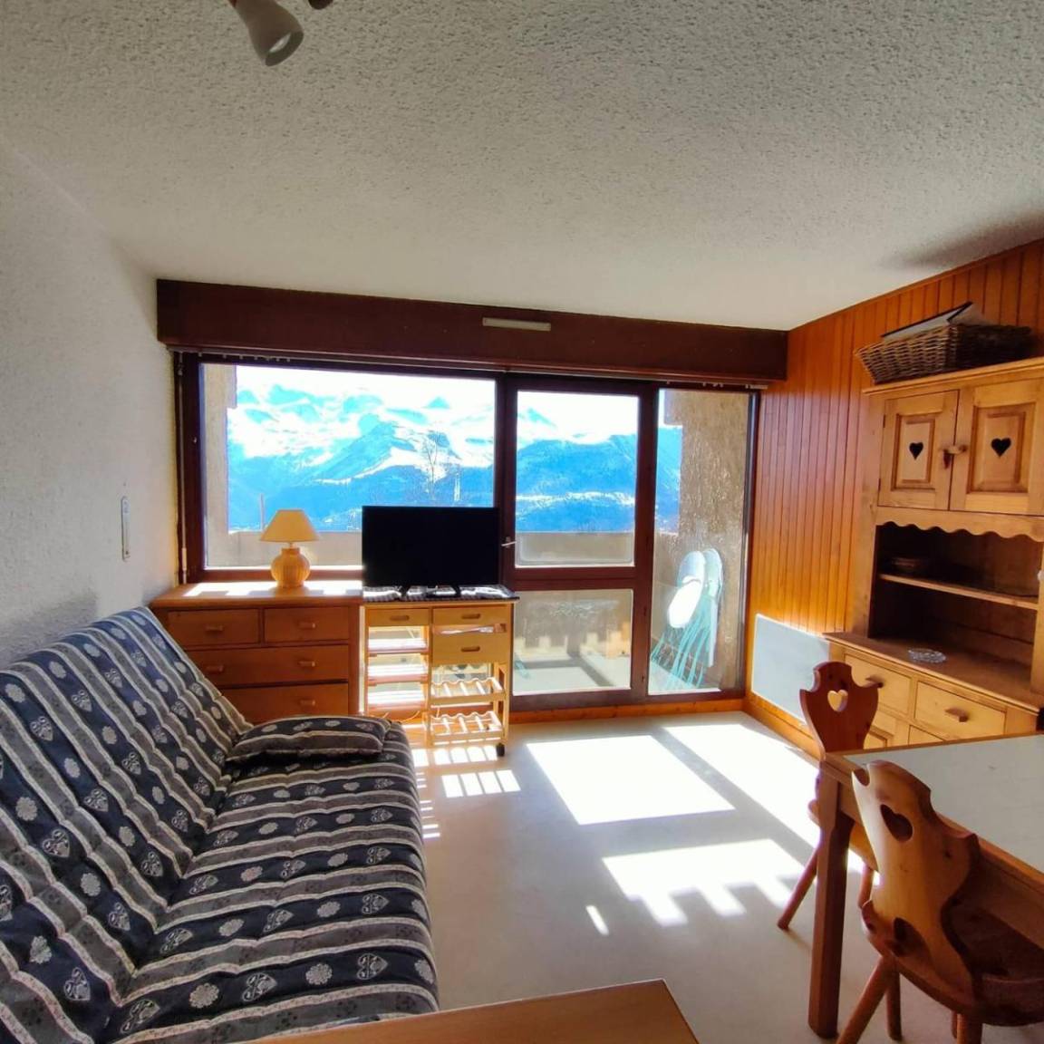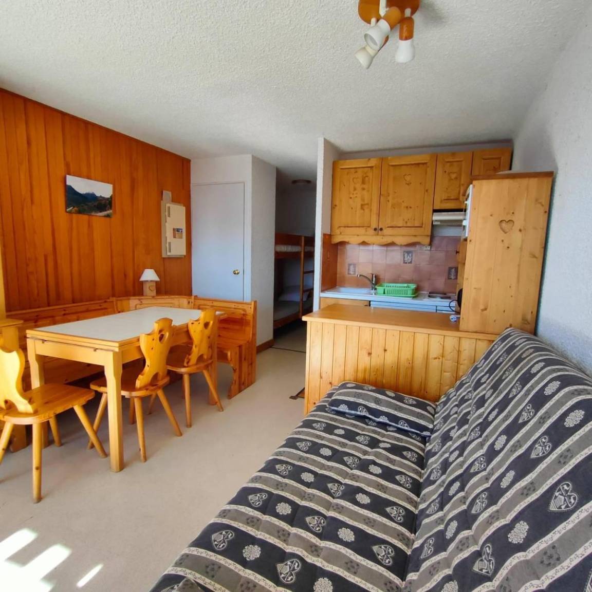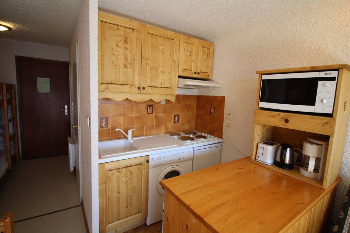 Fläche von ungefähr 23 m². 1te Etage. Orientierung : Süd-Ost, Süd. Blick berg (Glacier de la Meije). Wohnzimmer mit Klappschlafcouch. offener Schlafbereich mit 2 Stockbetten. Kochnische mit Wasserkocher, Kaffeemaschine, kleiner Backofen mit Mikrowellenfunktion, Toaster, Waschmaschine, Herdplatten, Kühlschrank. separates WC. Badezimmer mit Badewanne. Balkon. Die oberen Betten sind nicht für Kinder unter 6 Jahren geeignet.