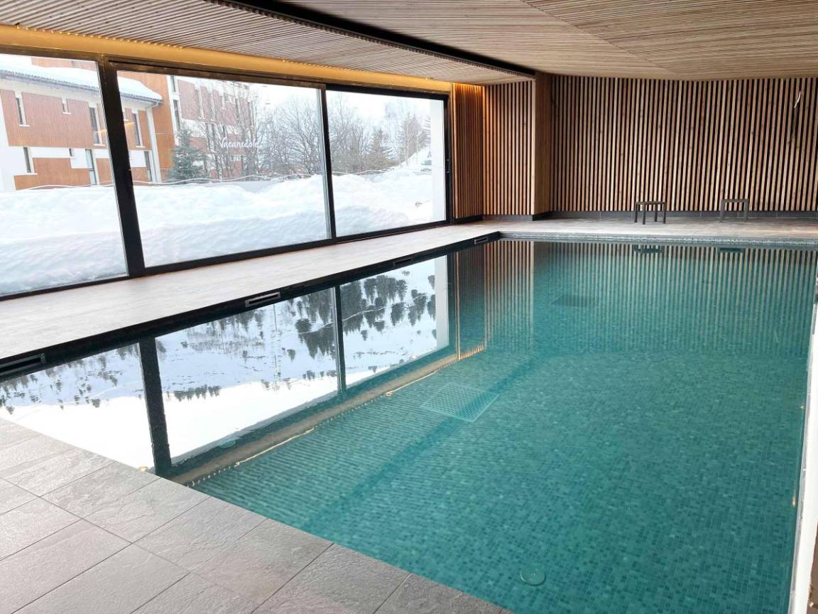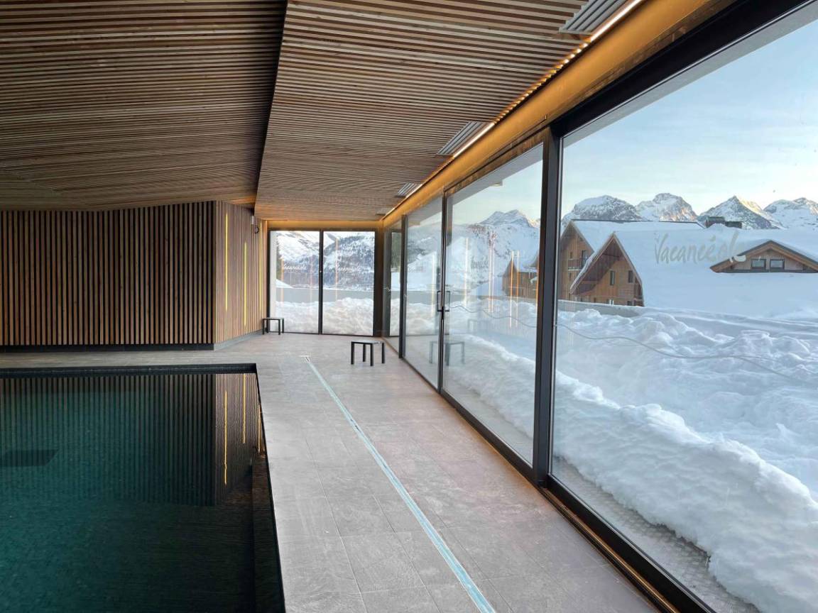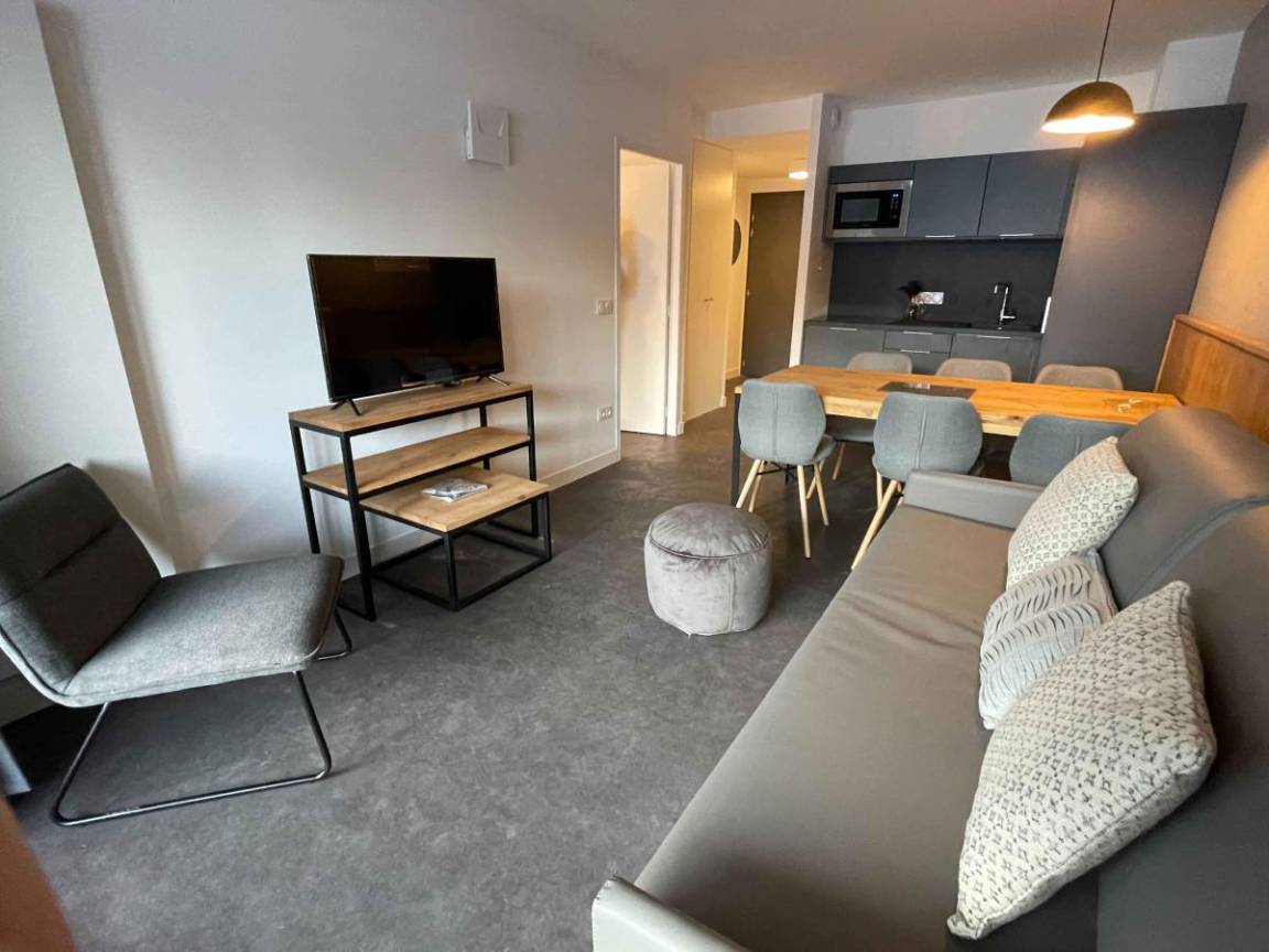 Fläche von ungefähr 56 m². Wohnzimmer mit Ausziehschlafcouch für 2 Personen. Schlafzimmer mit 2 Einzelbetten. offener Schlafbereich mit 2 Stockbetten. Kochnische mit Wasserkocher, Kaffeemaschine, Mikrowellengrill, Toaster, Dunstabzugshaube, Geschirrspülmaschine, Glaskeramikkochfelder, Kühlschrank. Waschräume mit Badewanne oder Dusche, WC. Balkon mit Gartentisch und -stühle ODER Terrasse. Die oberen Betten sind nicht für Kinder unter 6 Jahren geeignet.