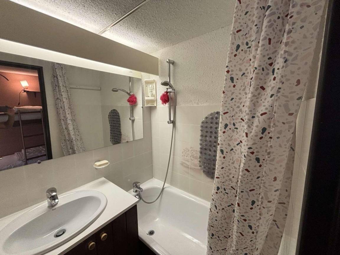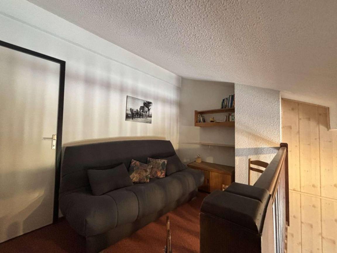 Fläche von ungefähr 45 m². 2te Etage. Orientierung : Süd-Ost. Wohnzimmer mit Klappschlafcouch, TV. Zwischengeschoss mit Klappschlafcouch. offener Schlafbereich mit 2 Stockbetten. Kochnische mit Staubsauger, Wasserkocher, Kaffeemaschine, Backofen, Toaster, Geschirrspülmaschine, 2 Glaskeramikkochfelder, Kühl-Gefrier-Kombination. Badezimmer. WC. Balkon mit Gartentisch und -stühle. Die oberen Betten sind nicht für Kinder unter 6 Jahren geeignet.