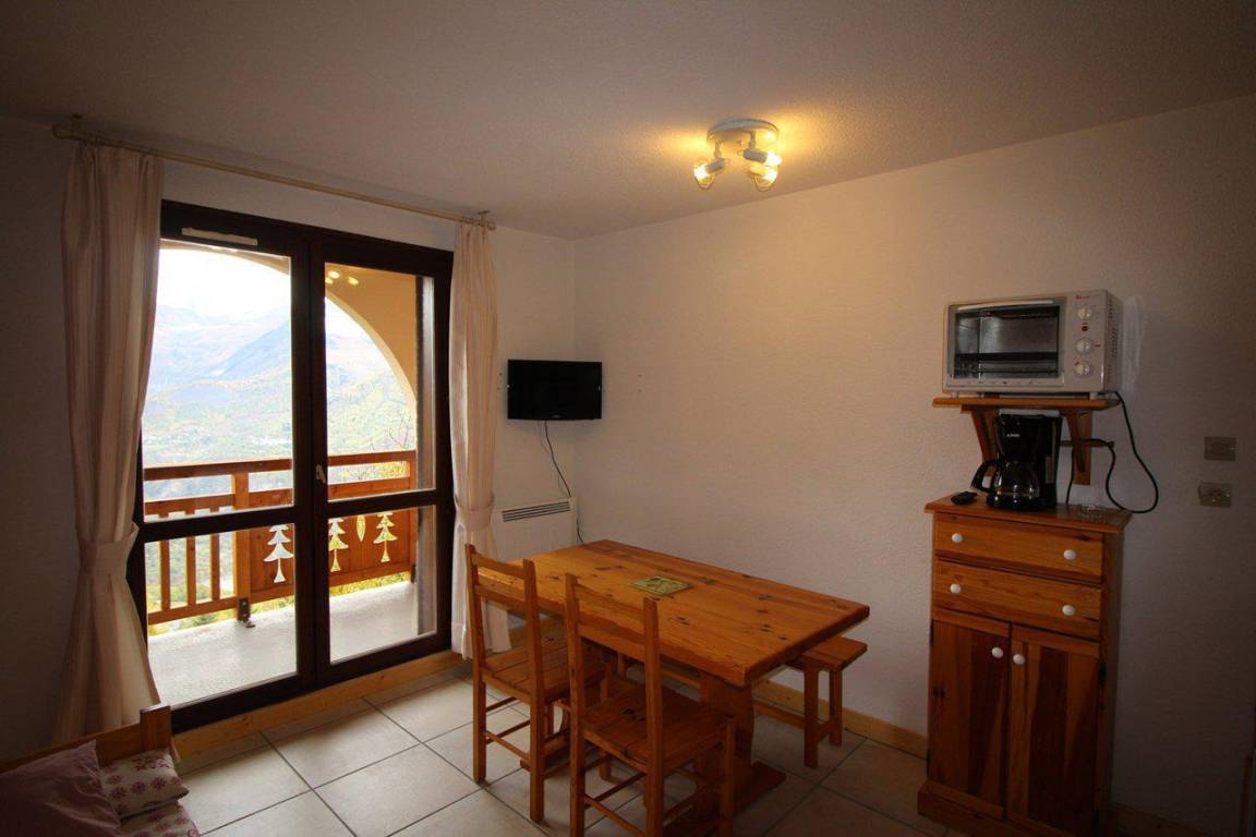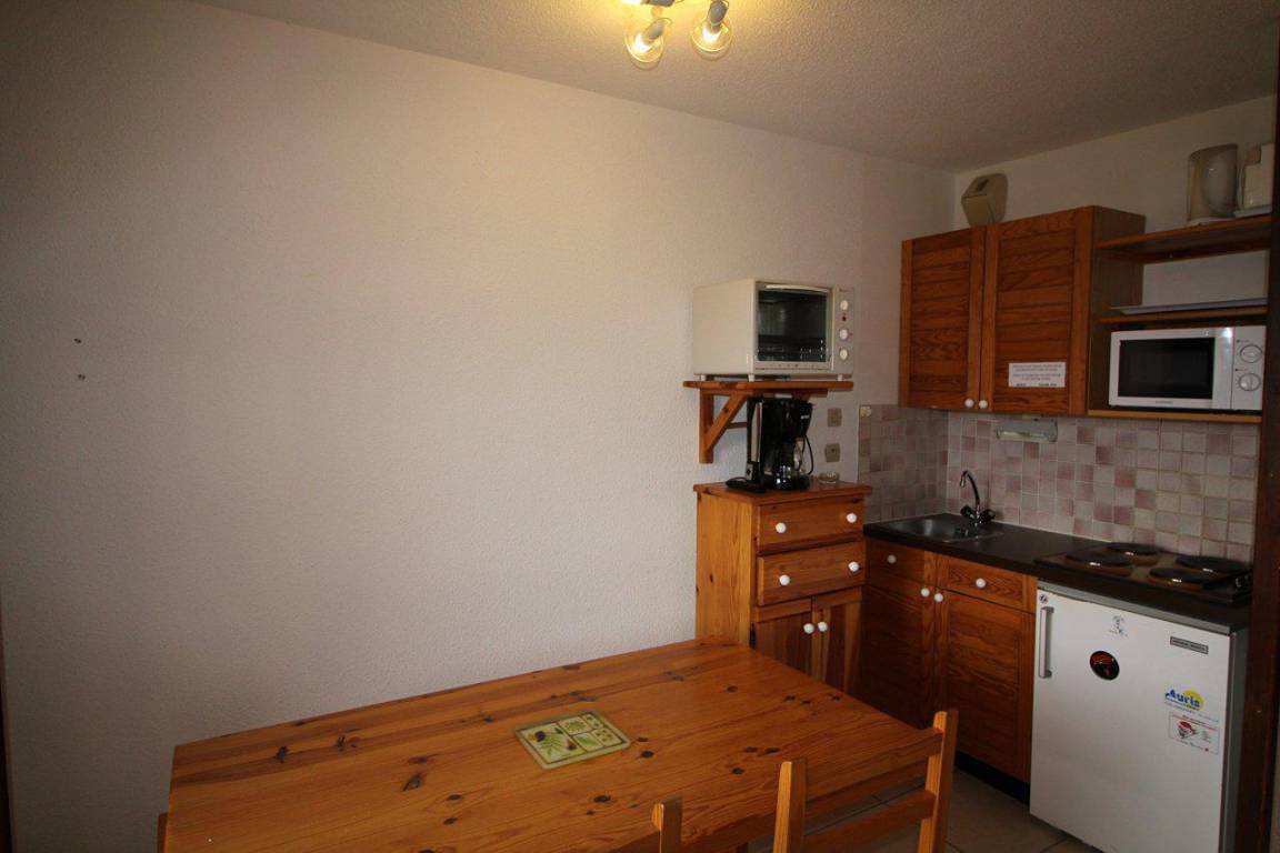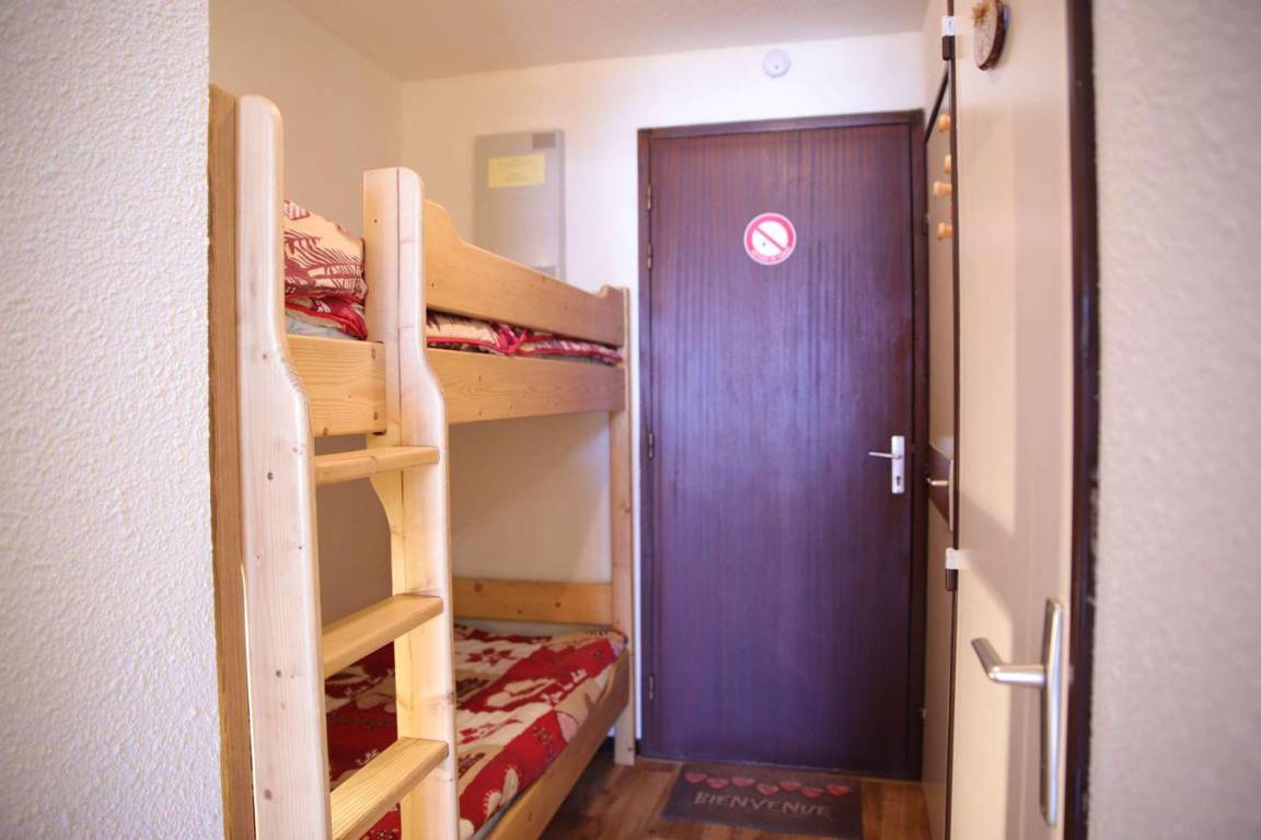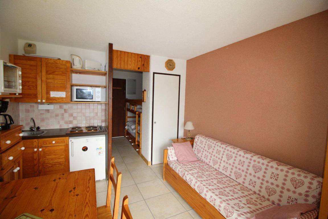 Fläche von ungefähr 23 m². Orientierung : Süd-Ost, Süd. Blick berg. Wohnzimmer mit Ausziehschlafcouch für 2 Personen. offener Schlafbereich mit 2 Stockbetten. Kochnische mit Wasserkocher, Kaffeemaschine, Backofen, kleiner Backofen mit Mikrowellenfunktion, Toaster, Herdplatten, Kühlschrank. Badezimmer mit Badewanne. separates WC. Balkon. Die oberen Betten sind nicht für Kinder unter 6 Jahren geeignet.