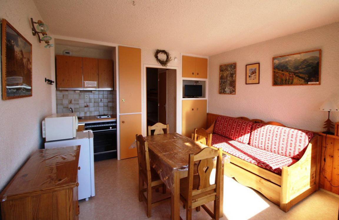 Fläche von ungefähr 23 m². 1te Etage. Orientierung : Süd-Ost, Süd. Blick berg (Massif des Ecrins). Wohnzimmer mit Ausziehschlafcouch für 2 Personen. offener Schlafbereich mit 2 Stockbetten. Kochnische mit Raclettegerät, Wasserkocher, Kaffeemaschine, Backofen, kleiner Backofen mit Mikrowellenfunktion, Toaster, Herdplatten, Kühlschrank. Waschräume mit Dusche. separates WC. Balkon mit Gartentisch und -stühle. Die oberen Betten sind nicht für Kinder unter 6 Jahren geeignet.