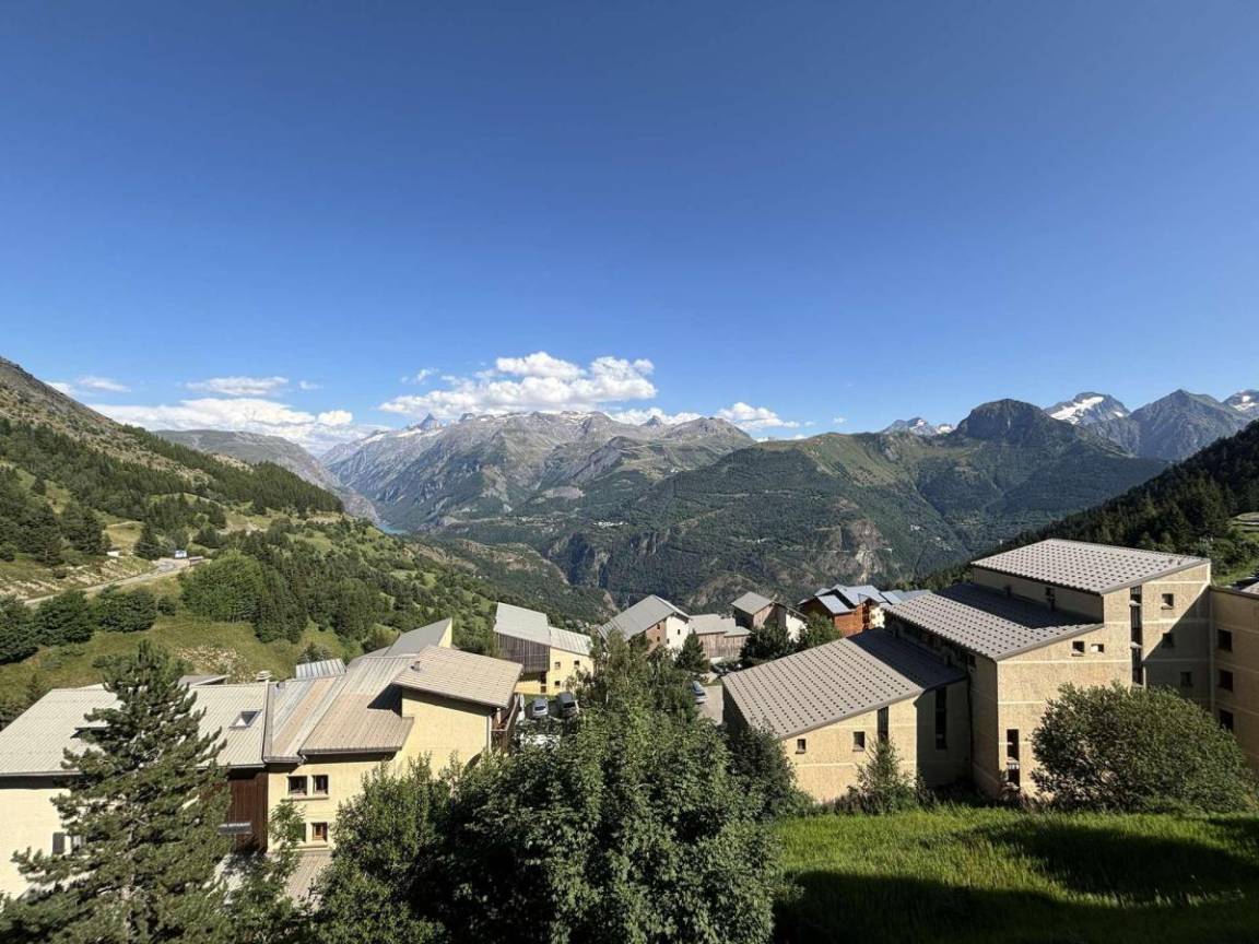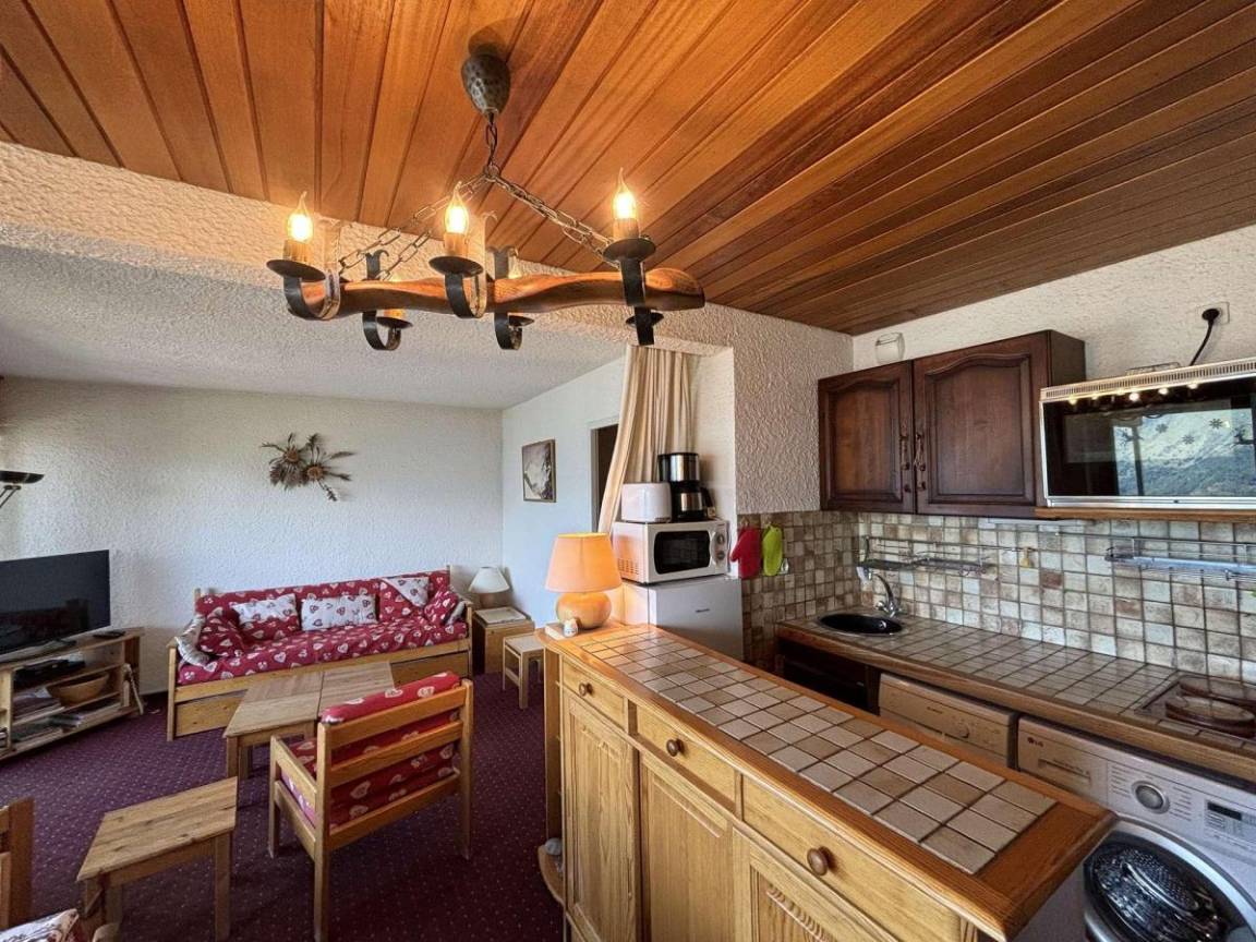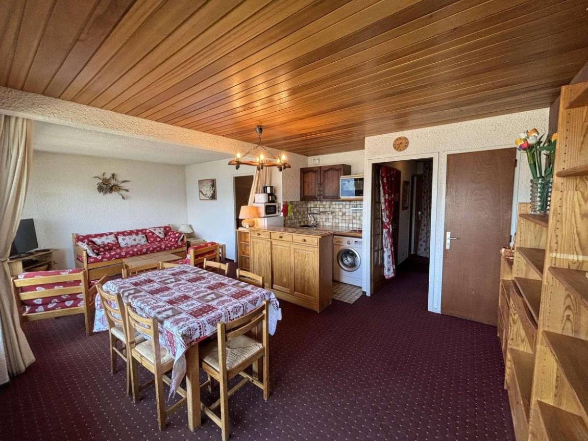 Fläche von ungefähr 45 m². Erdgeschoss. Orientierung : Süd. Wohnzimmer mit Ausziehschlafcouch für 2 Personen. Schlafzimmer mit Doppelbett. Schlafbereich mit 2 Stockbetten. Kochnische mit Fonduegerät, Raclettegerät, Wasserkocher, Kaffeemaschine, Backofen, kleiner Backofen mit Mikrowellenfunktion, Toaster, Geschirrspülmaschine, Kühl-Gefrier-Kombination. Badezimmer. separates WC. Waschmaschine. Die oberen Betten sind nicht für Kinder unter 6 Jahren geeignet.