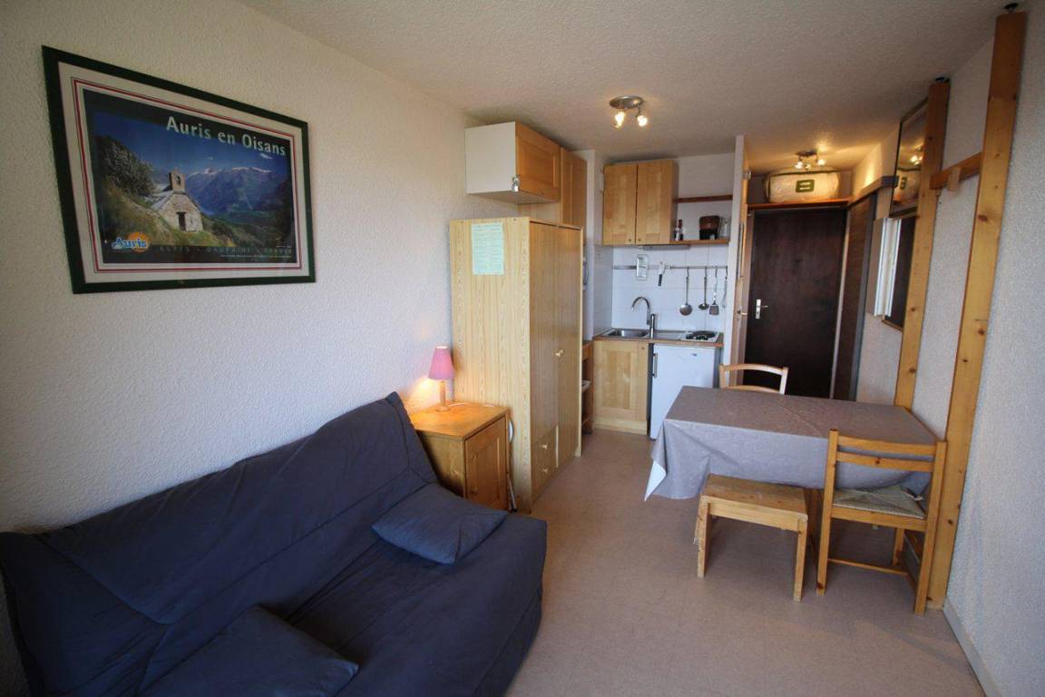 Die Residenz Iris befindet sich im Ferienort Auris en Oisans im unteren Teil des Ferienortes. Diese ruhige, am Berghang erbaute Residenz bietet einen atemberaubenden Blick auf das Tal und die Berge ohne Gegenüber. Das Ortszentrum und die Geschäfte liegen 300 m entfernt. Kostenlose Parkplätze stehen vor der Residenz zur Verfügung. Fläche von ungefähr 17 m². 2te Etage. Orientierung : Süd, Süd-West. Blick berg. Wohnzimmer mit BZ-Sofas. offener Schlafbereich mit 2 Stockbetten. Kochnische mit Fonduegerät, Raclettegerät, Wasserkocher, Kaffeemaschine, Toaster, Mikrowellenherd, 2 Herdplatten, Kühlschrank. Waschräume mit Dusche, WC. Balkon. Die oberen Betten sind nicht für Kinder unter 6 Jahren geeignet.