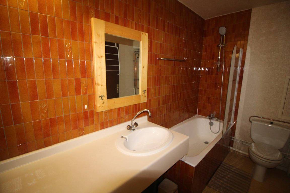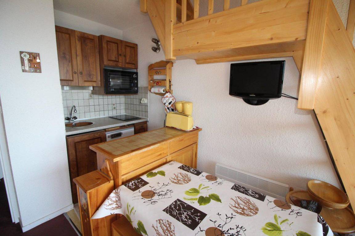 Fläche von ungefähr 27 m². 6te Etage. Orientierung : Süd. Blick berg. Wohnzimmer. Zwischengeschoss mit Doppelbett. offener Schlafbereich mit 2 Stockbetten. Kochnische mit Raclettegerät, Wasserkocher, Kaffeemaschine, kleiner Backofen mit Mikrowellenfunktion, Toaster, Kühlschrank. Badezimmer mit Badewanne, WC. Balkon mit Gartentisch und -stühle. Die oberen Betten sind nicht für Kinder unter 6 Jahren geeignet.