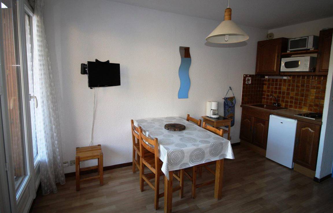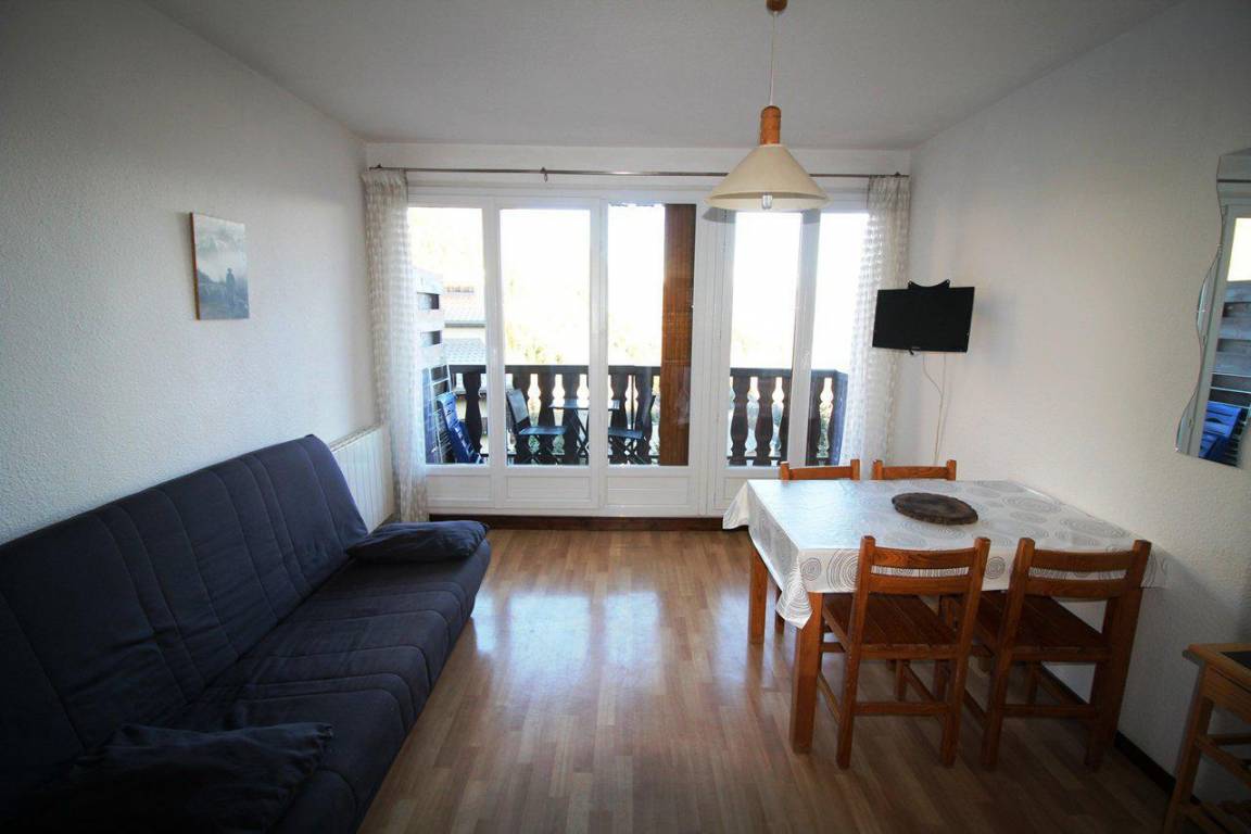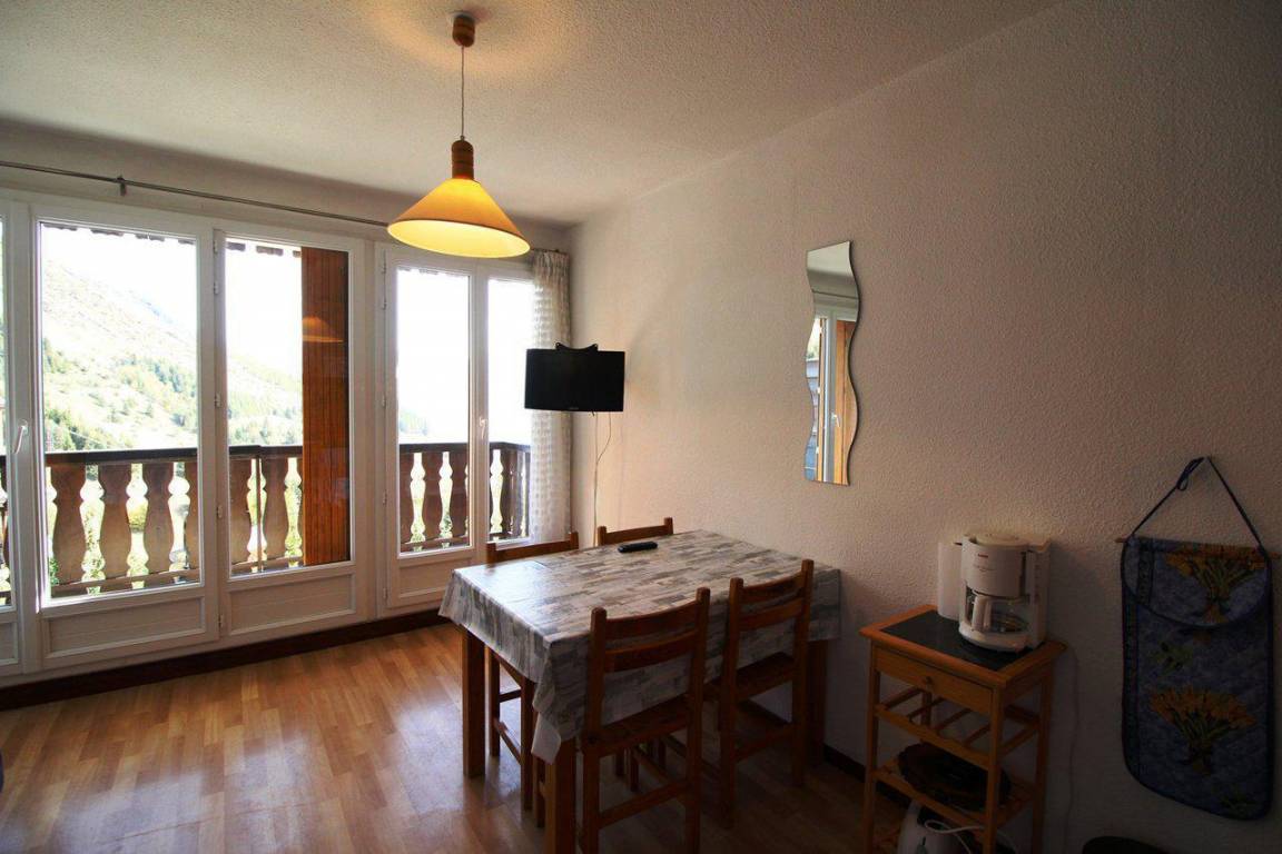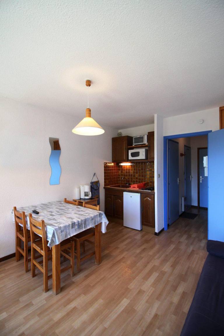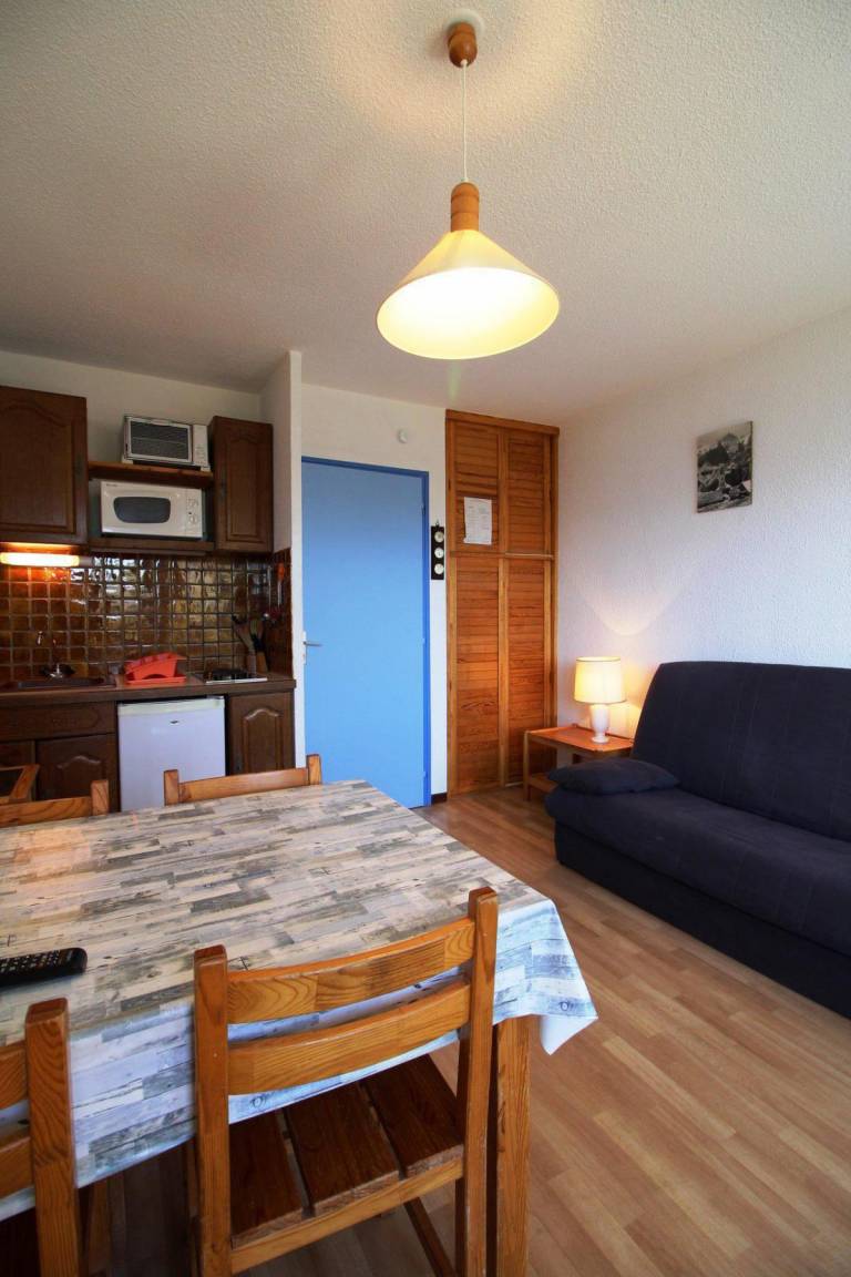 Fläche von ungefähr 23 m². Erdgeschoss. Orientierung : Süd. Blick berg (massif des Ecrins). Wohnzimmer mit Klappschlafcouch. offener Schlafbereich mit 2 Stockbetten. Kochnische mit Wasserkocher, Kaffeemaschine, kleiner Backofen mit Mikrowellenfunktion, Toaster, Kühlschrank. Badezimmer mit Badewanne. separates WC. Balkon mit Gartentisch und -stühle. Die oberen Betten sind nicht für Kinder unter 6 Jahren geeignet.