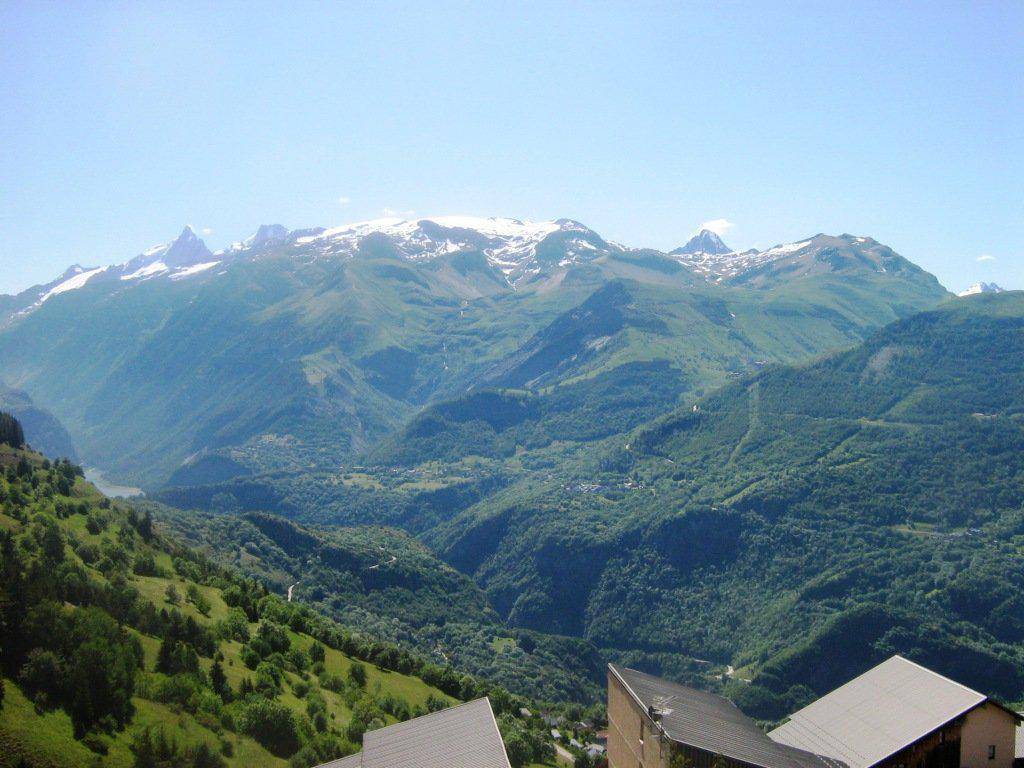 Fläche von ungefähr 55 m². 3te Etage. Orientierung : Süd. Blick berg. Niveau 0 : Wohnzimmer mit Klappschlafcouch. offener Schlafbereich mit 2 Stockbetten. Kochnische mit Raclettegerät, kleiner Backofen mit Mikrowellenfunktion, Herdplatten, Kühlschrank. separates WC. Waschräume mit Dusche. 2 Balkone. Niveau 1 : Schlafzimmer mit Doppelbett. offener Schlafbereich mit BZ-Sofas. Die oberen Betten sind nicht für Kinder unter 6 Jahren geeignet.