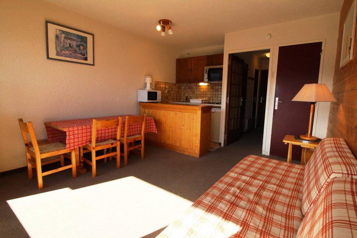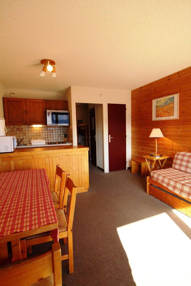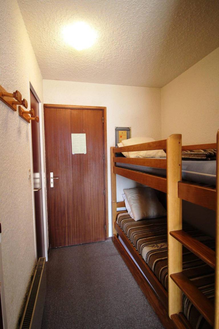 Fläche von ungefähr 27 m². 4te Etage. Orientierung : Süd. Blick berg. Wohnzimmer mit Ausziehschlafcouch für 2 Personen. offener Schlafbereich mit 2 Stockbetten. Kochnische mit Kaffeemaschine, kleiner Backofen mit Mikrowellenfunktion, Toaster, Geschirrspülmaschine, Herdplatten, Kühlschrank. Badezimmer mit Badewanne. separates WC. Balkon. Die oberen Betten sind nicht für Kinder unter 6 Jahren geeignet.