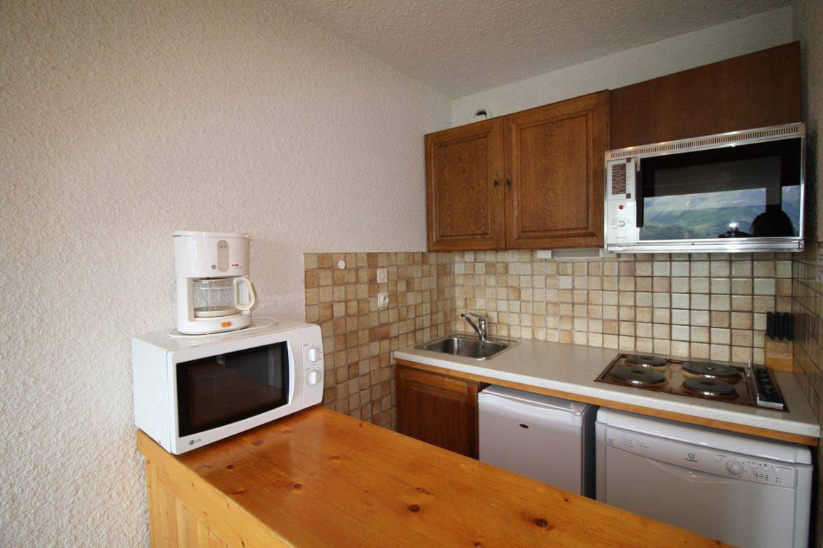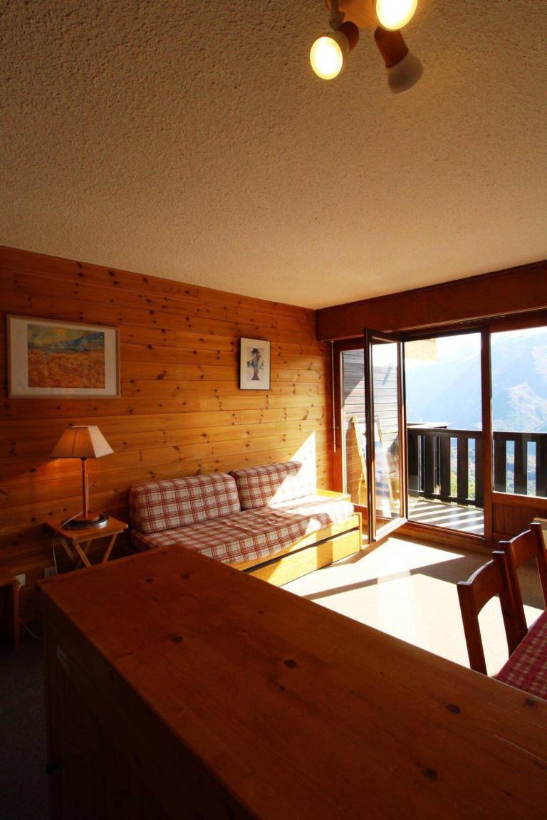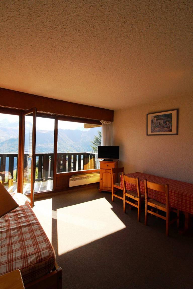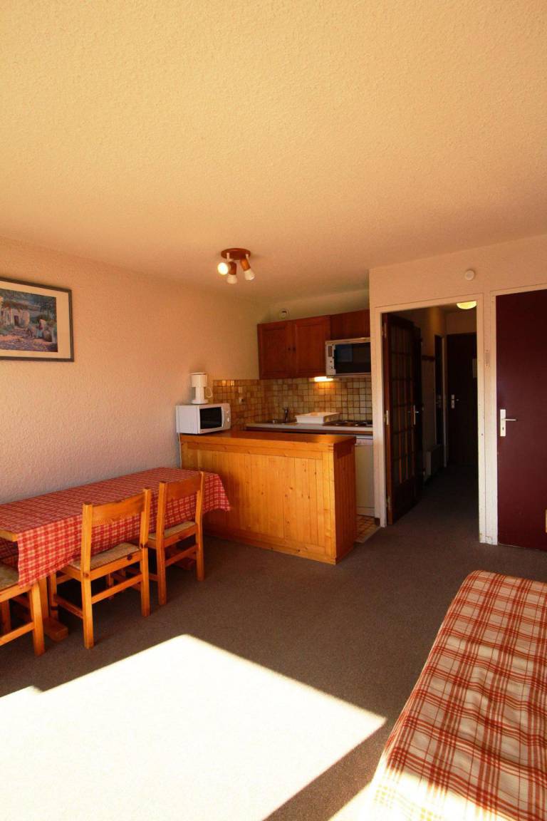 Fläche von ungefähr 27 m². 4te Etage. Orientierung : Süd. Blick berg. Wohnzimmer mit Ausziehschlafcouch für 2 Personen. offener Schlafbereich mit 2 Stockbetten. Kochnische mit Kaffeemaschine, kleiner Backofen mit Mikrowellenfunktion, Toaster, Geschirrspülmaschine, Herdplatten, Kühlschrank. Badezimmer mit Badewanne. separates WC. Balkon. Die oberen Betten sind nicht für Kinder unter 6 Jahren geeignet.