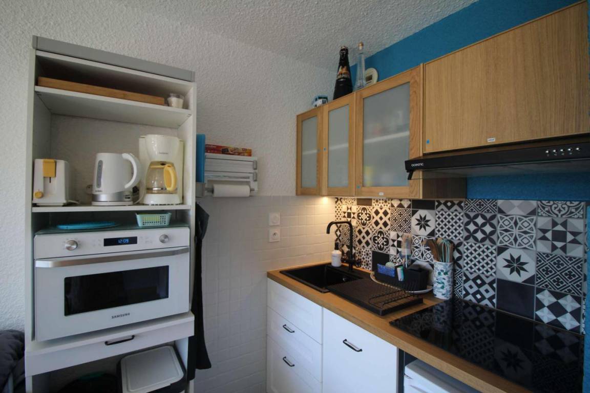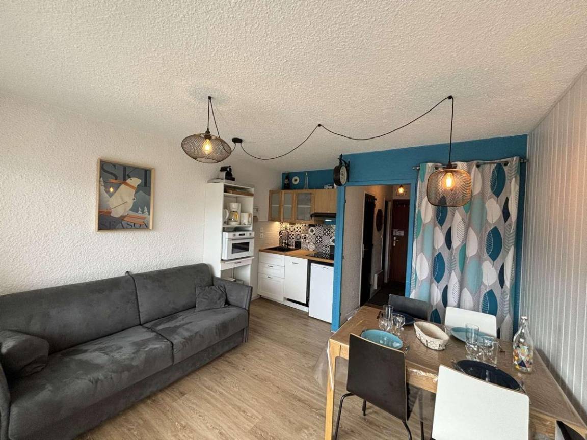 Fläche von ungefähr 23 m². 1te Etage. Orientierung : Süd. Blick berg (Massif des Ecrins). Wohnzimmer mit Klappschlafcouch. offener Schlafbereich mit 2 Stockbetten. Kochnische mit Raclettegerät, Wasserkocher, Kaffeemaschine, Toaster, Mikrowellenherd, Glaskeramikkochfelder, Kühlschrank. Badezimmer mit Badewanne, Haartrockner. separates WC. Balkon. Die oberen Betten sind nicht für Kinder unter 6 Jahren geeignet.