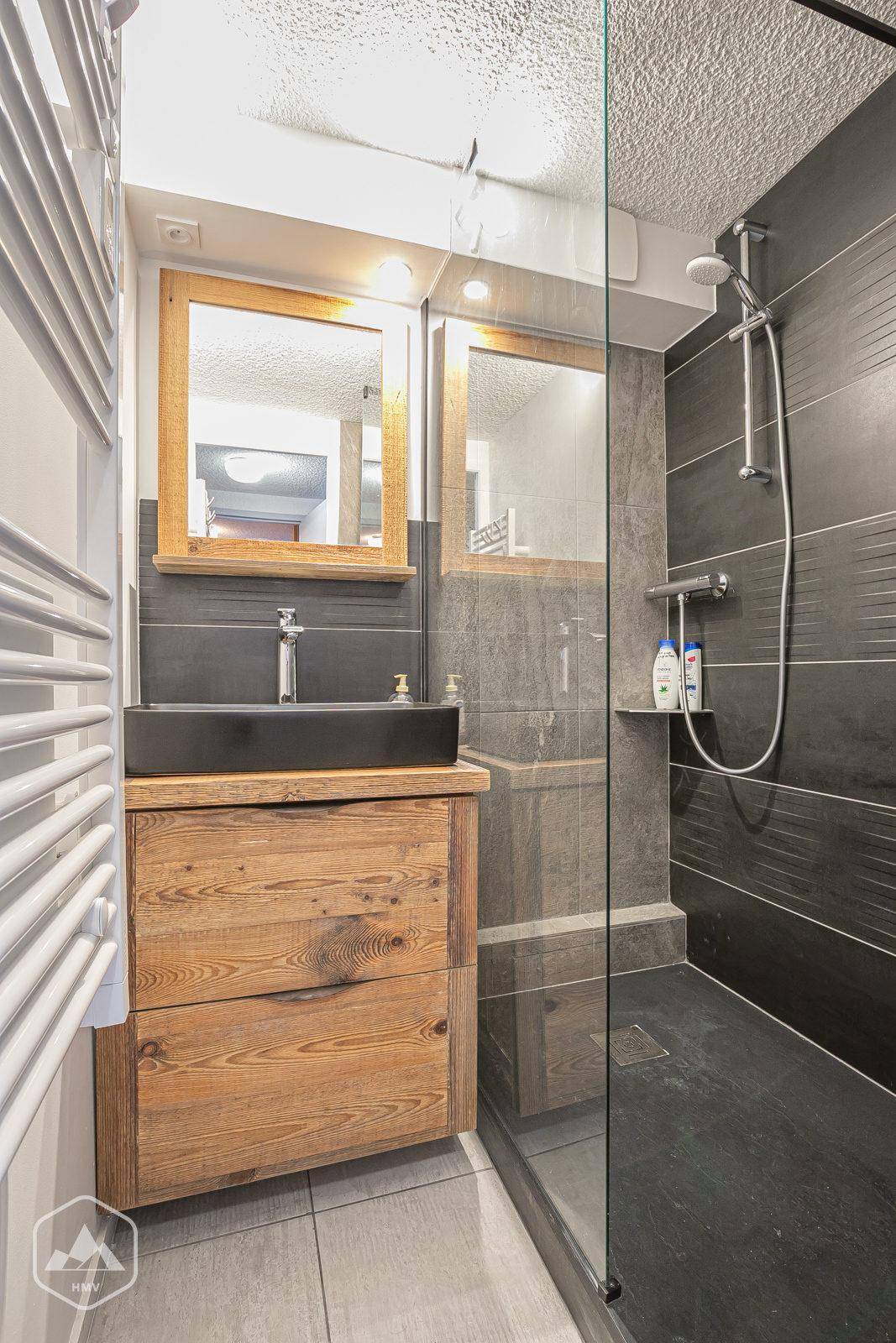 Fläche von ungefähr 42 m². 2te Etage. Orientierung : Süd-Ost, Süd, West. Niveau 0 : Diele. Wohnzimmer mit Klappschlafcouch. offener Schlafbereich mit Einzelbett. Zwischengeschoss mit 2 Ausziehbetten. Kochnische mit Backofen, Geschirrspülmaschine, Mikrowellenherd, 4 elektronische Herdplatten, Kühl-Gefrier-Kombination. separates WC. Waschräume. Loggia. Balkon. Waschmaschine. Niveau 1 : Schlafzimmer mit Doppelbett.