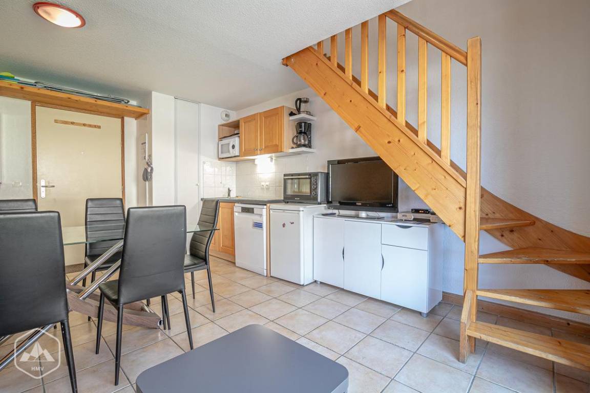 Die Residenz ist mit einem Aufzug ausgestattet. Fläche von ungefähr 40 m² enthält 4 m² unter 1,80 m. 1te Etage. Orientierung : Ost. Niveau 0 : Wohnzimmer mit Klappschlafcouch. Schlafzimmer mit Doppelbett. offener Schlafbereich mit 2 Stockbetten. Kochnische mit Fonduegerät, Raclettegerät, Wasserkocher, Kaffeemaschine, Toaster, Geschirrspülmaschine, Mikrowellenherd, 3 Induktionsherdplatten, Kühlschrank. Balkon. Niveau 1 : Badezimmer mit Badewanne, Waschbecken, Haartrockner. separates WC. Die oberen Betten sind nicht für Kinder unter 6 Jahren geeignet.