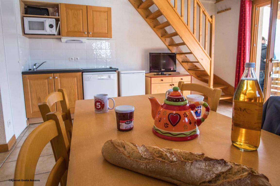 Fläche von ungefähr 35-40 m². Niveau 0 : Wohnzimmer mit Klappschlafcouch. Kochnische mit Wasserkocher, Kaffeemaschine, Mikrowellengrill, Toaster, Dunstabzugshaube, Geschirrspülmaschine, 4 Herdplatten, Kühlschrank. Niveau 1 : Schlafzimmer mit 2 Einzelbetten. offener Schlafbereich mit 2 Stockbetten. Badezimmer mit Badewanne, WC. Balkon mit 2 Liegestühle ODER Terrasse. Die oberen Betten sind nicht für Kinder unter 6 Jahren geeignet.