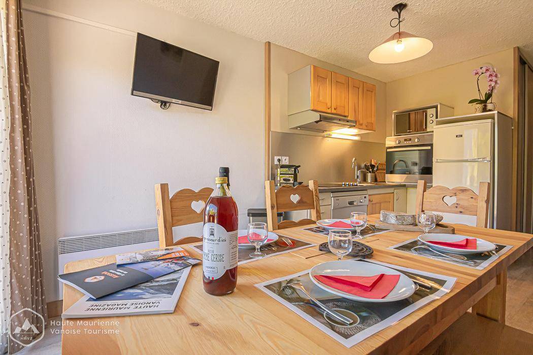Ideal gelegen am Fuße der Skipisten im Winter und der Wanderwege im Sommer, genießt dieses renovierte 3-Sterne-Apartment eine erstklassige Lage, nur wenige Schritte vom Dorfzentrum und den Geschäften entfernt. Es bietet einen außergewöhnlichen Panoramablick auf das Dorf Aussois und die majestätischen umliegenden Berge. Atmen Sie tief durch: In dieser einzigartigen Umgebung zwischen unberührter Natur und dem authentischen Charme Savoyens erwartet Sie ein wahrer Hauch frischer Luft. Fläche von ungefähr 37 m². Etage -1. Orientierung : Ost. Diele mit Stockbett. Wohnzimmer mit einfache Klappschlafcouch (160*200), TV. Schlafzimmer mit , Doppelbett. Küche mit Wasserkocher, Kaffeemaschine (Nespresso), Backofen, Toaster, Geschirrspülmaschine, Mikrowellenherd, Kochplatte, Kühl-Gefrier-Kombination. Badezimmer mit WC. Terrasse. Die oberen Betten sind nicht für Kinder unter 6 Jahren geeignet.