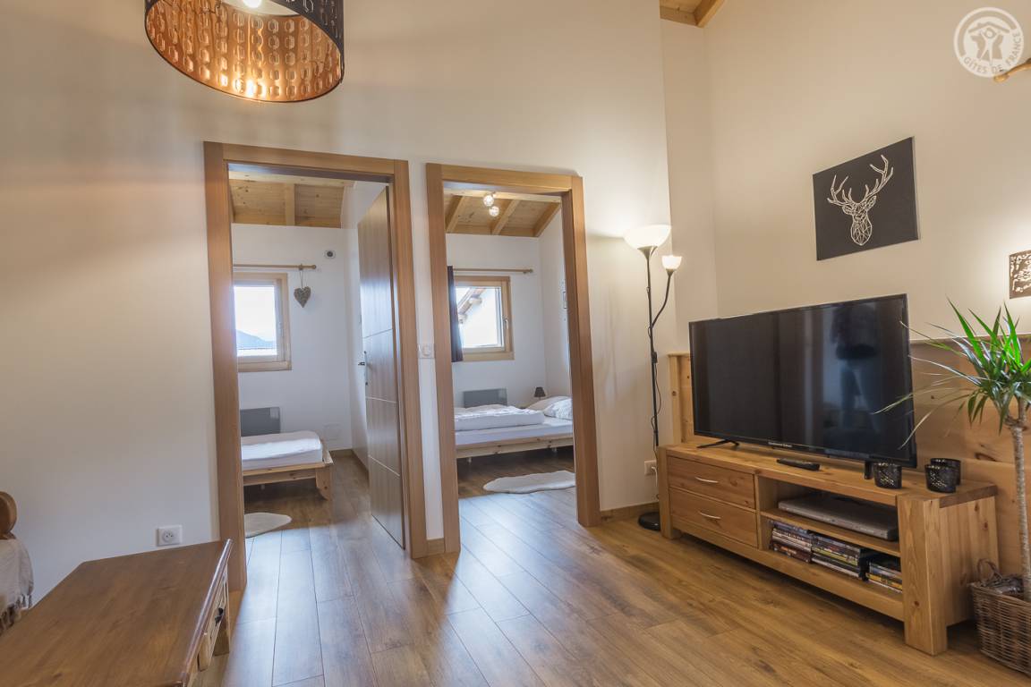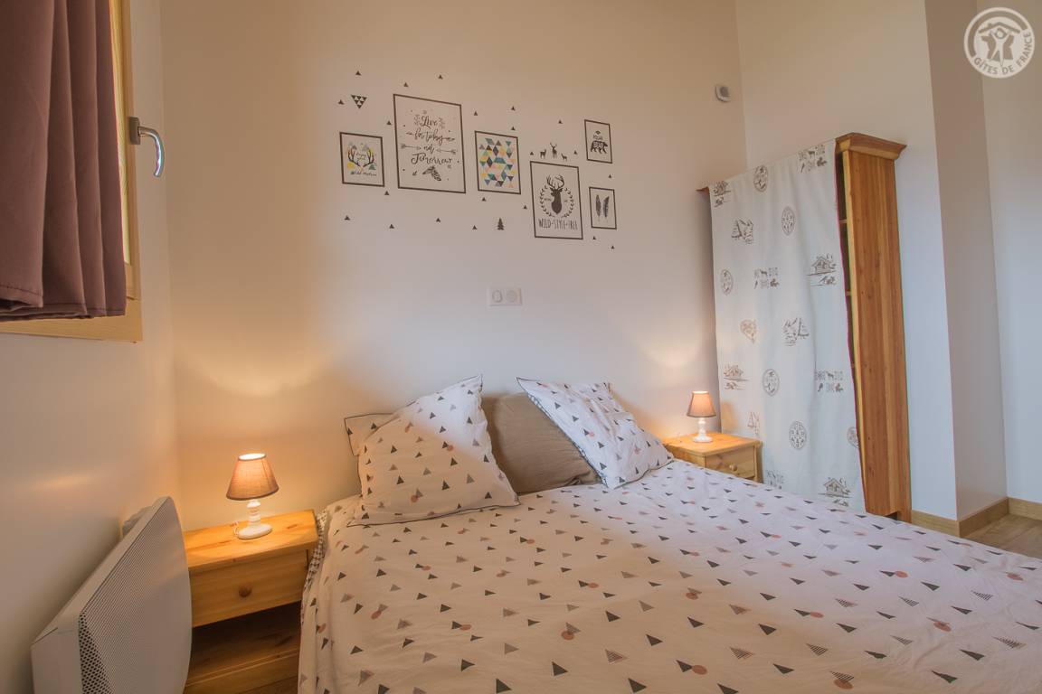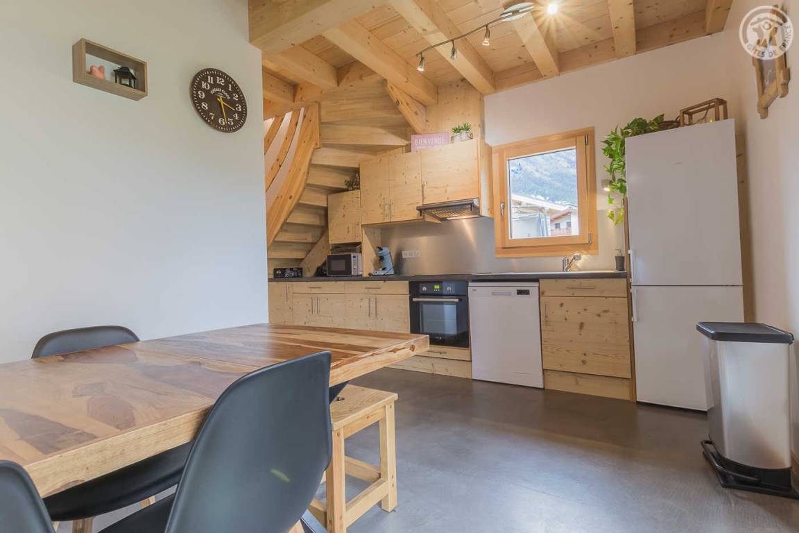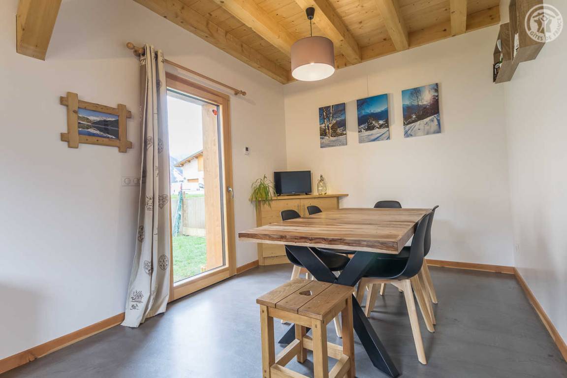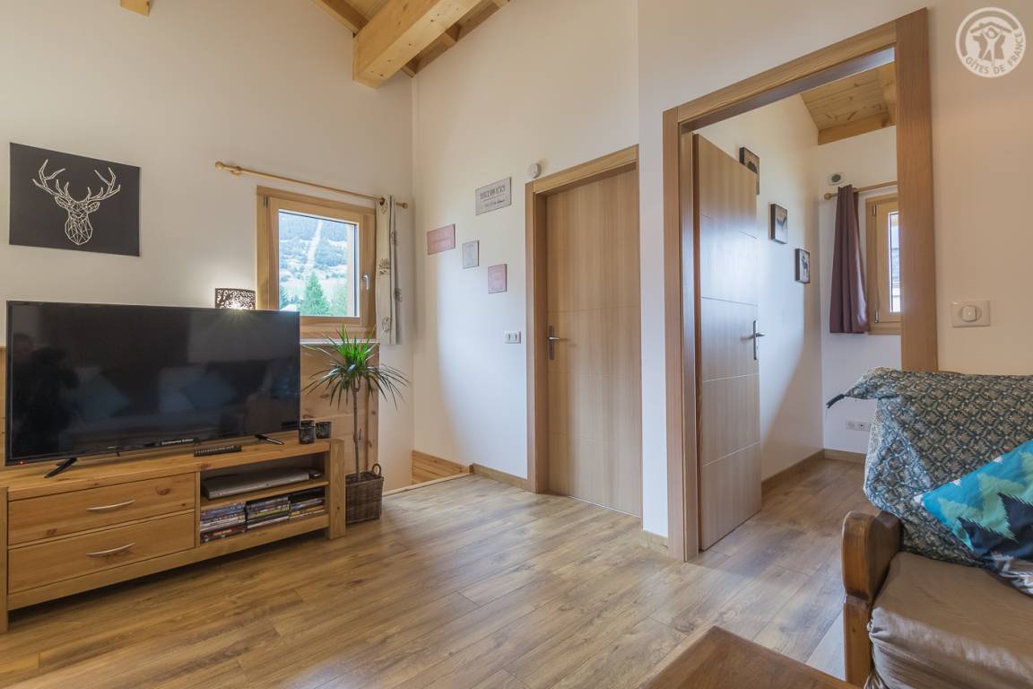 Gîte neben dem Haus der Eigentümer mit separatem Zugang und privater Terrasse. Im Erdgeschoss: Küche-Esszimmer mit Zugang zur Terrasse. 1 WC. Oben: Mezzanine, das in einen Entspannungsbereich mit TV umgewandelt wurde. 3 Schlafzimmer: 2 Schlafzimmer mit 1 Doppelbett (140x190cm) + 1 Schlafzimmer mit 2 Etagenbetten. Duschraum (Dusche mit Thermostatventil und Regendusche) mit WC und Waschmaschine. Vermietung von Bettwäsche und Handtüchern. Reinigungsmöglichkeit. Private Parkplätze in der Nähe des Hauses. Skiraum an der Schneefront verfügbar. Kostenloser Shuttle in der Wintersaison.