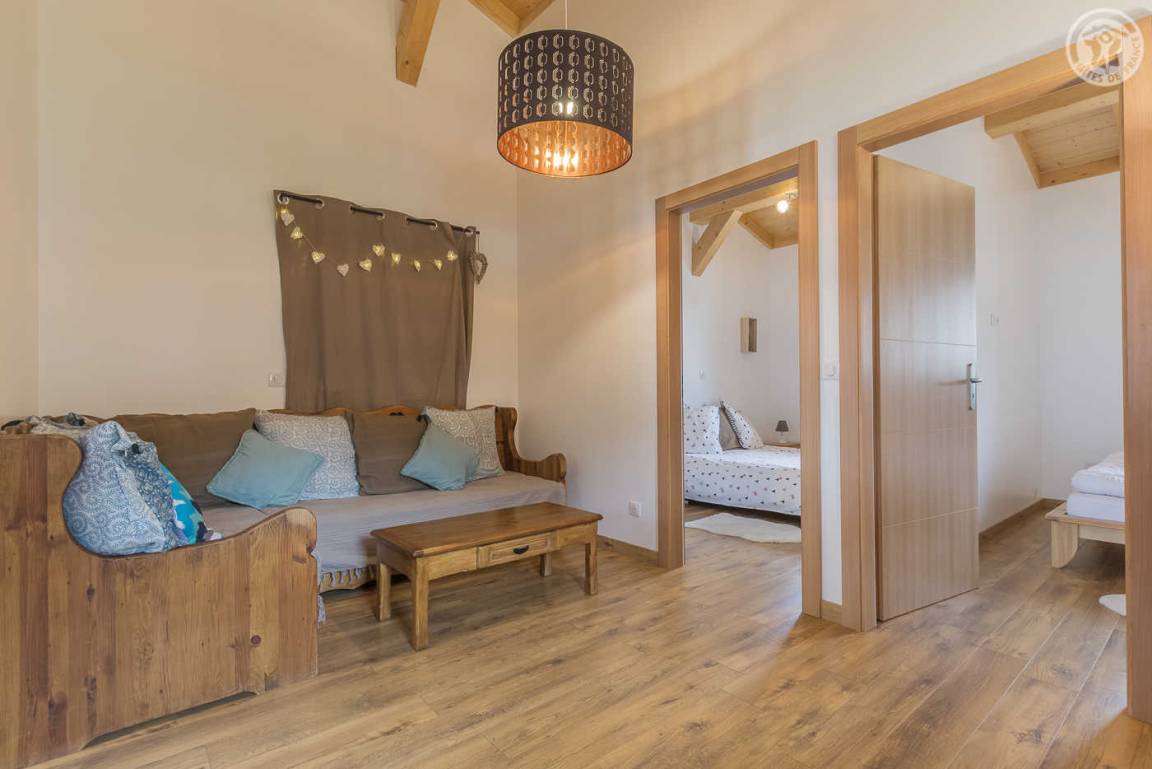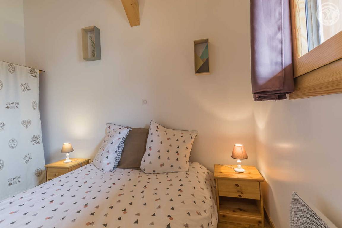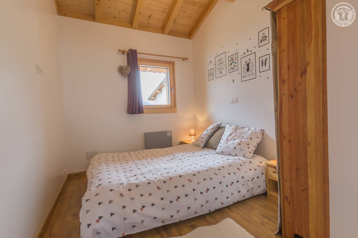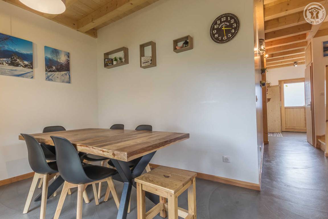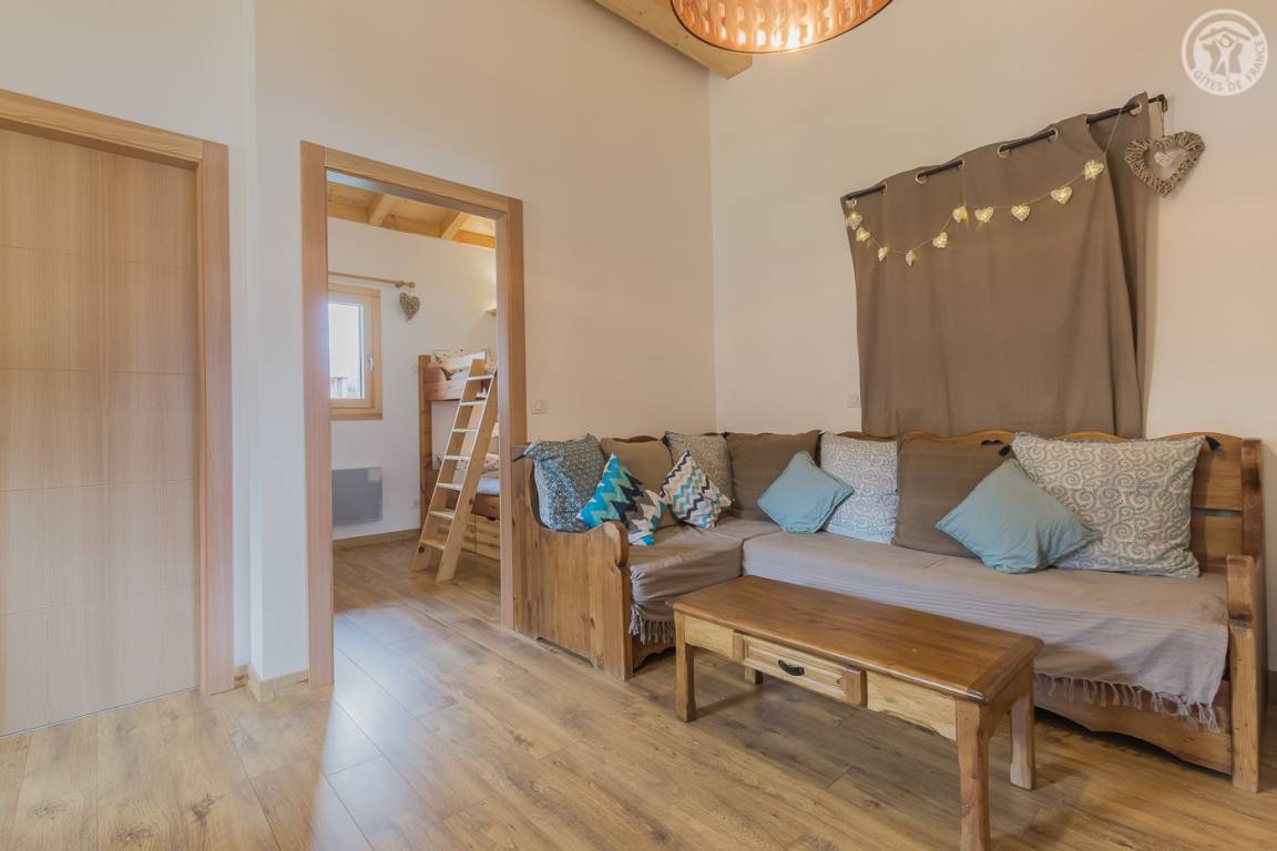 Gîte neben dem Haus der Eigentümer mit separatem Zugang und privater Terrasse. Im Erdgeschoss: Küche-Esszimmer mit Zugang zur Terrasse. 1 WC. Oben: Mezzanine, das in einen Entspannungsbereich mit TV umgewandelt wurde. 3 Schlafzimmer: 2 Schlafzimmer mit 1 Doppelbett (140x190cm) + 1 Schlafzimmer mit 2 Etagenbetten. Duschraum (Dusche mit Thermostatventil und Regendusche) mit WC und Waschmaschine. Vermietung von Bettwäsche und Handtüchern. Reinigungsmöglichkeit. Private Parkplätze in der Nähe des Hauses. Skiraum an der Schneefront verfügbar. Kostenloser Shuttle in der Wintersaison.