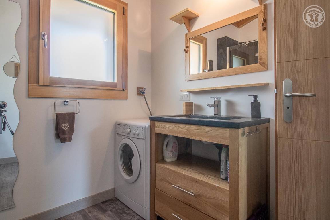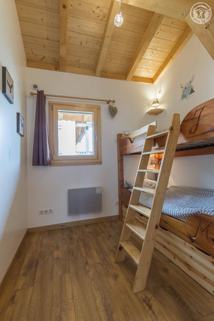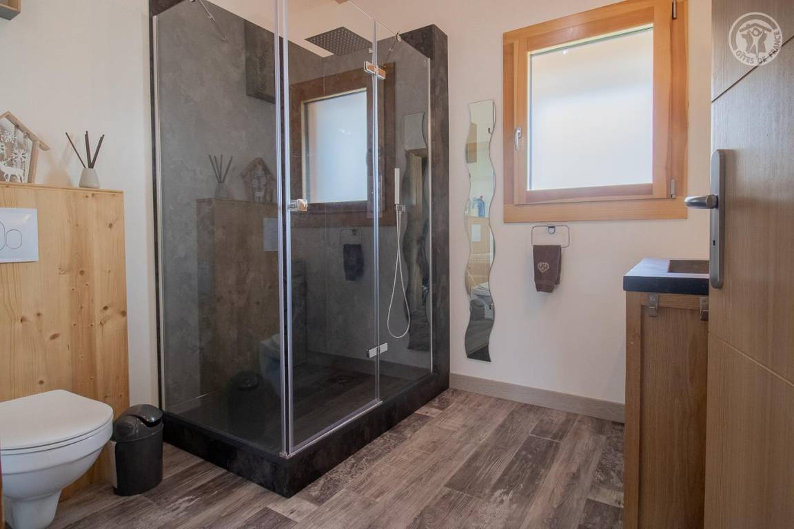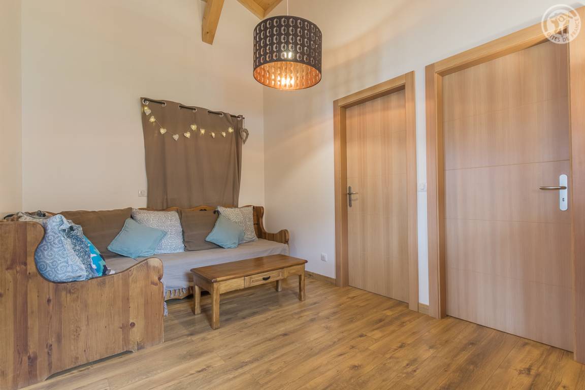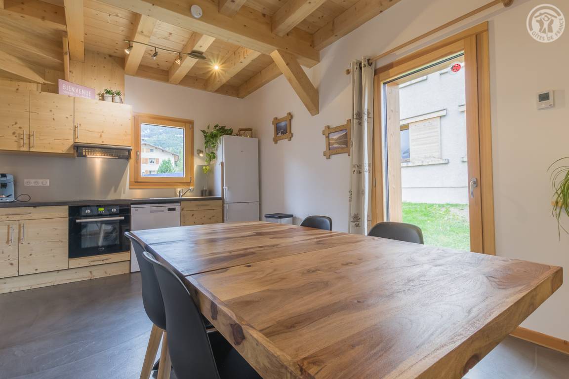Gîte neben dem Haus der Eigentümer mit separatem Zugang und privater Terrasse. Im Erdgeschoss: Küche-Esszimmer mit Zugang zur Terrasse. 1 WC. Oben: Mezzanine, das in einen Entspannungsbereich mit TV umgewandelt wurde. 3 Schlafzimmer: 2 Schlafzimmer mit 1 Doppelbett (140x190cm) + 1 Schlafzimmer mit 2 Etagenbetten. Duschraum (Dusche mit Thermostatventil und Regendusche) mit WC und Waschmaschine. Vermietung von Bettwäsche und Handtüchern. Reinigungsmöglichkeit. Private Parkplätze in der Nähe des Hauses. Skiraum an der Schneefront verfügbar. Kostenloser Shuttle in der Wintersaison.