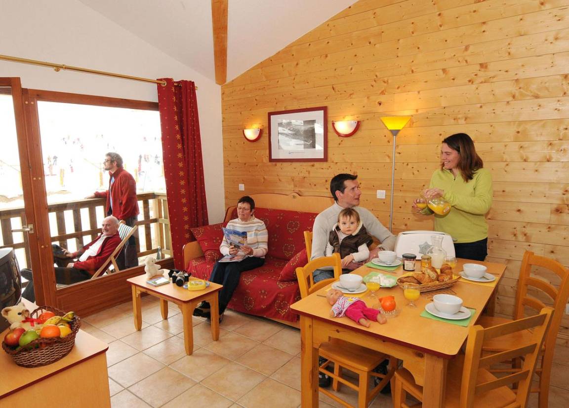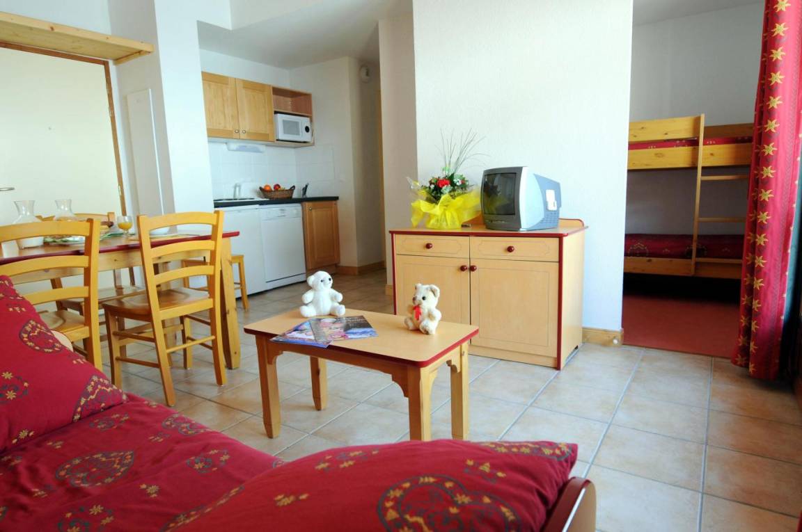 Fläche von ungefähr 35-40 m². Wohnzimmer mit Klappschlafcouch. Schlafzimmer mit Doppelbett. kleines zimmer mit 2 Stockbetten. Kochnische mit Wasserkocher, Kaffeemaschine, Mikrowellengrill, Toaster, Geschirrspülmaschine, 4 elektronische Herdplatten, Kühlschrank. Badezimmer mit Badewanne. separates WC. Balkon mit 2 Liegestühle ODER Terrasse. Die oberen Betten sind nicht für Kinder unter 6 Jahren geeignet.
