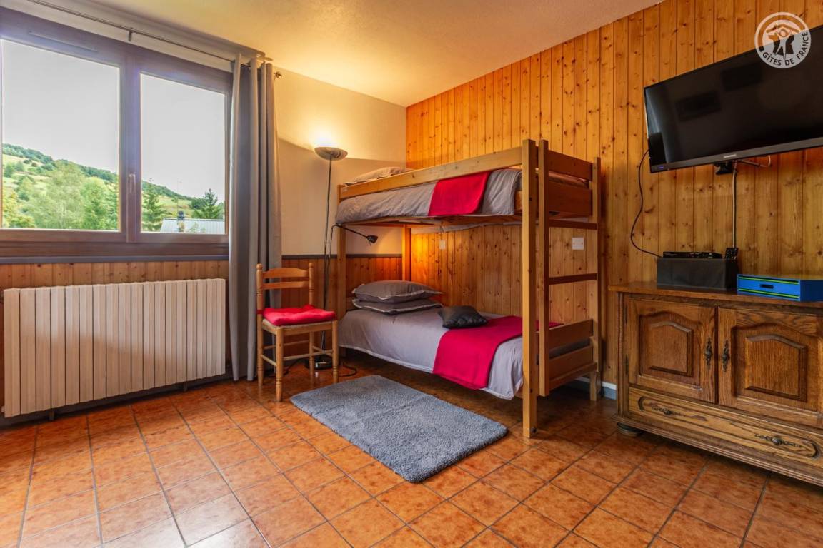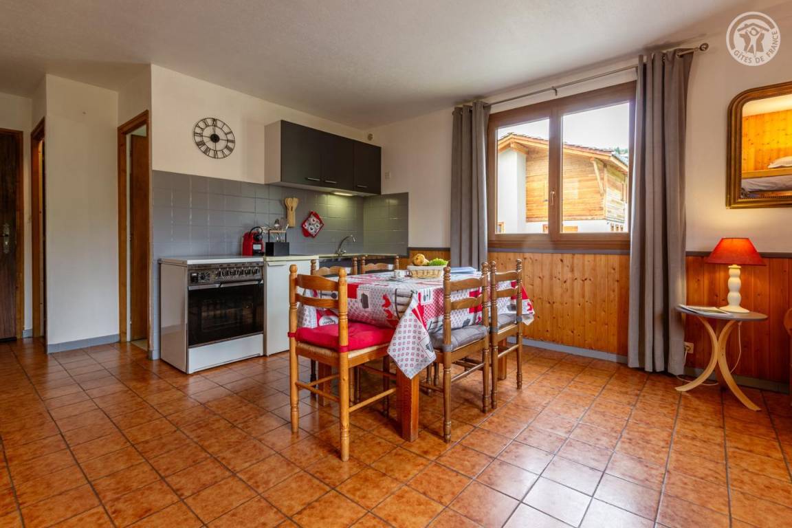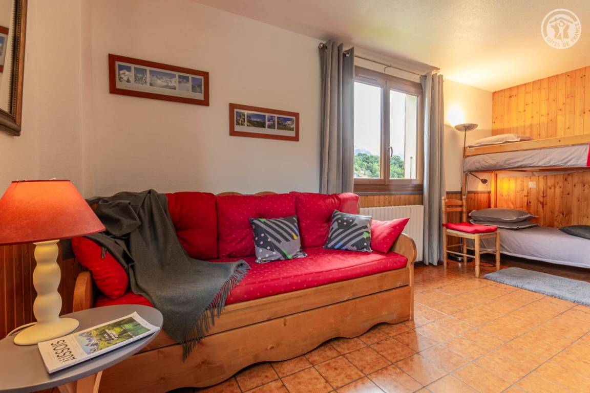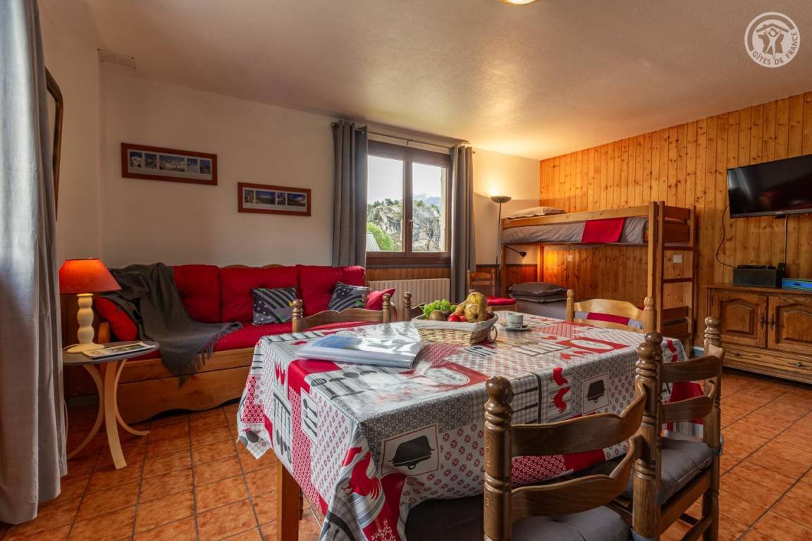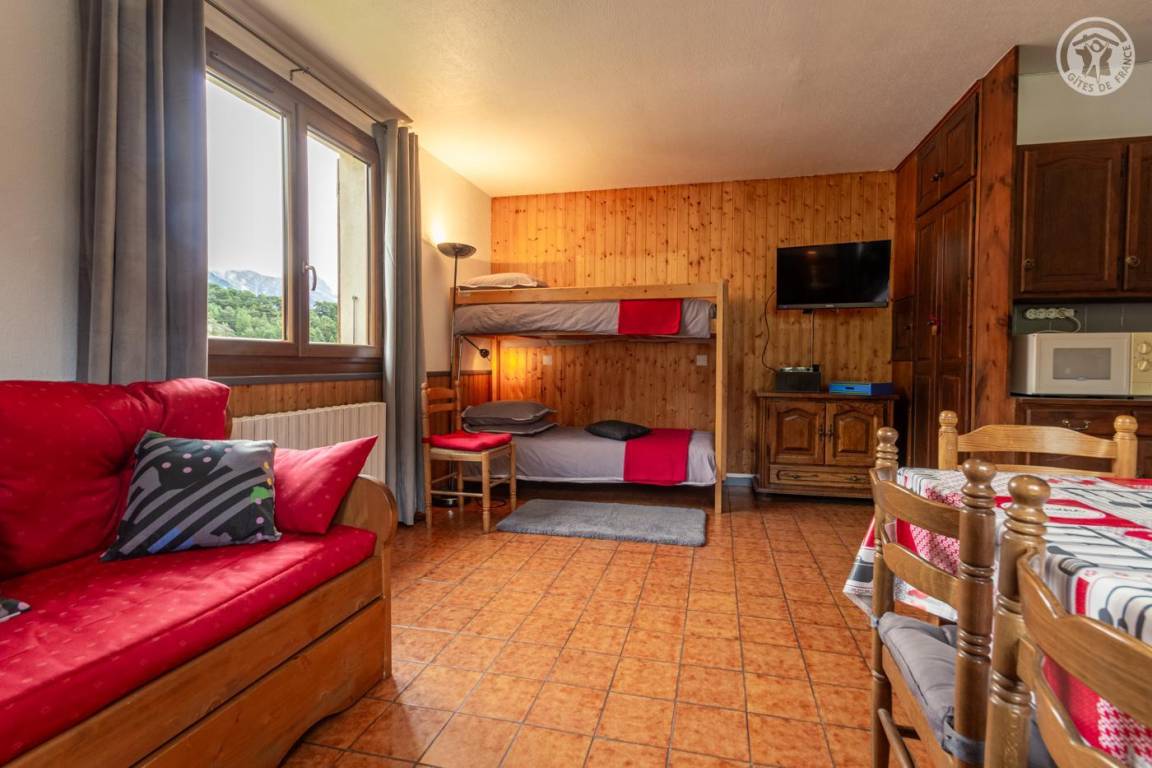 Im 1. Stock eines Hauses mit der Wohnung des Eigentümers und einer weiteren Touristenvermietung. Zugang über eine Innentreppe. Studio bestehend aus einem Wohnzimmer mit Küchenbereich (1 Schlafsofa 140x190 cm + 2 Etagenbetten 90x190 cm), Badezimmer (kleine Badewanne), separates WC. Zugang zum Gemeinschaftsgarten (Schaukel, Trampolin, Grill und Brotbackofen, Kinderhütte) mit Terrasse. Gemeinsamer Ski- und Fahrradraum, Waschküche (gemeinsame Waschmaschine und Trockner). 1 privater Parkplatz vor dem Haus.