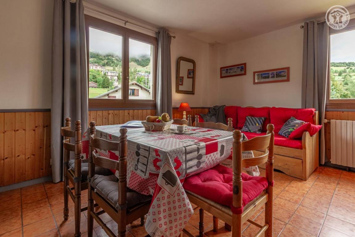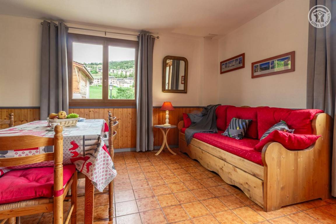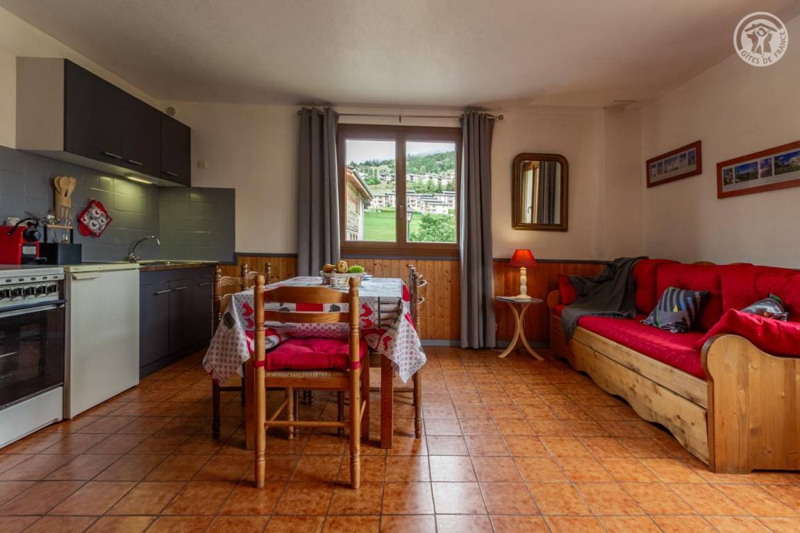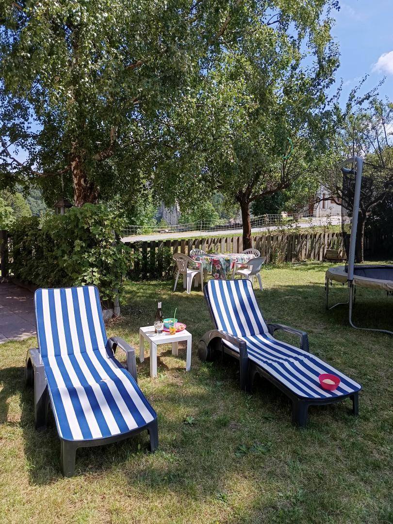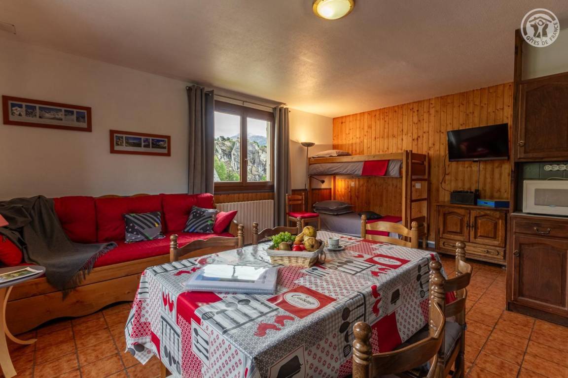Im 1. Stock eines Hauses mit der Wohnung des Eigentümers und einer weiteren Touristenvermietung. Zugang über eine Innentreppe. Studio bestehend aus einem Wohnzimmer mit Küchenbereich (1 Schlafsofa 140x190 cm + 2 Etagenbetten 90x190 cm), Badezimmer (kleine Badewanne), separates WC. Zugang zum Gemeinschaftsgarten (Schaukel, Trampolin, Grill und Brotbackofen, Kinderhütte) mit Terrasse. Gemeinsamer Ski- und Fahrradraum, Waschküche (gemeinsame Waschmaschine und Trockner). 1 privater Parkplatz vor dem Haus.