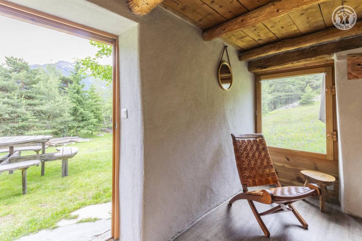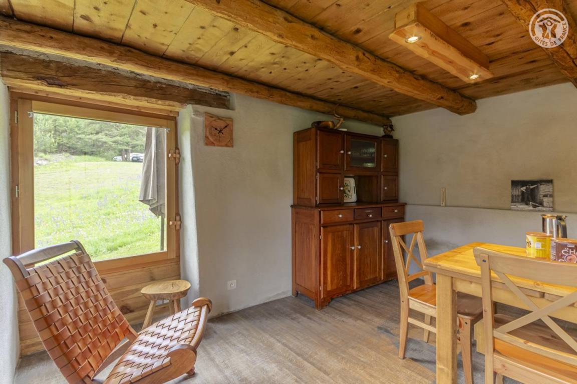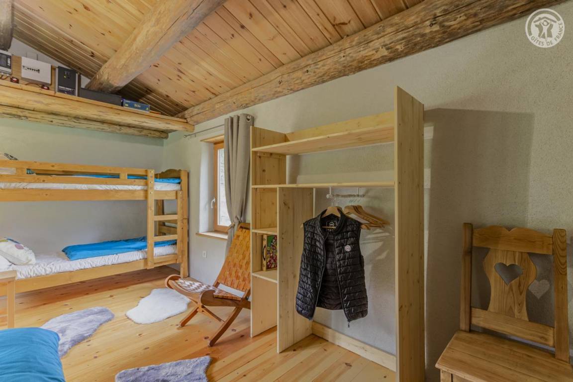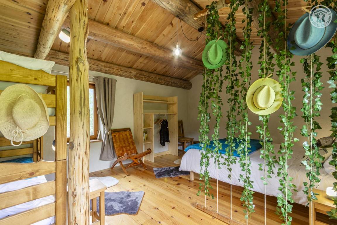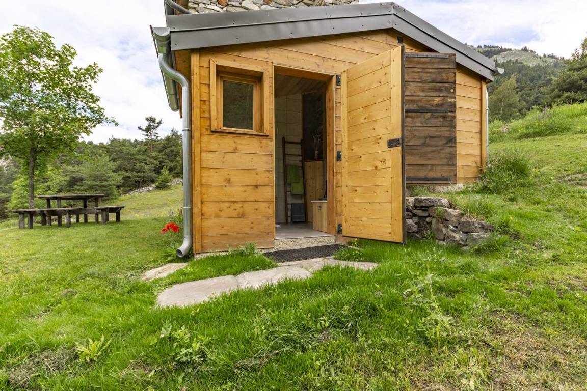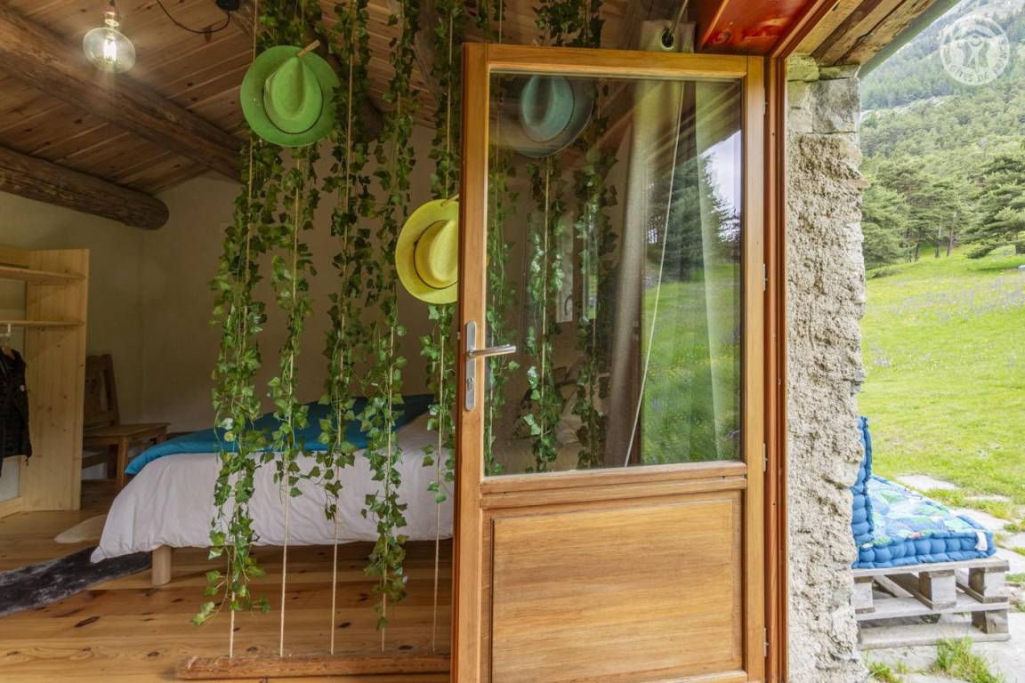 Alpenchalet mit 3 nicht miteinander verbundenen Zimmern, die nur von außen zugänglich sind (keine Innentreppe), verteilt auf 2 Ebenen, darunter auf der Gartenebene Ebene 0: eine Küche (4 Gasbrenner, ein elektrischer Kühlschrank, ein Doppelwaschbecken, ein Holzofen) , ein Badezimmer (Dusche, Waschbecken und Trockentoilette). Erdgeschoss, Ebene 1: ein Schlafzimmer (2 Etagenbetten 80 x 190 cm; 1 Doppelbett 160 x 200 cm – tragbare Leselampen). Großes alpines Gelände mit Grill, Tisch und Liegestühlen