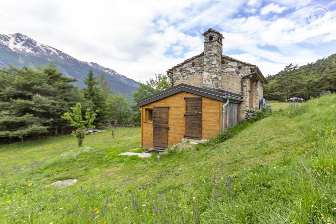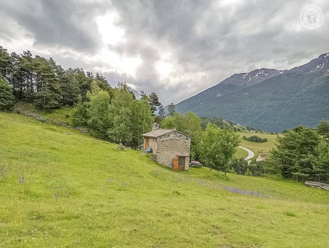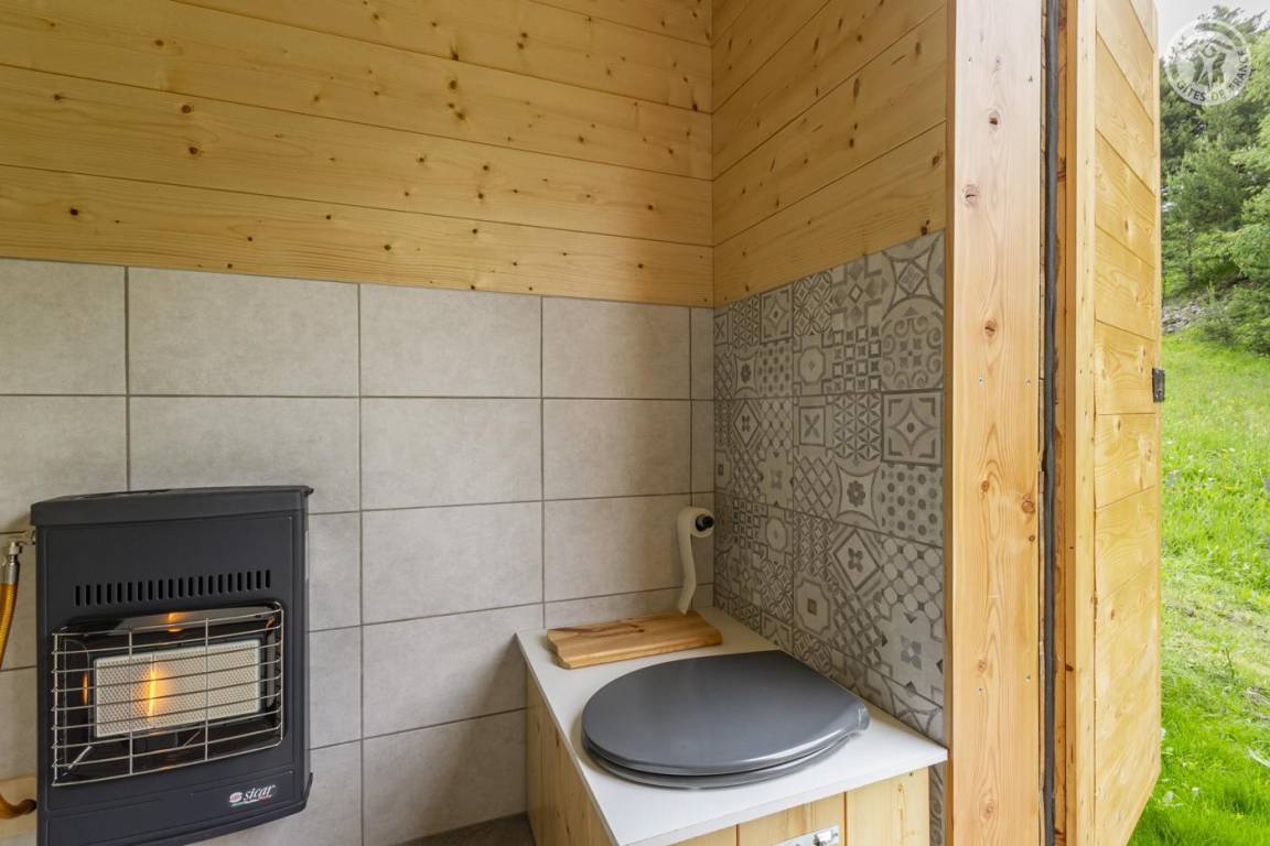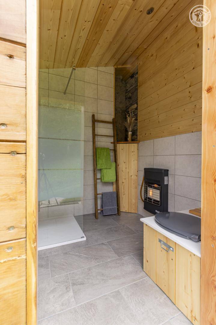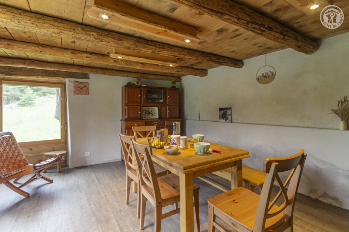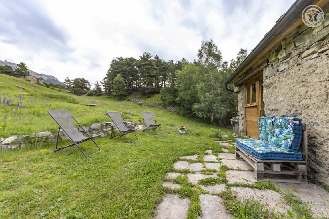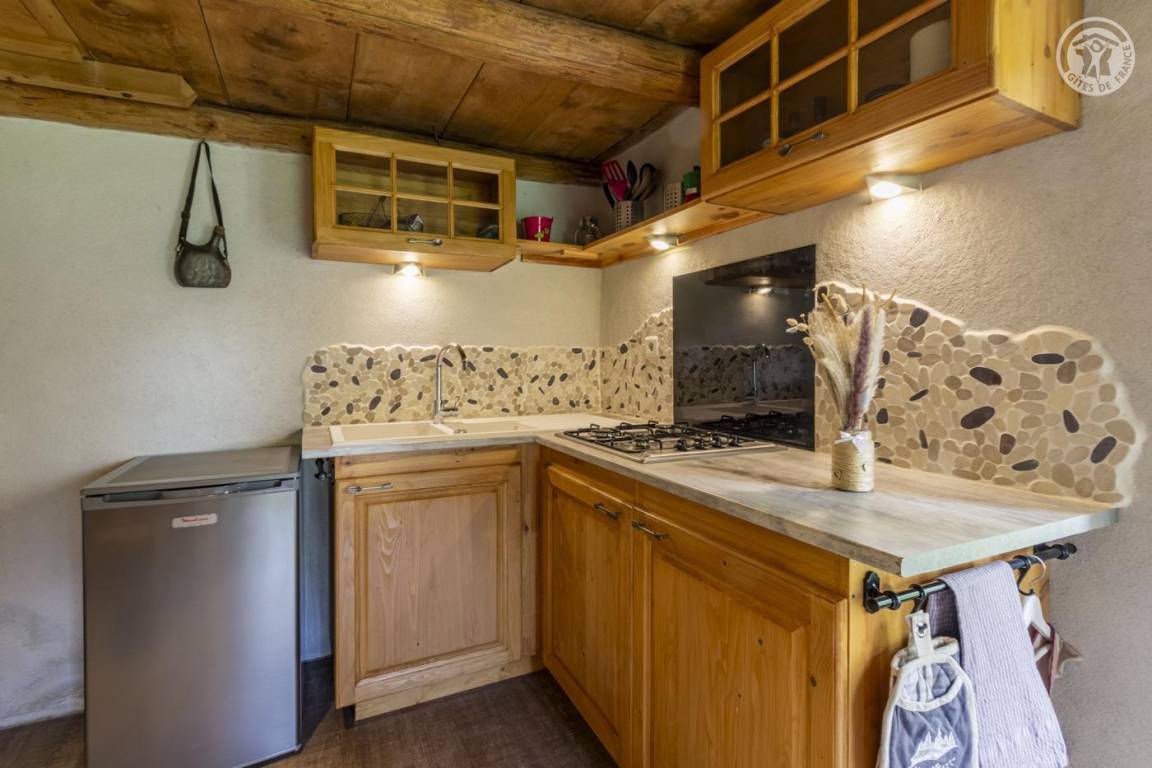 Alpenchalet mit 3 nicht miteinander verbundenen Zimmern, die nur von außen zugänglich sind (keine Innentreppe), verteilt auf 2 Ebenen, darunter auf der Gartenebene Ebene 0: eine Küche (4 Gasbrenner, ein elektrischer Kühlschrank, ein Doppelwaschbecken, ein Holzofen) , ein Badezimmer (Dusche, Waschbecken und Trockentoilette). Erdgeschoss, Ebene 1: ein Schlafzimmer (2 Etagenbetten 80 x 190 cm; 1 Doppelbett 160 x 200 cm – tragbare Leselampen). Großes alpines Gelände mit Grill, Tisch und Liegestühlen