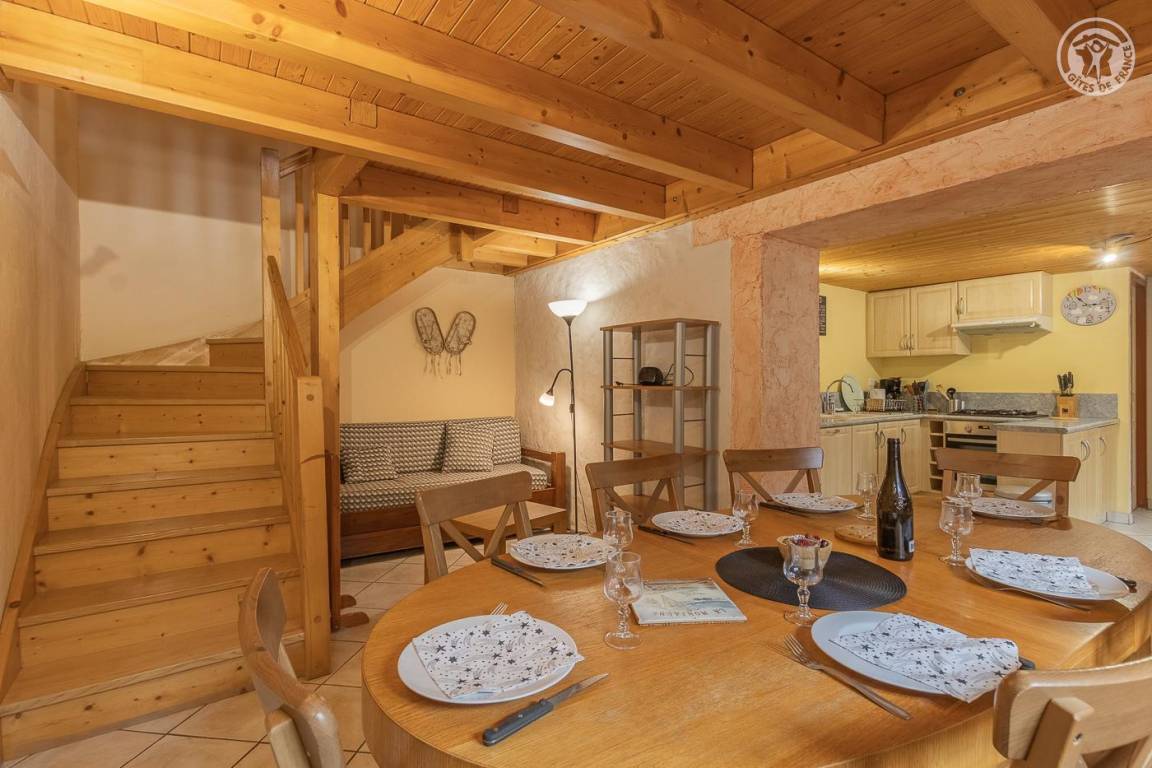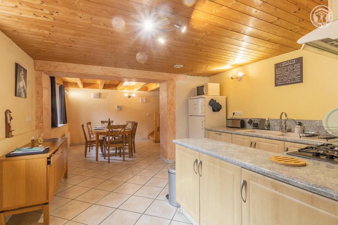 Gite auf 2 Ebenen, bestehend aus im Erdgeschoss: Wohnzimmer-Küchen-Lounge-Bereich, separates WC. 1. Etage: 2 Schlafzimmer (1 Doppelbett 140x190 cm / 1 Doppelbett 140x190 cm; 1 Einzelbett 90x190 cm), Wohnzimmer mit TV und Herd (1 Doppelschlafcouch 140x190 cm), Badezimmer (Dusche, WC). Gemeinsame Waschmaschine in einem Raum im Eingangsbereich. Gemeinsamer Außenbereich (Tisch und Stühle pro Ferienhaus).