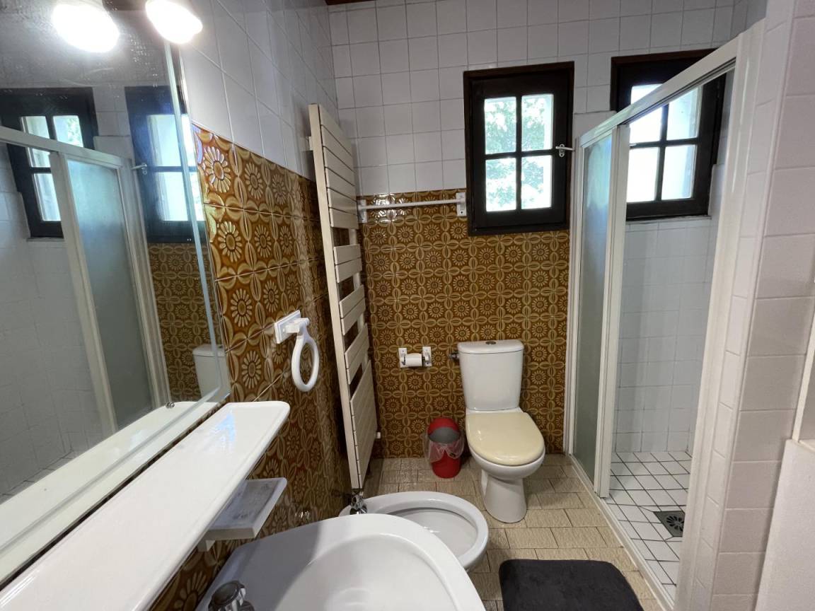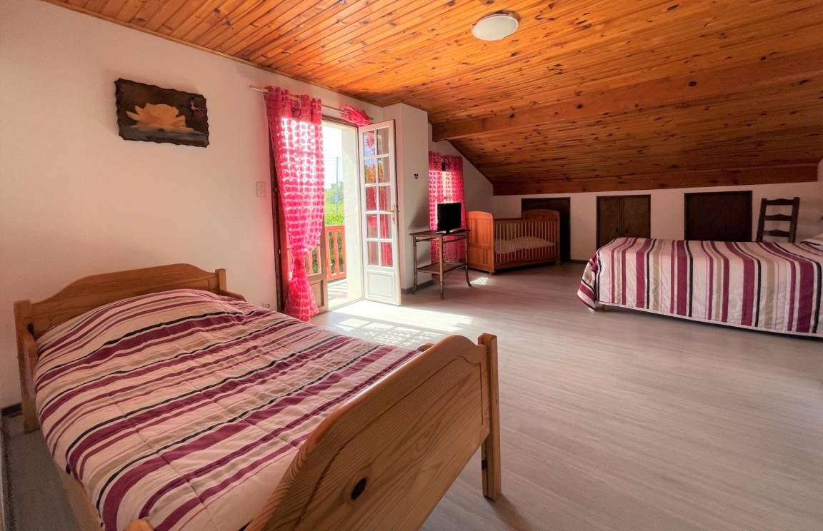 1. Ebene. 1 Schlafzimmer (1 Doppelbett. 1 Einzelbett. 1 Kinderbett)/Balkon und Außenausgang zum Garten (Treppe). Privates Badezimmer und WC in diesem Schlafzimmer.
