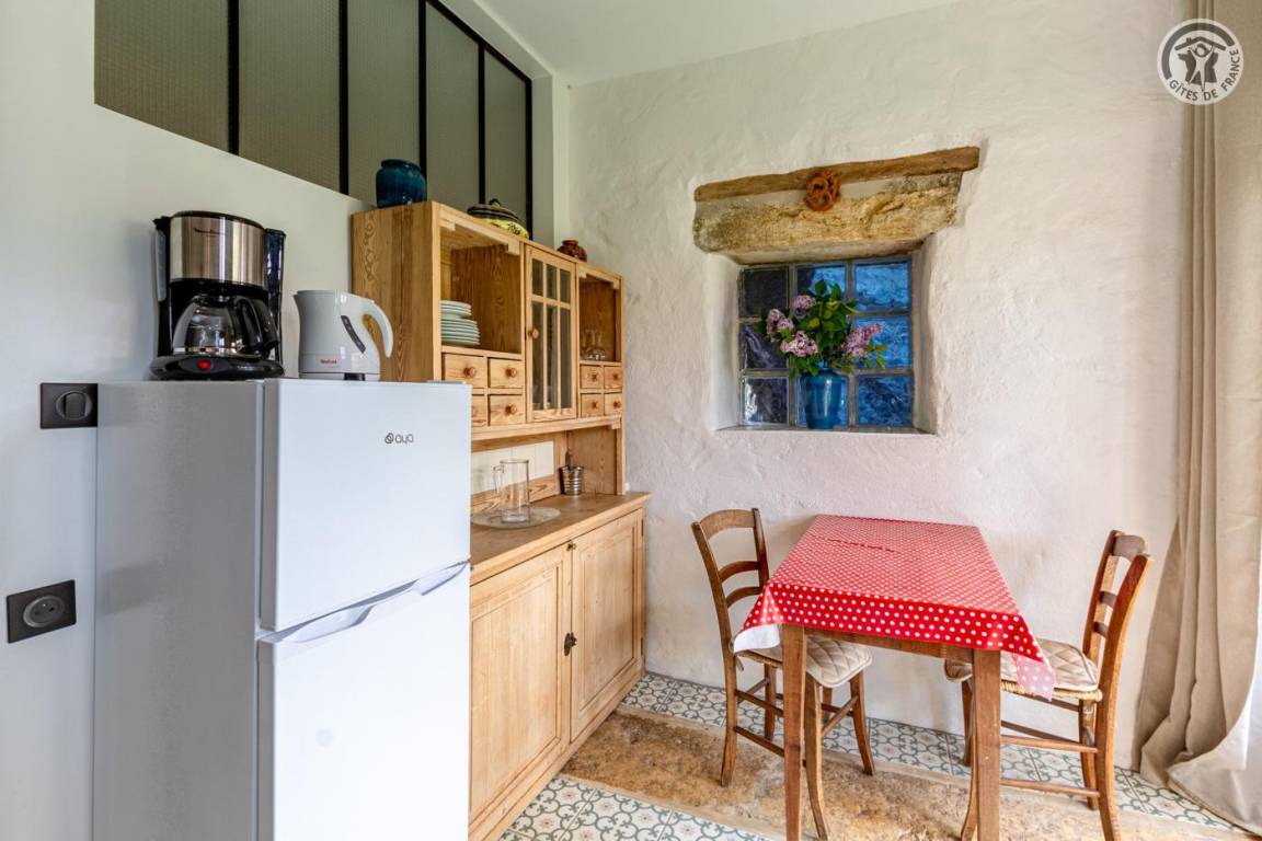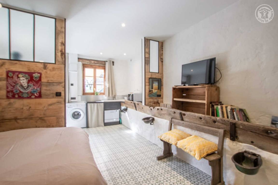 Gite im Erdgeschoss des Hauses des Eigentümers mit separatem Zugang: Studio mit Küchenbereich (kombinierter Mikrowellenherd), Entspannungsbereich mit Doppelbett 160 x 200 cm mit Sessel, Fernseher (Canal Plus und CanalSat), Badezimmer (Dusche u TOILETTE). Private schattige Terrasse, flaches Grundstück von 2500 m². Wohnzimmer im alten Brotbackofen mit TV, Kühlschrank, Backofen, Kochplatten und Grill. Privater Parkplatz am Eingang des Grundstücks.