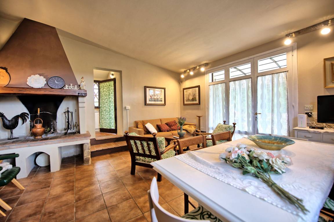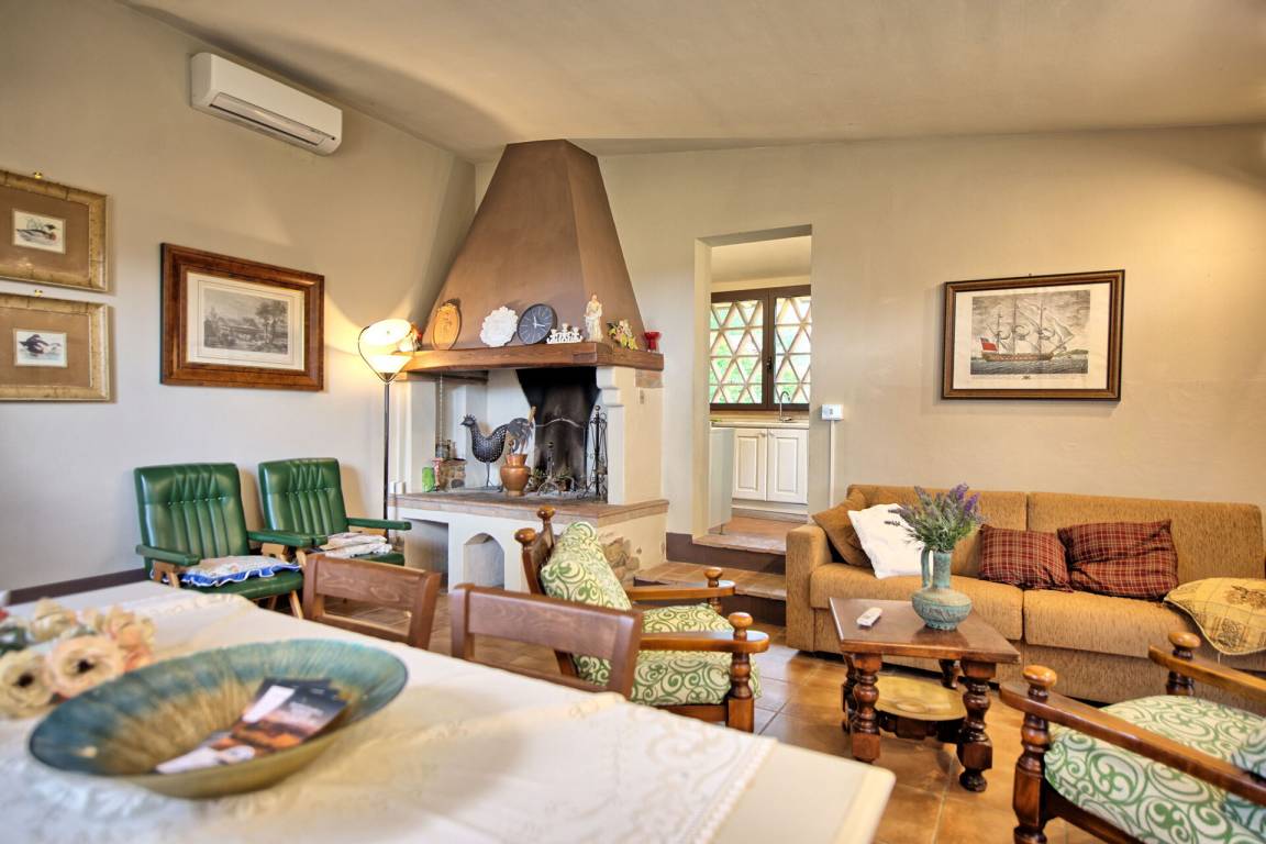 2 Stufen tiefer(von der Küche oder vom Doppelzimmer aus): Wohnzimmer mit Sesseln (Klimaanlage und TV) mit Kamin, Essbereich und direkter Zugang nach draußen.