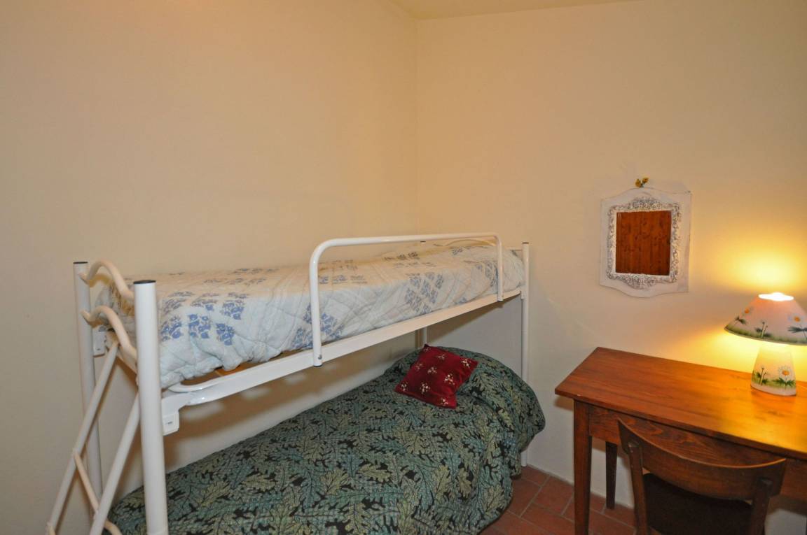 Erdgeschoss :Eingang zur Küche (Klimaanlage, Backofen, Gefrierschrank, Spülmaschiene), Doppelzimmer mit Etagenbett.