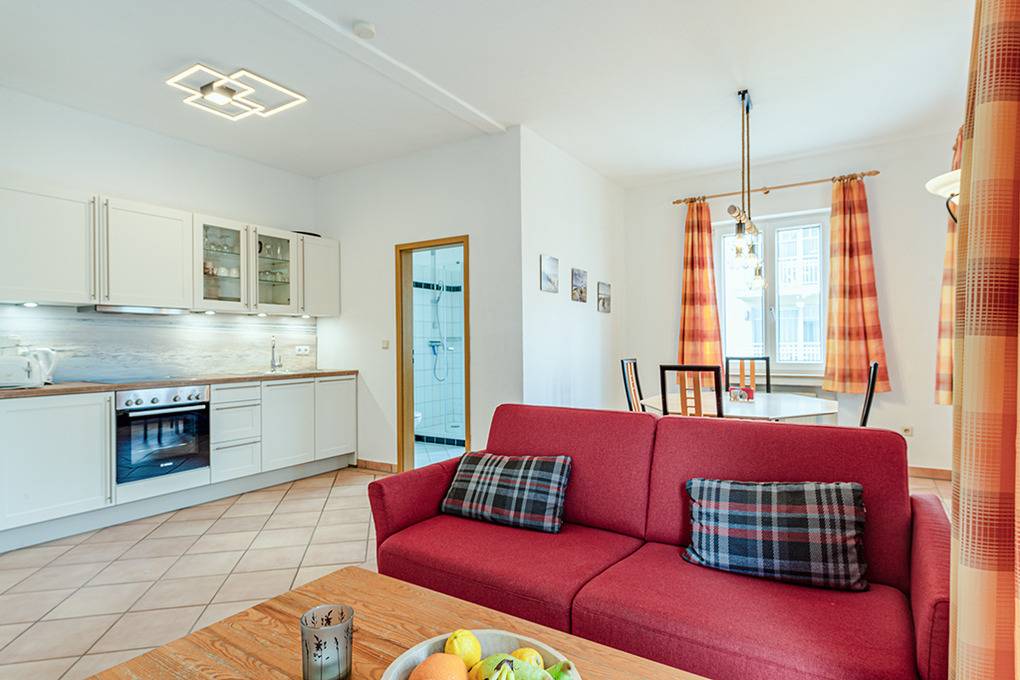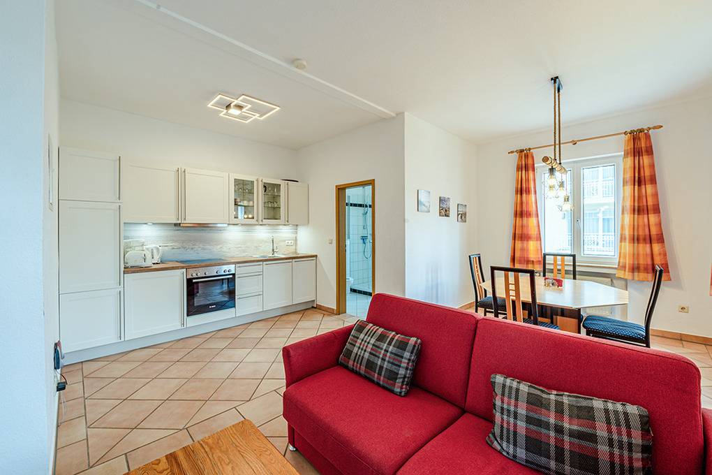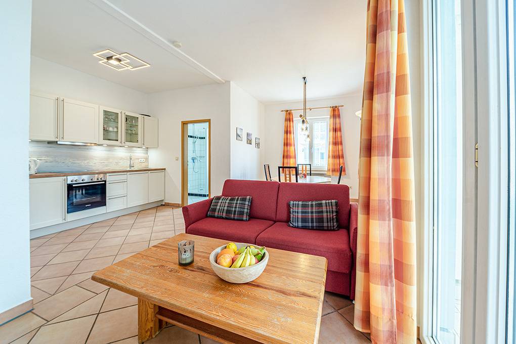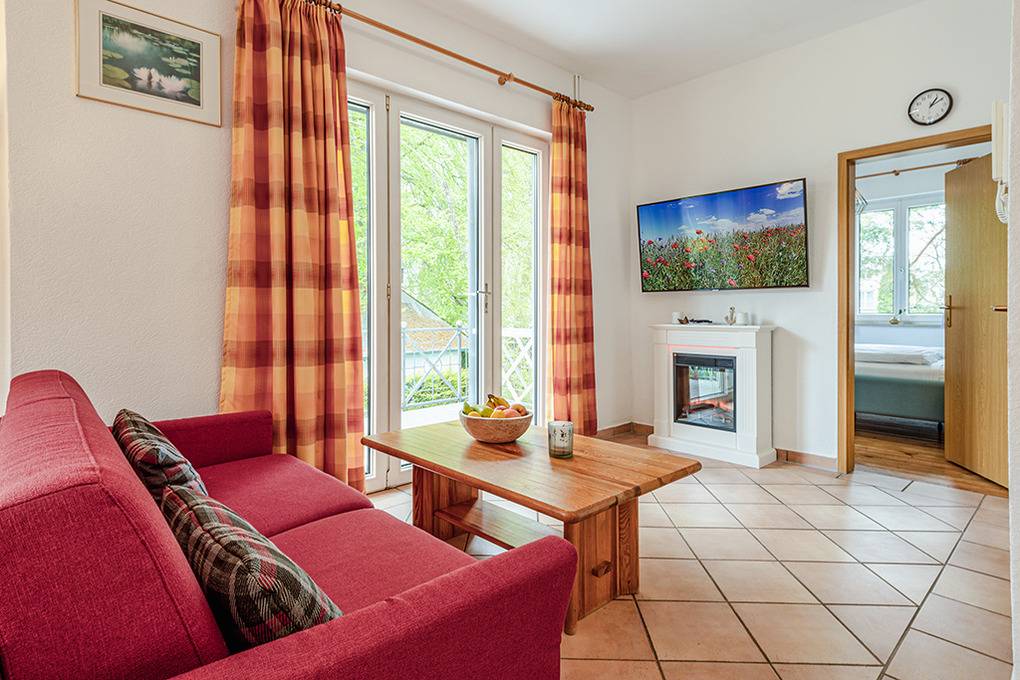 D 92.4 Wohnung 2-4 Pers.: Schöne 3-Zimmerwohnung mit 46 qm Wohnfläche, 1. Etage. Schöner Wohnraum mit E-Kamin, Sat-TV, Esstisch, moderner Küchenzeile (Backofen, Spülmaschine). Doppelzimmer. Doppelzimmer mit franz. Bett, Sat-TV. Bad/WC. Balkon mit Sitzmöbeln.