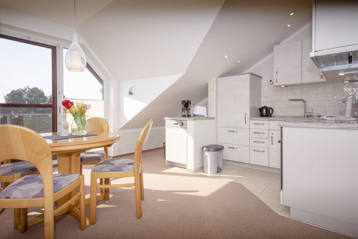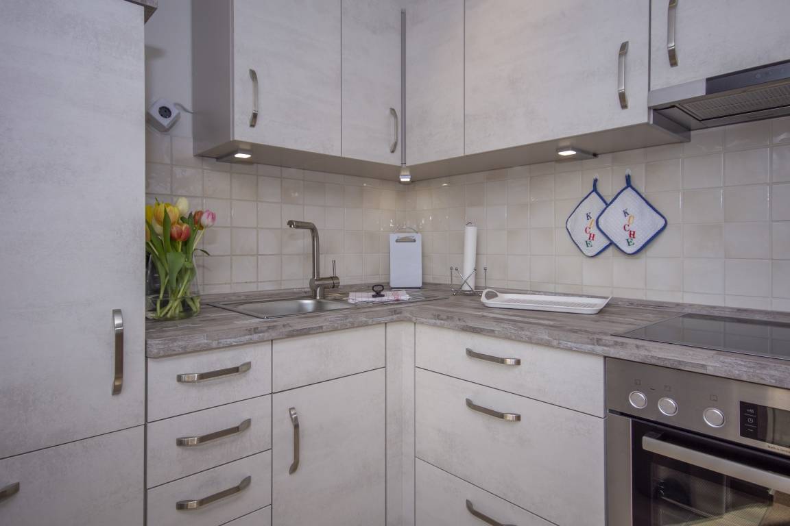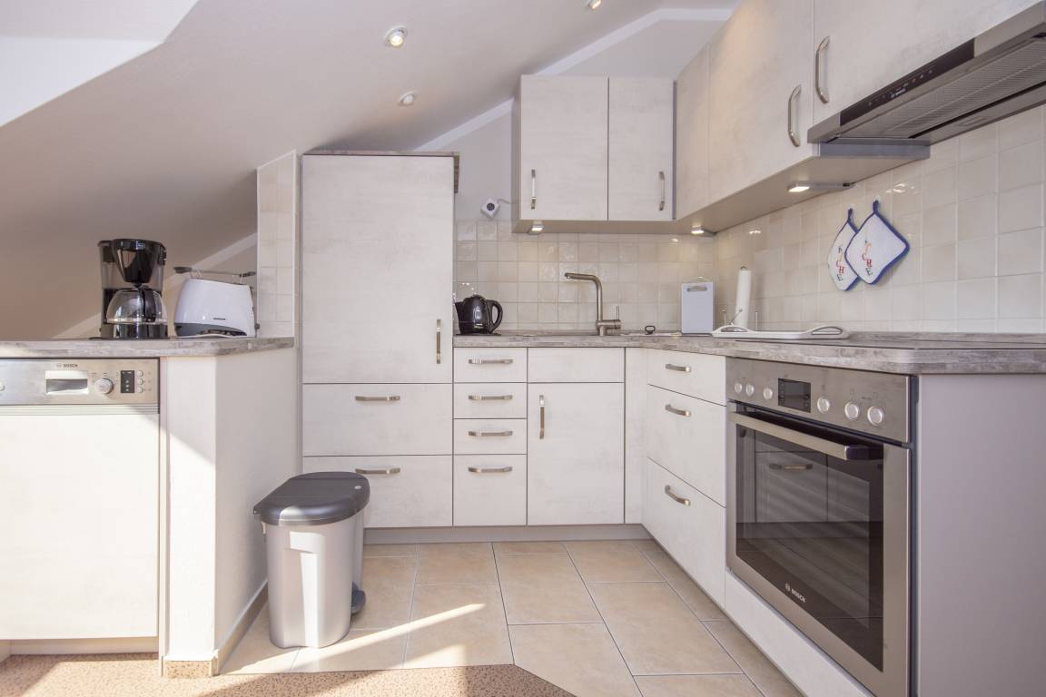 In der Wohnung befindet sich eine offene, voll ausgestattete Küche mit Spülmaschine, Herd, Cerankochfeld und Mikrowelle. Zahlreiche Küchenutensilien eröffnen Ihnen die Möglichkeit, einen kulinarischen Kochabend zu verleben.