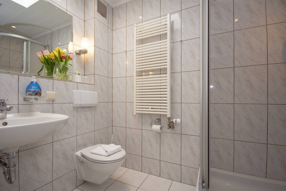 Das Badezimmer verfügt über eine Dusche, WC und einen Waschtisch mit großen Spiegel.