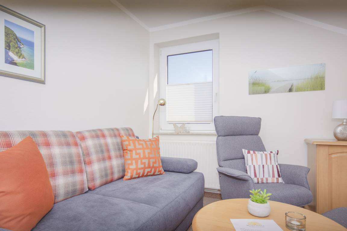 Der freundliche Wohnbereich bietet einen gemütlichen Ort zum Ausklingen der erlebnisreichen Tage auf Rügen. Hier befindet sich neben einem modernen Flachbild-TV auch eine außerordentlich komfortable Couchgarnitur, die eine optionale Aufbettung für bis zu 2 weitere Personen darstellt. Von diesem Zimmer erhalten Sie einen direkten Zugang auf den Balkon, welcher mit komfortablen Balkonmöbeln ausgestattet ist. Hier können Sie nach einem erlebnisreichen Strandtag in Baabe einfach mal die Seele baumeln lassen.
