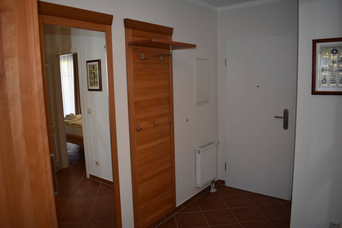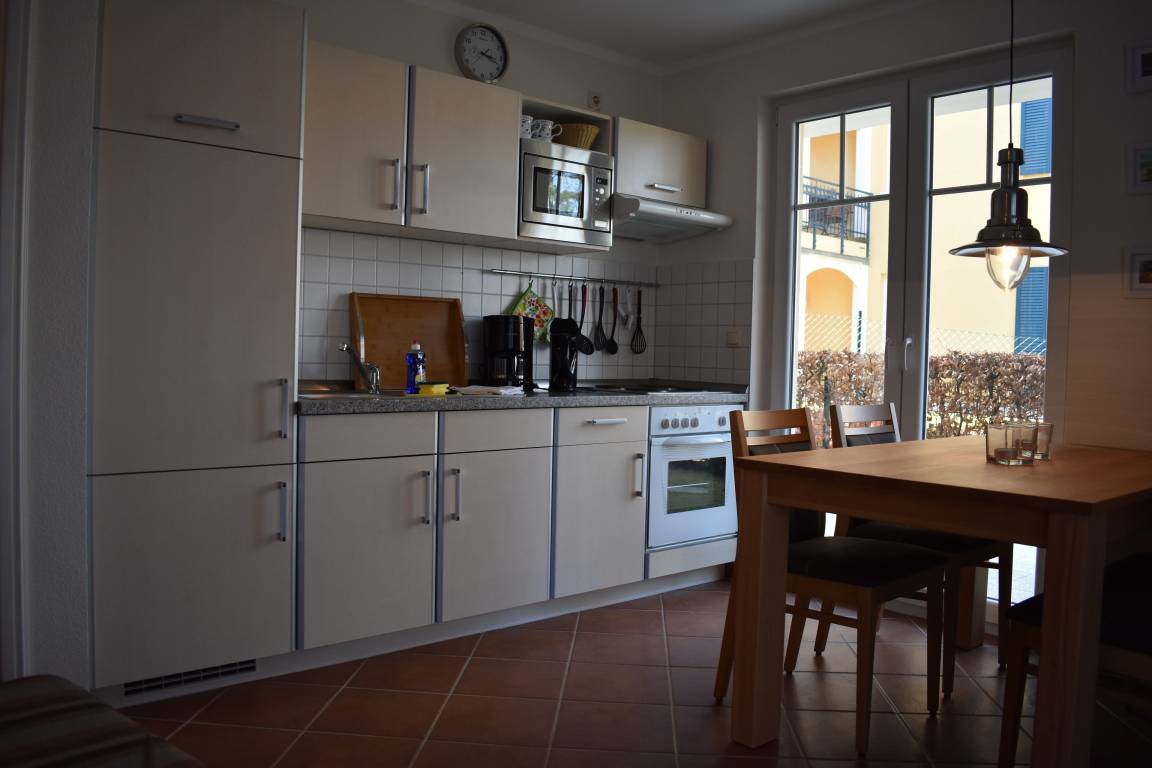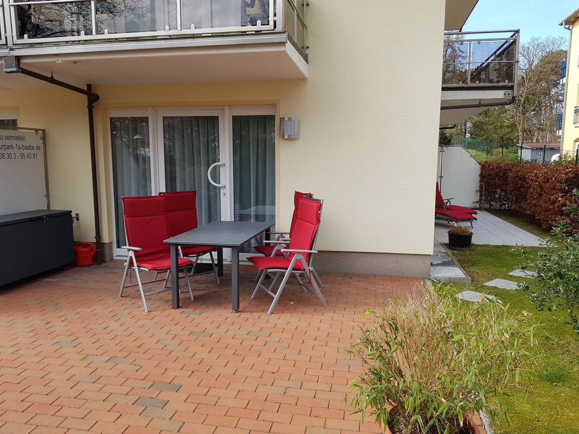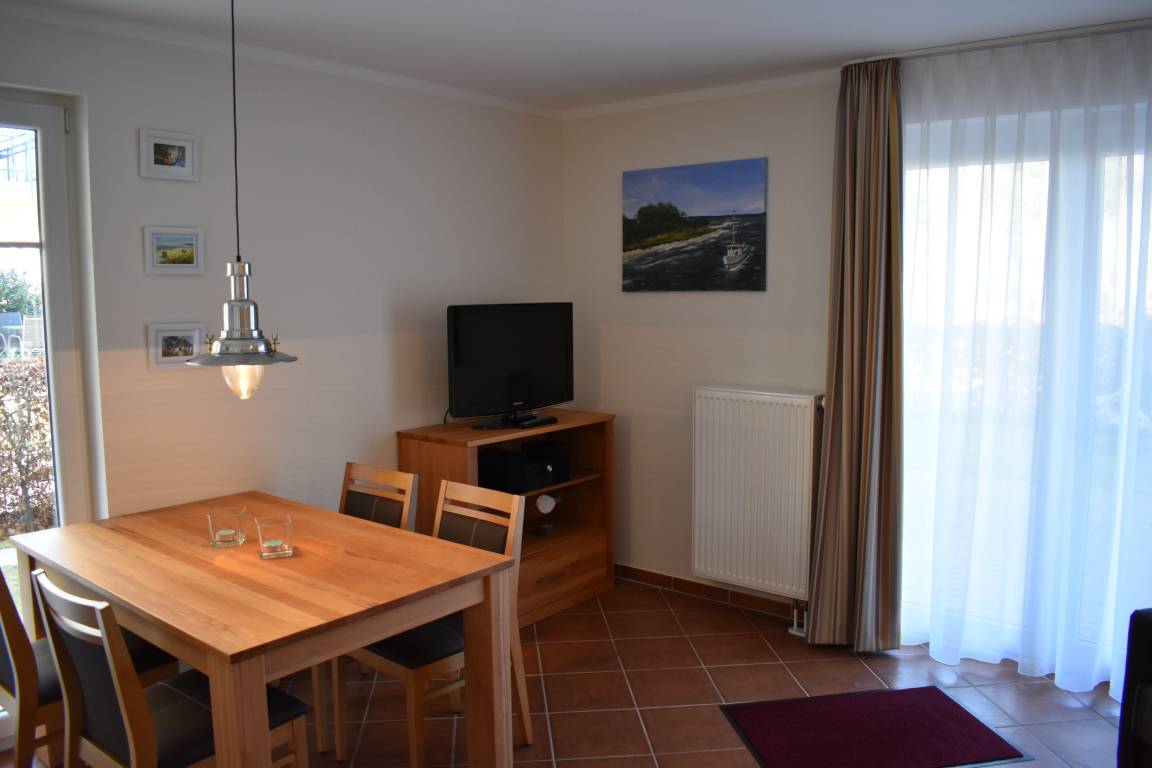 Die Wohnung ist für zwei Personen ideal. Hier werden Sie sich wohl fühlen. Das Wohnzimmer mit Küchenzeile und großem Esstisch ist mit einer gemütlichen Sitzecke mit Sessel und Sofa ausgestattet. Das Sofa kann man leicht zu einem Doppelbett umwandeln. Es steht ein großer Flachbild-TV und eine Musikanlage zur Verfügung. Das Schlafzimmer ist mit einem Doppelbett, einem Kleiderschrank und einem zweiten TV ausgestattet. Weitere Abstellmöglichkeiten gibt es auf dem großen Flur. Die Wohnung ist hochwertig und gemütlich möbliert. Das Bad ist zweckmäßig und modern ausgestattet. Auf der zur Ostseeseite befindlichen Terrasse findet man eine Sitzgarnitur und Sonnenliegen.