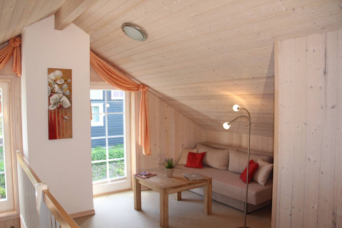 Große Fenster ermöglichen viel Tageslicht. Fußboden - Gaszentralheizung und Kaminofen sorgen auch im Winter für ein „Wohlfühlklima". Waschmaschine, Geschirrspüler, Mikrowelle, Kaffeemaschine, Toaster, die Küche ist voll eingerichtet. Kabelfernsehen, HD – fähige Flatscreen, DVD, CD, I – Pod Dockingstation, freier Internetzugang - alles was das tägliche Leben so angenehm macht, ist vorhanden. Drei Schlafzimmer – zwei im Obergeschoss (eins mit zusätzlichem LCD - Fernseher) und eins im Erdgeschoss bieten Platz für 6 Personen. Auf der Galerie steht ein gemütliches Schlafsofa. Dort gibt es Platz für zwei weitere Personen. Ein weiteres Duschbad im Obergeschoss rundet den "Luxus" ab. Im Untergeschoss finden Sie eine offene Küche mit großem Tisch für acht Personen, einen gemütlichen Wohnbereich mit Kaminofen und ein Wellnessbad mit Whirlpool, Dusche, Waschtrockner und Sauna. Im Außenbereich befindet sich eine große Terrasse mit Tisch, Stühlen, zwei Sonnenliegen und Sonnenschirm.