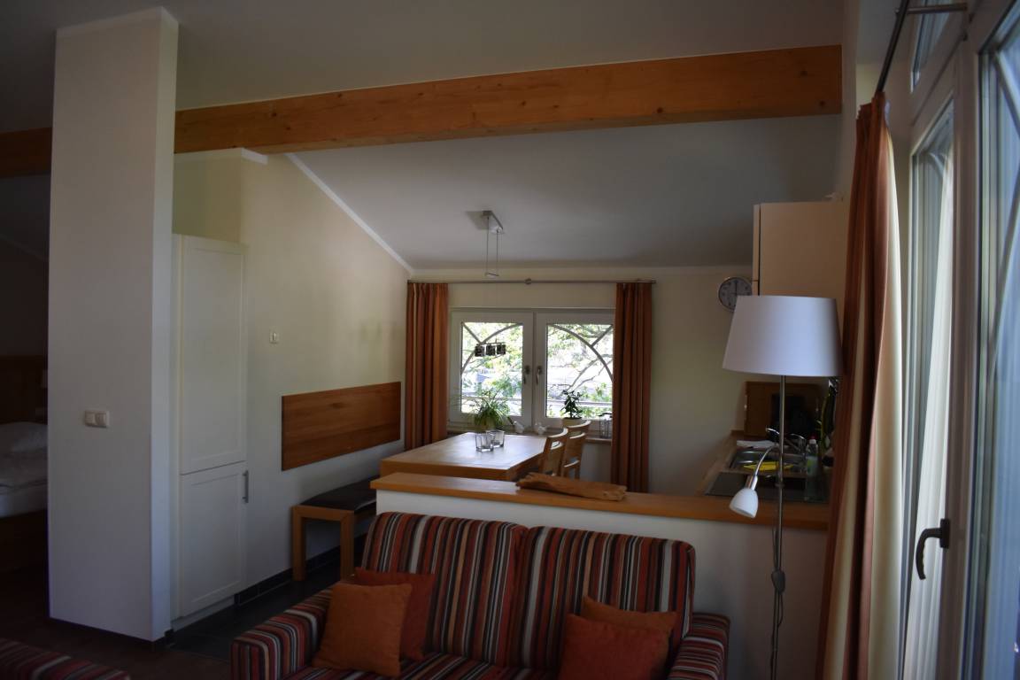 Die Studio-Wohnung mit offen abgeteilten Elternschlafzimmer ist etwa 60qm groß. Die Wohnung verfügt über zwei Schlafzimmer und einem Wohnzimmer. Sie ist für vier Personen ideal. Hier werden Sie sich sehr wohl fühlen. Weiterhin ist die Wohnung mit einem Duschbad und einer gemütlichen Küche ausgestattet. Das Wohnzimmer ist mit einem riesigen Terrassenfenster ausgestattet.