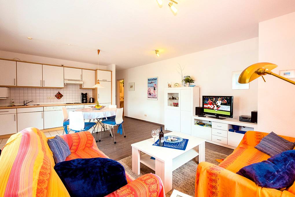D 92.11A Wohnung 2-4 Pers.: 2-Zimmerwohnung mit 56 qm Wohnfläche, 1. Etage. Großer Wohn-/Essraum mit Sitzgarnitur (Ausziehcouch 2 Pers.), Flachbild-Sat-TV, Stereoanlage, Esstisch, moderner Einbauküche (Backofen, Mikrowelle, Spülmaschine). Doppelzimmer. Bad/WC. Sehr großer Balkon (30 qm) mit Sitzmöbeln.